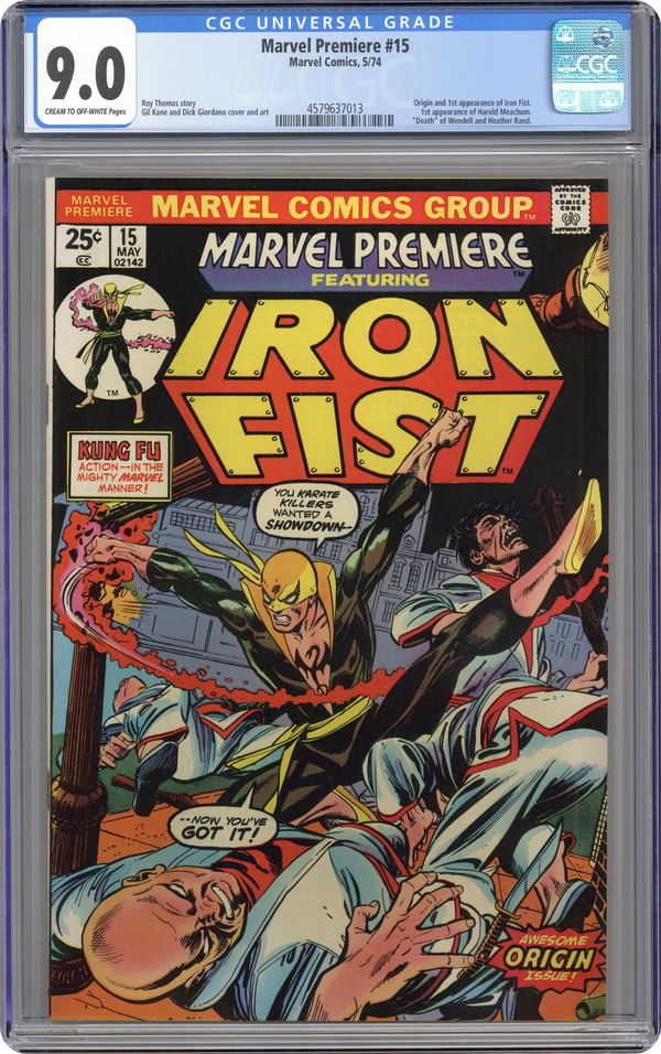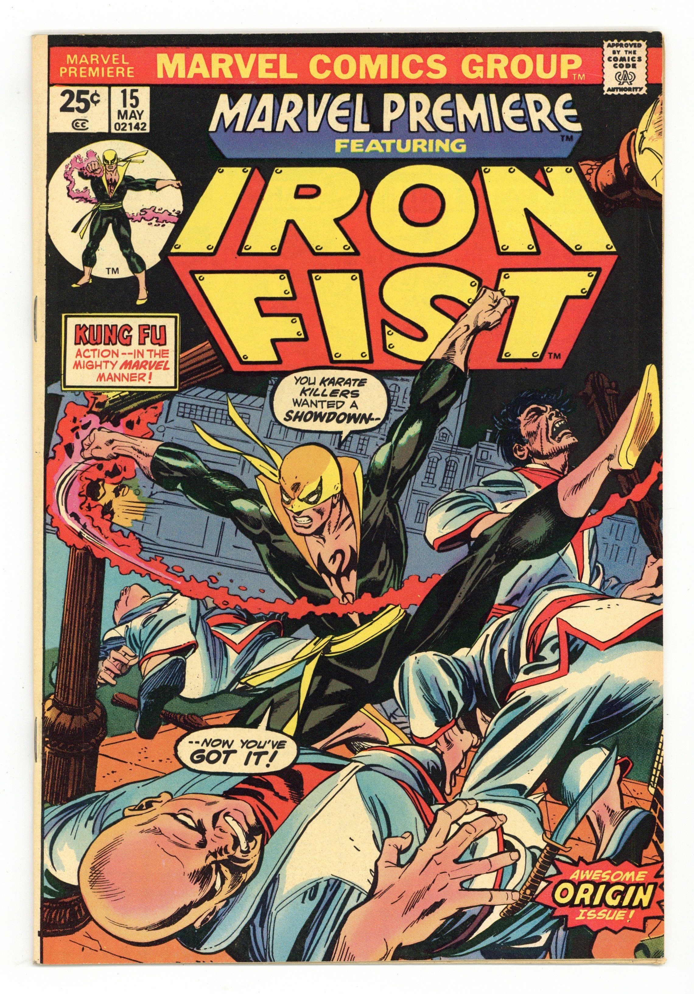 First 25-cent cover price. Origin and first appearance of Iron Fist in The Fury of Iron Fist!, script by Roy Thomas, pencils by Gil Kane, inks by Dick Giordano; Iron Fist passes the final tests in his K'un-Lun training and is granted the privilege of immortality if he so chooses; During his final battle with the robot Shu-Hu, Danny remembers how his father was killed by Meachum and his mother gave her life to save his as the Rand family searched for the fabled city of K'un-Lun. The letters page contains Marvel Value Stamp series A # 94 (Electro by Steve Ditko). Text article explaining price hike to 25 cents for Marvel's 36-page comics, followed by short editorial by Roy Thomas detailing genesis of Iron Fist. 36 pgs. $0.25. Cover price $0.25.
