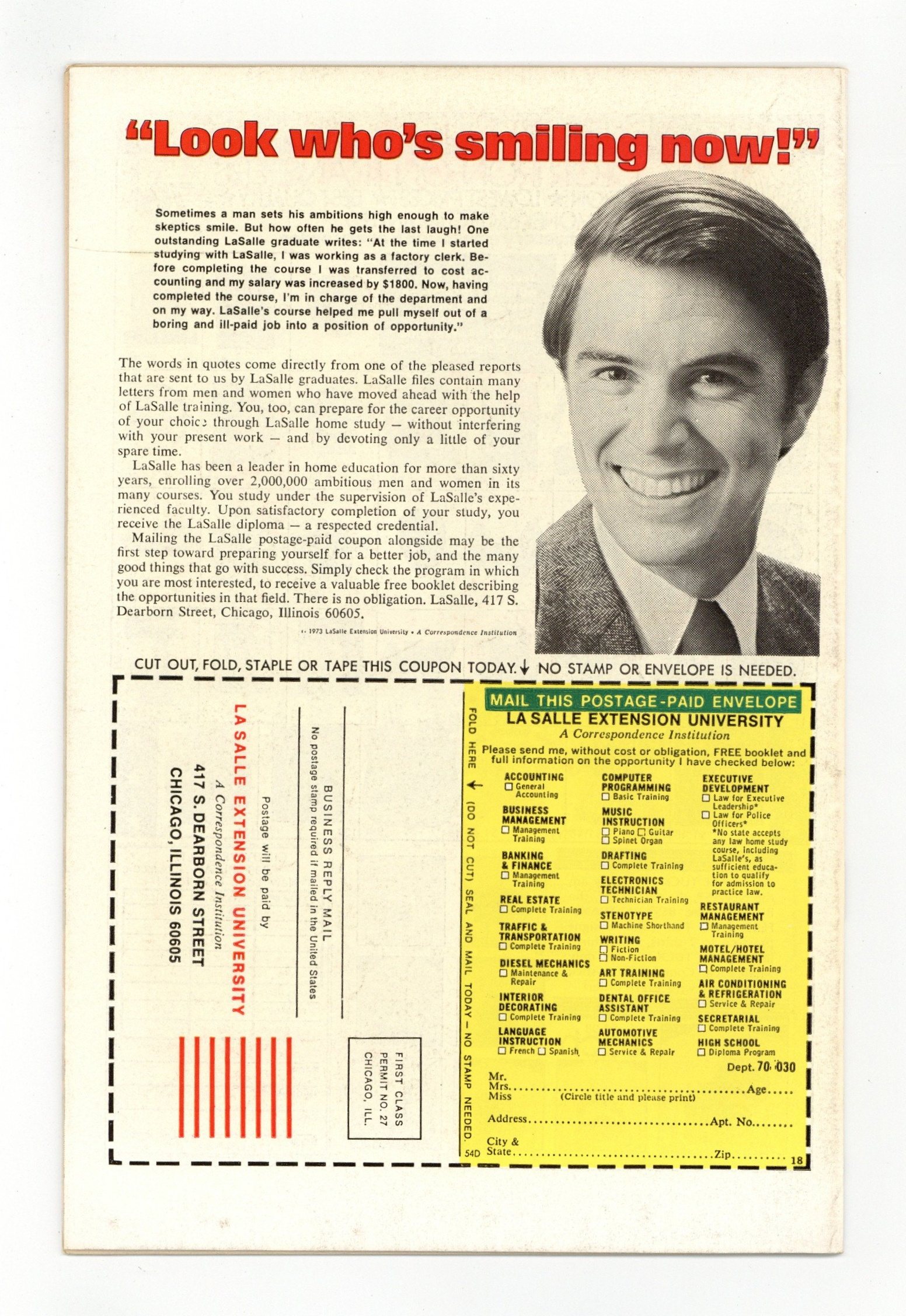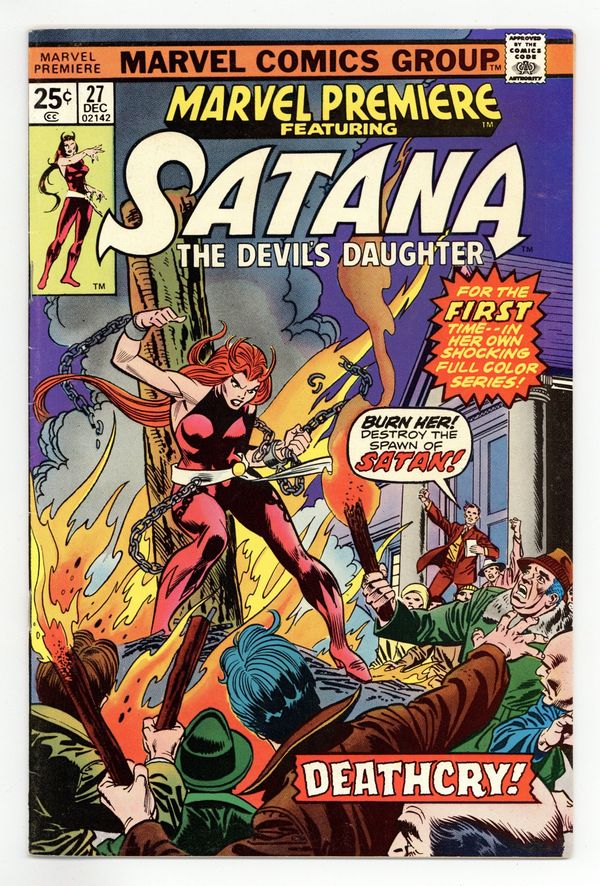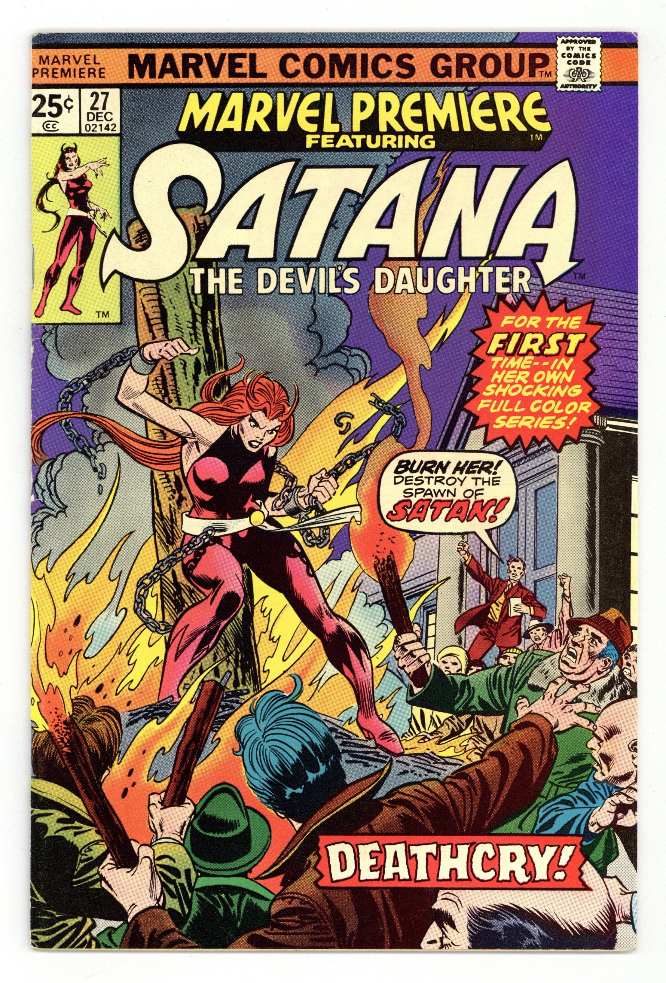 "Deathsong" Chris Claremont script. Art by The Tribe and Janice Cohen. First full-color solo story featuring Satana. While traveling through California, Satana encounters a young woman who's being chased by a mob claiming she's a witch. However, Satana gets more than she bargained for after she has the woman freed. Also included is a back-up reprint story of Satana's first appearance from Vampire Tales #2. 32 pgs. Full color. 25 cent cover price. Cover price $0.25.
