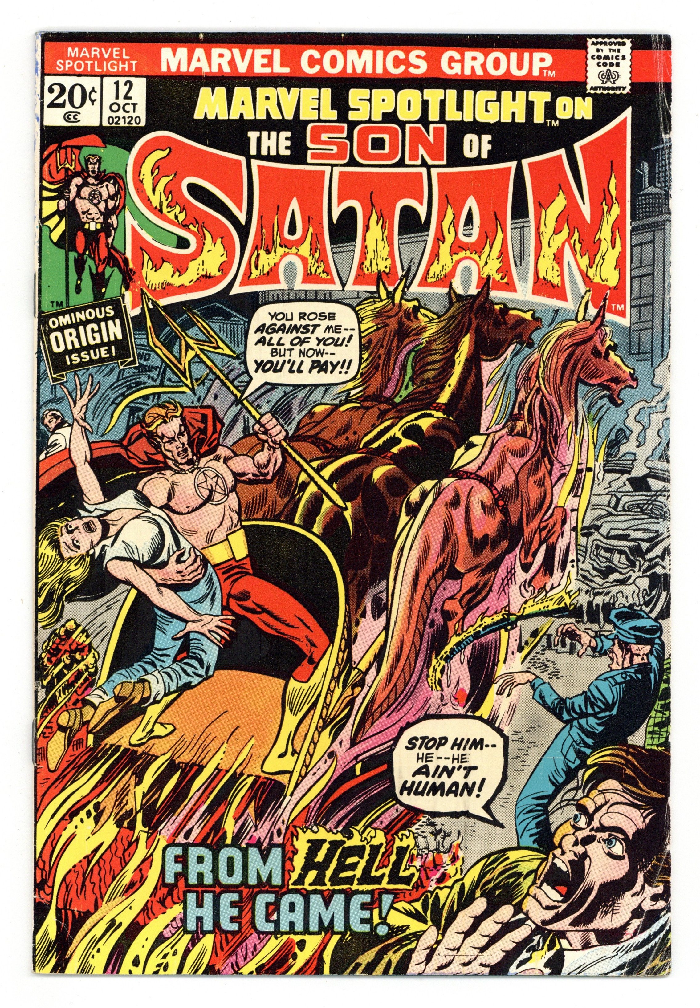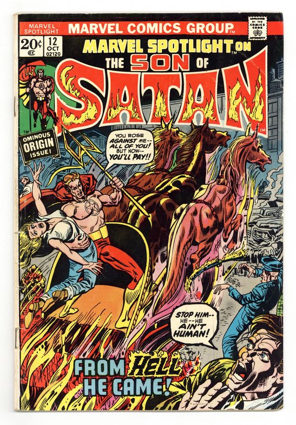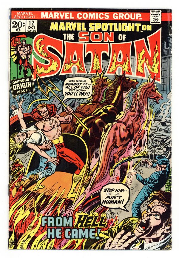 Cover pencils by Herb Trimpe. The Son of Satan, script by Gary Friedrich, pencils by Herb Trimpe, inks by Frank Chiaramonte; Sam Silvercloud and Snake free Daimon Hellstrom from his self-imposed emprisonment; Son of Satan seeks out Witch Woman and Ghost Rider and is attacked by his fathers minions; Origin and second appearance of The Son of Satan! (First appearance of Daimon Hellstrom is Ghost Rider 2.) Story continued from Ghost Rider (1973 series) #2. 36 pages, full color. Cover price $0.20.