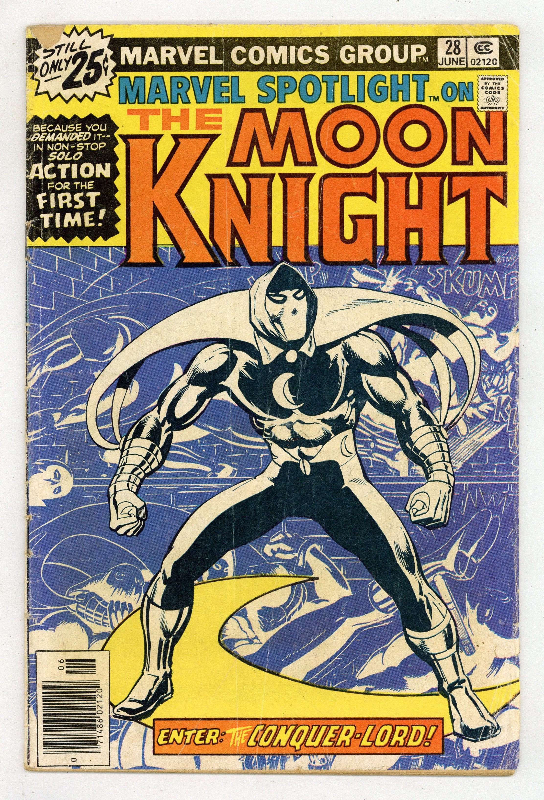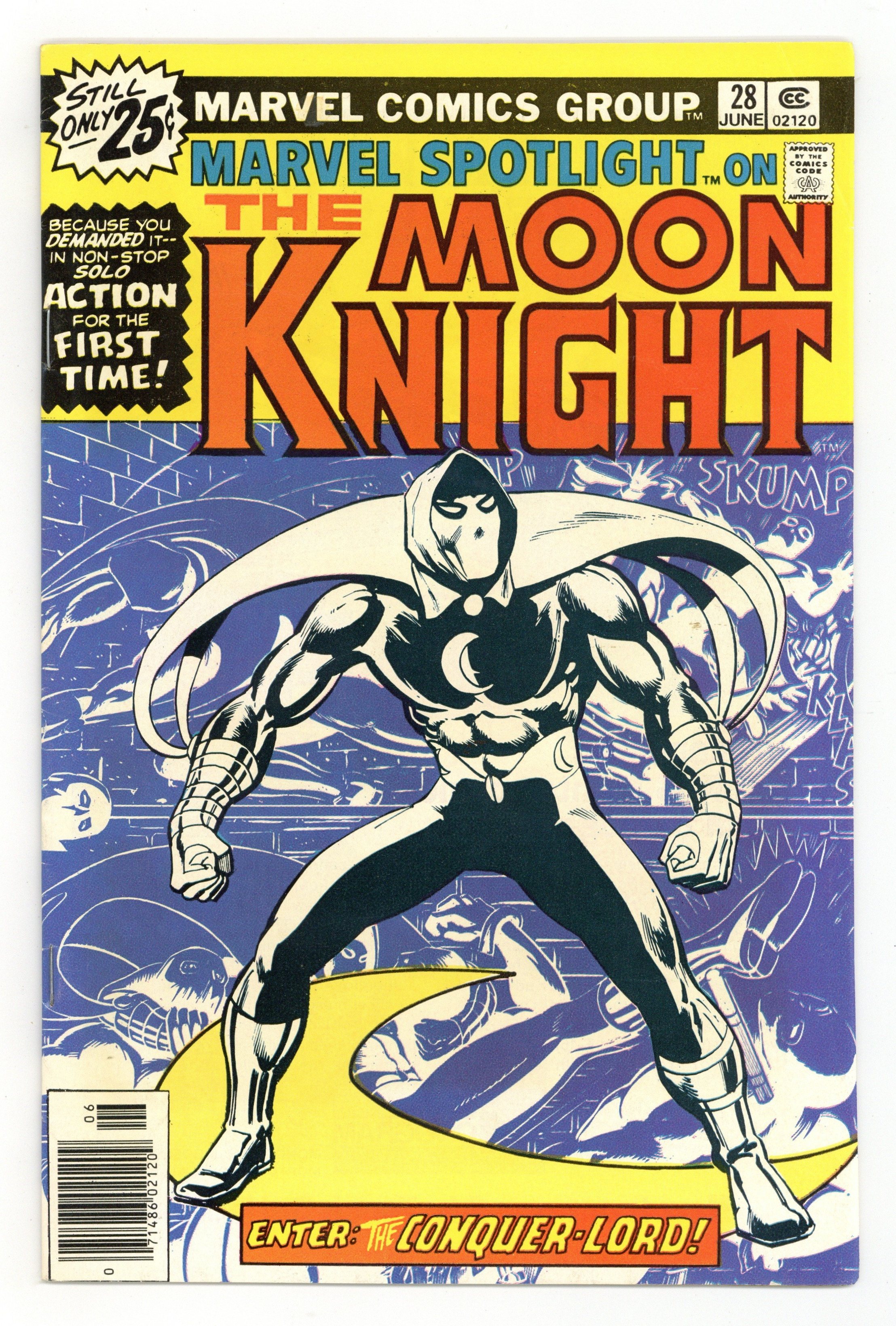 First solo Moon Knight appearance. Cover art by Don Perlin. The Crushing Conquer-Lord!, script by Doug Moench, art by Don Perlin; Moon Night stops seven masked men from breaking into the campaign headquarters for a mayoral prospect named Charles Thurston; Weasel tells Conquer-Lord all about Moon Knight. Letter to the editor from Dean Mullaney (Eclipse Comics). 36 pages, full color. Cover price $0.25.
