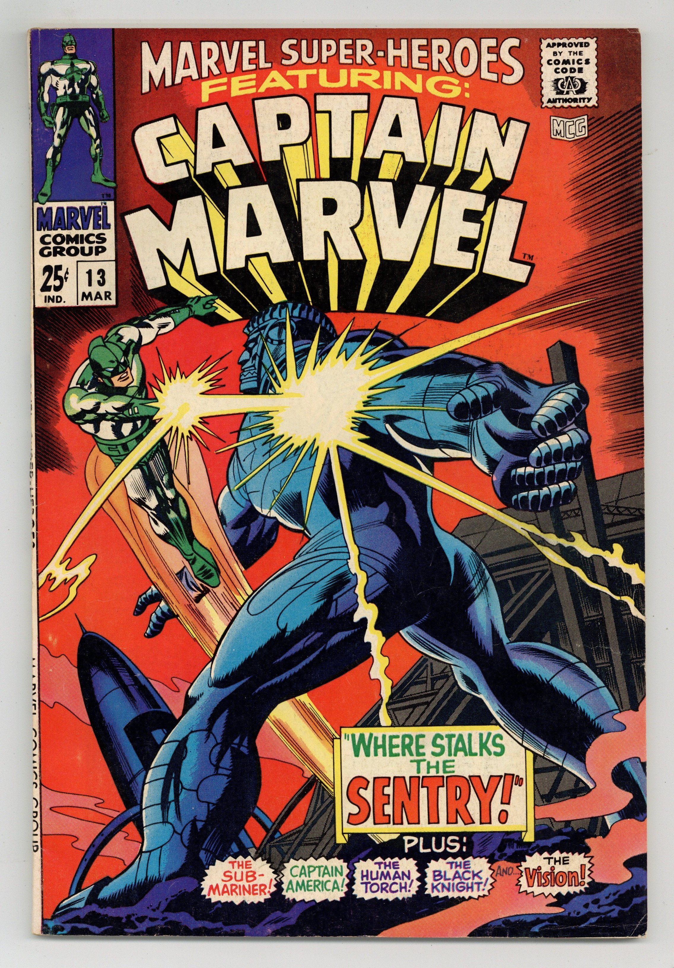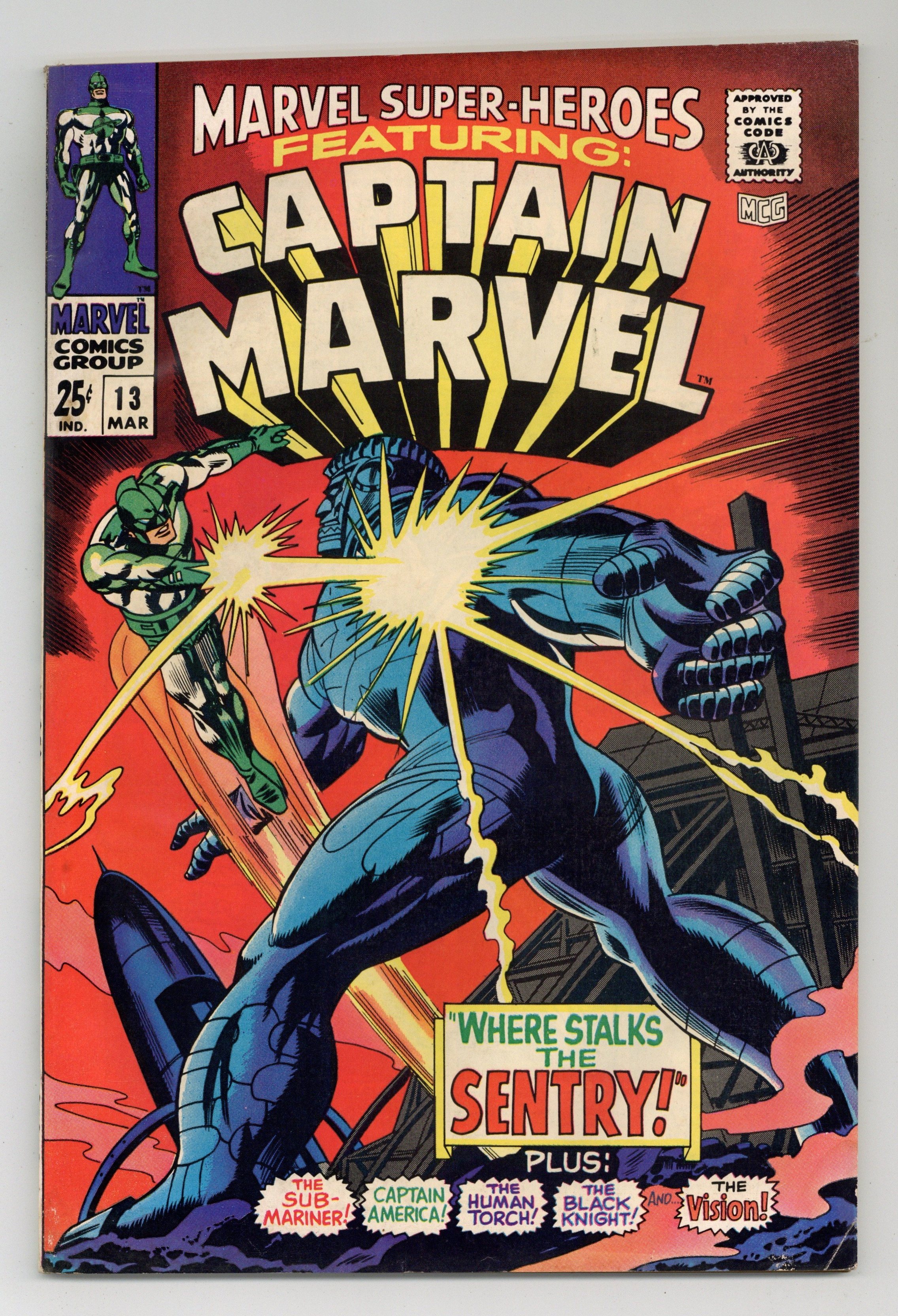 Starts Dec 8 Giant-size issue. Captain Marvel stars in "Where Stalks the Sentry!" Script by Roy Thomas, pencils by Gene Colan, inks by Paul Reinman. The story continues in Captain Marvel 1 (1968). The remainder of the issue consists of Golden Age reprints: the Black Knight by Joe Maneely (1955), the Human Torch by Dick Ayers ("Fugitive at Large!"; 1954); the Vision (1941); Captain America by John Romita Sr. ("Top Secret!"; 1953); and the Sub-Mariner by Bill Everett ("Invasion!"; 1955). Letter to the editor from comic artist Dave Cockrum. Colan cover pencils. 1st Carol Danvers (pre Ms. Marvel). Cover price $0.25.