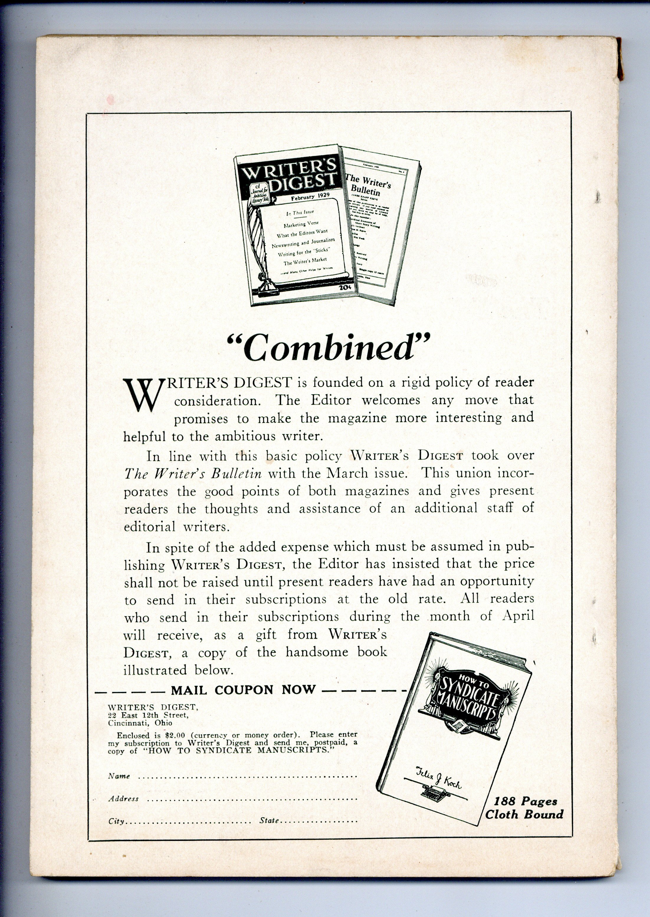 Published Apr 1929 by F+W Publications.$14.00- Front cover detached 5%. Back cover detached 10%. Staple rust: Slight.
