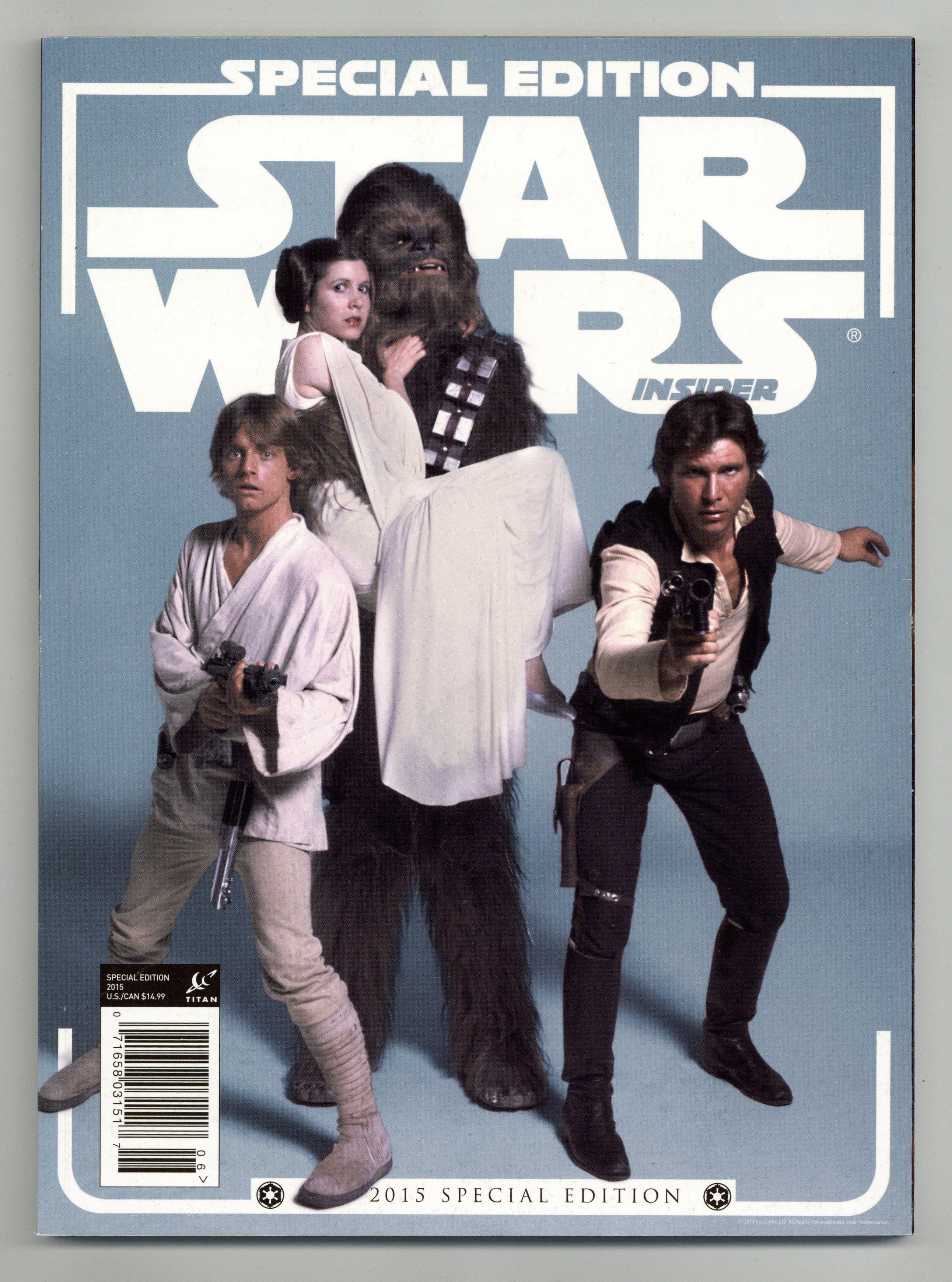 $12.00Star Wars Insider Special Edition 2015. Interviews with Ralph McQuarrie, Joe Johnston, Mark Hamill, features on Boba Fett, Marvel Comics, and more. Profusely illustrated. 146 pages, full color. Cover price $14.99.