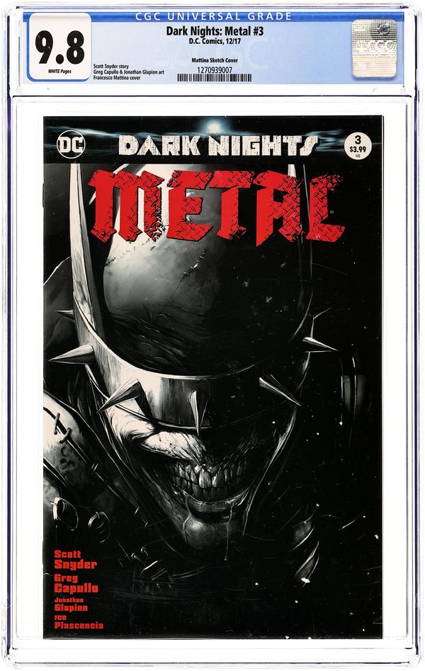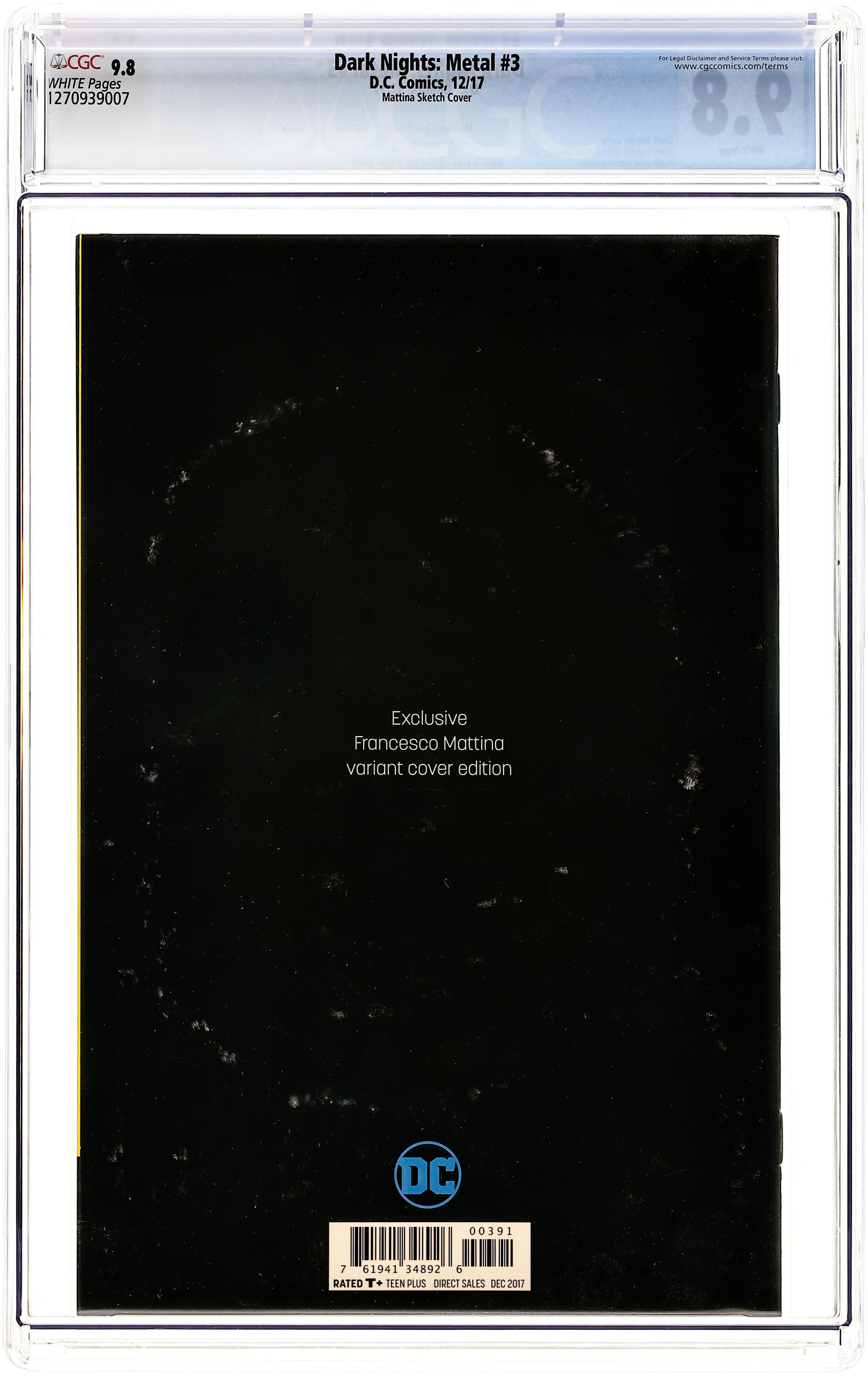 Comic Mint exclusive variant by Francesco Mattina. Written by Scott Snyder. Art by Greg Capullo and Jonathan Glapion. Superman is pulled into the mystery of the Dark Multiverse while the Justice League follows the trail to a weapon that could keep the forces of the Dark Multiverse at bay! 32 pages, full color. Rated T+
