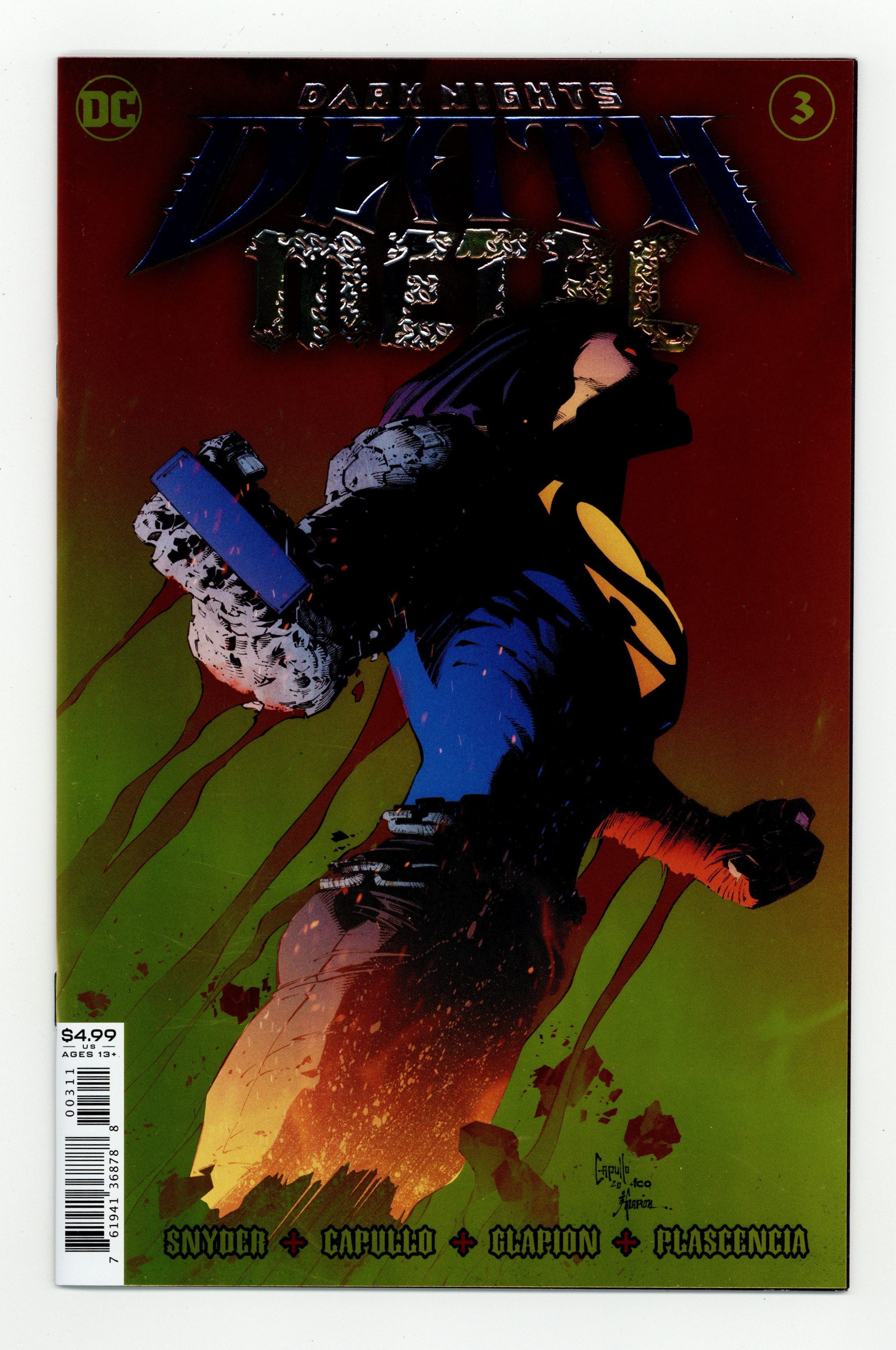 Written by Scott Snyder. Art by Greg Capullo and Jonathan Glapion. Cover by Greg Capullo. All aboard! When the Justice League launches its assault on New Apokolips, the team's goal is to free Superman from his solar prison. But it's all going off the rails when they learn that the Man of Steel is gone for good thanks to the Anti-Life Equation. Plus, the deep secret of the Darkest Knight is revealed-but how much darker could the Batman Who Laughs possibly get? And don't miss the surprise return of everyone's favorite wanna be Robin! 32 pages, full color. Rated T+ Cover price $4.99.