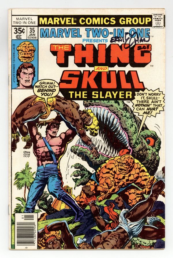 "Enter: Skull the Slayer and Exit: the Thing!" Part 1 of 2. Guest-starring Skull the Slayer. Story by Marv Wolfman. Art by Ernie Chan. Ben Grim has been brought to a prehistoric land of giant beast and savages. But this land is not without its own heroes. Meet the man called Skull the Slayer. Cover price $0.35.
