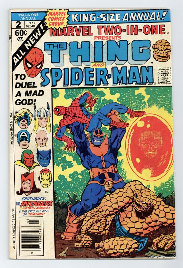 $32.00"Death Watch!" Part 2 of 2. Guest-starring Spider-Man, the Thing, Captain Marvel, and the Avengers. Script by Jim Starlin. Art by Jim Starlin (breakdowns) and Joe Rubinstein (finishes). Cover by Jim Starlin. Story continues from Avengers Annual 7. After Captain Marvel, Iron Man, and Thor destroyed Thanos' synthetic power gem, victory appeared close at hand for Earth's Mightiest Heroes. But the evil genius' back up plan has worked to perfection and knocked out the Avengers! Before succumbing to unconsciousness though, Moondragon sends a desperate plea for help back to Earth, specifically to Peter Parker! The web-slinger knows that cosmic battles in outer space are not his specialty, so he swings by the Baxter Building to scoop up a friend. After a quick pow-wow, the blue-eyed idol of millions and your friendly neighborhood Spider-Man blast off to save the galaxy! It's an epic encounter onboard the mad Titan's space ark as the Thing, Thor, Spider-Man, and finally Adam Warlock test their mettle vs. Thanos! Simply a fantastic annual! First appearances of Master Order and Lord Chaos. Avengers Lineup: Beast, Captain America, Iron Man, Scarlet Witch, Thor, and the Vision. (Note: Besides a surreal appearance in the Death of Captain Marvel Graphic Novel (1982), Thanos does not appear again until Silver Surfer (2nd series) #34 thirteen years later.) 48 pages Cover price $0.60.