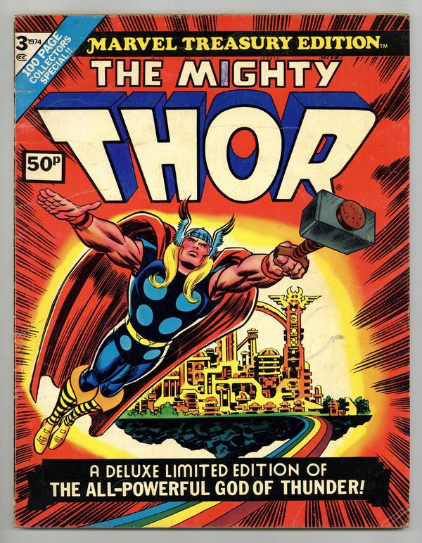 $28.00Issue #3 - 1974. UK edition. Featuring the Mighty Thor. Story by Stan Lee. Art by Jack Kirby and Vince Colletta. Features "When Meet the Immortals, (Reprints Thor #125)," "Whom the Gods would Destroy (Reprints Thor #126)," "The Hammer and the Holocaust (Reprints Thor #127)," "The Power of Pluto (Reprints Thor #128)," "The Verdict of Zeus (Reprints Thor #129)," and "Thunder in the Underworld (Reprints Thor #130)." Guest-starring Hercules. Includes a 2-page pin-up by legendary artist John Buscema and a cover gallery. 10-in. x 13 1/4-in., 96 pages, full color.