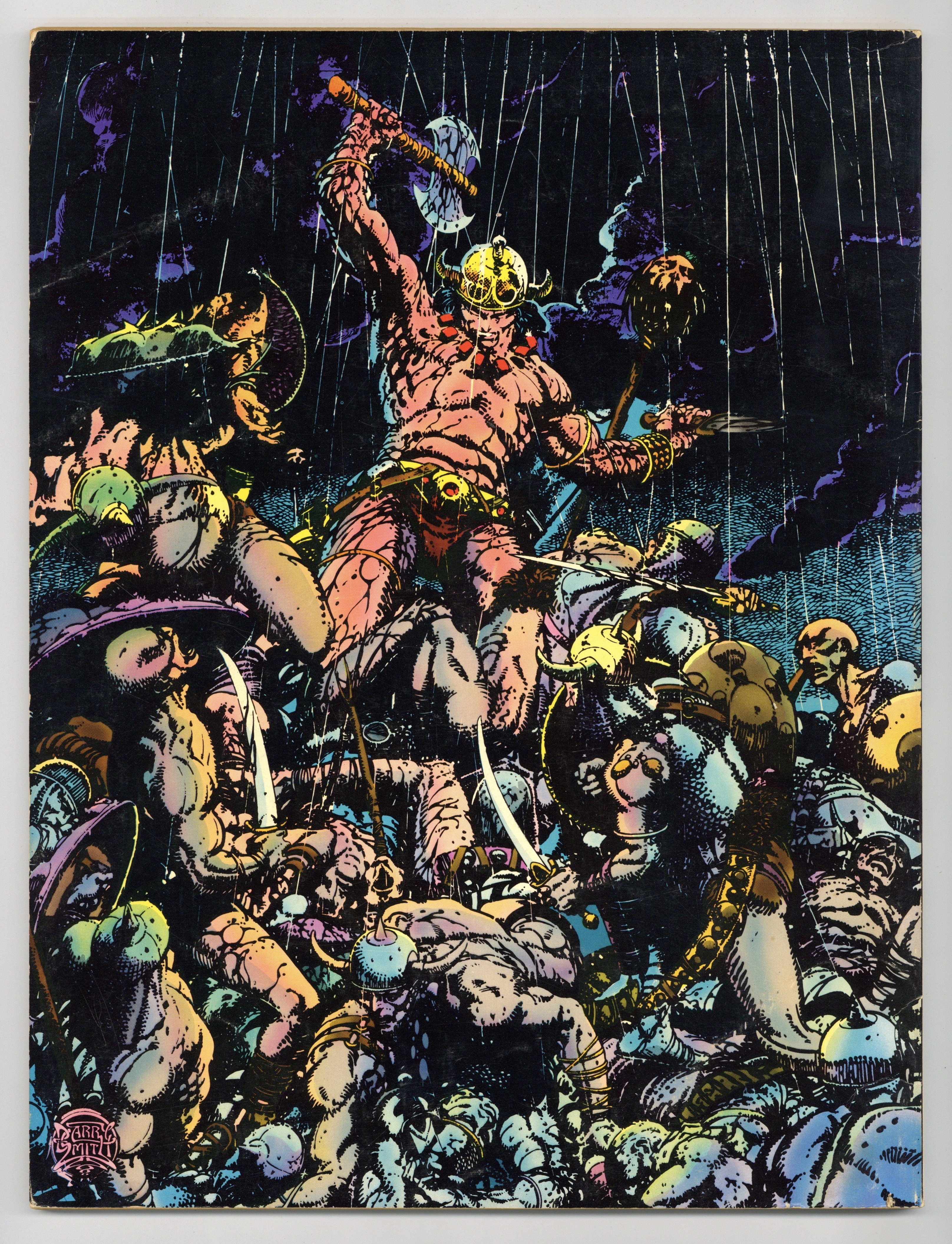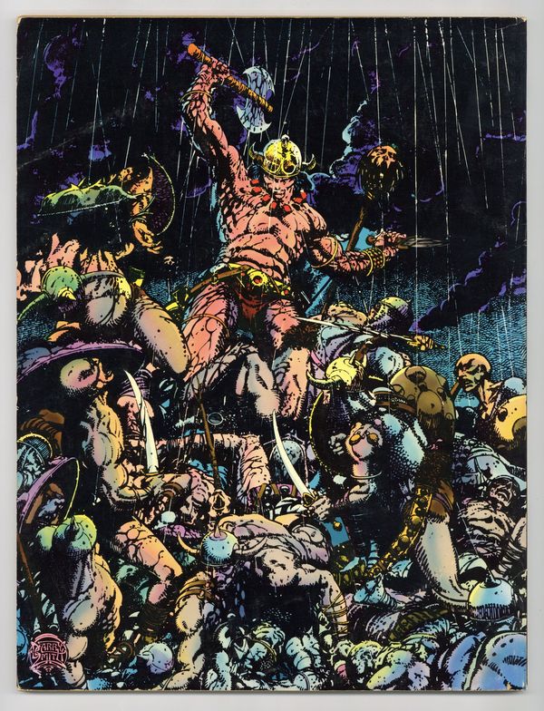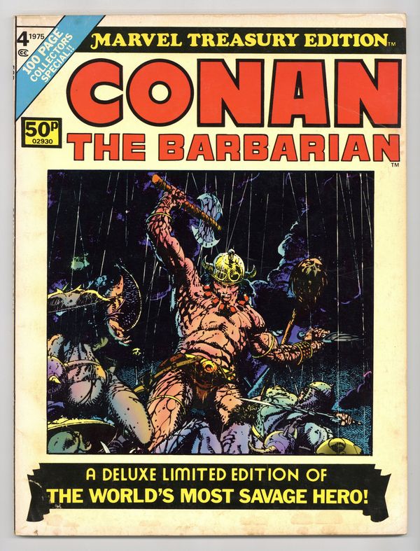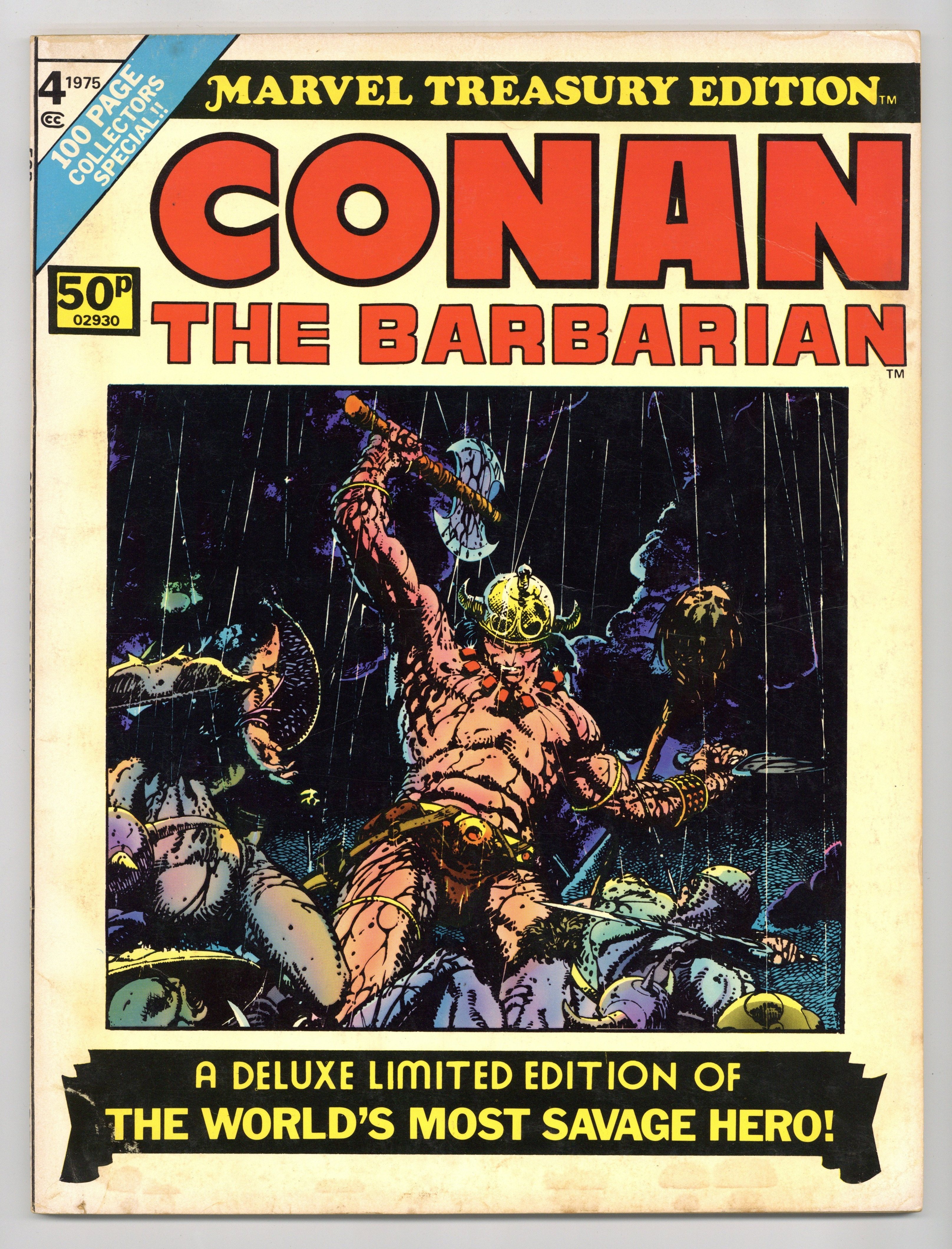 $32.00Issue #4 - 1974. UK edition. Featuring Robert E. Howard's Conan the Barbarian. Adapted by Roy Thomas and Barry Windsor-Smith. Features the epic tales "Rogues in the House" (Reprints Conan the Barbarian #11) and the magnificent "Red Nails" (Savage Tales #2-3). Also includes a map of Hyboria and an In Memory of Robert E. Howard pin-up. 10-in. x 13 1/4-in., 96 pages, full color.