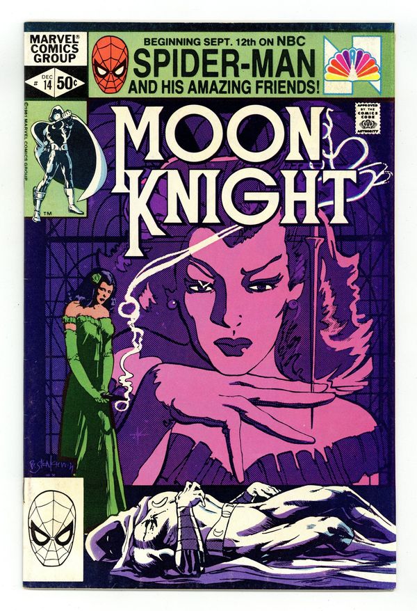 Tags: Marvel Legacy Numbering: Moon Knight (part 14)$8.60Direct Edition. "Stained Glass Scarlet!" Written by Doug Moench, with art and cover by Bill Sienkiewicz. Moon Knight is on the trail of a young killer just released from prison when he comes across a mysterious woman who is also trying to intercept Joe Fasinera because he happens to be her son. 32 pages, FC. NOTE: 1st appearance Scarlet Fasinera. Cover price $0.50.