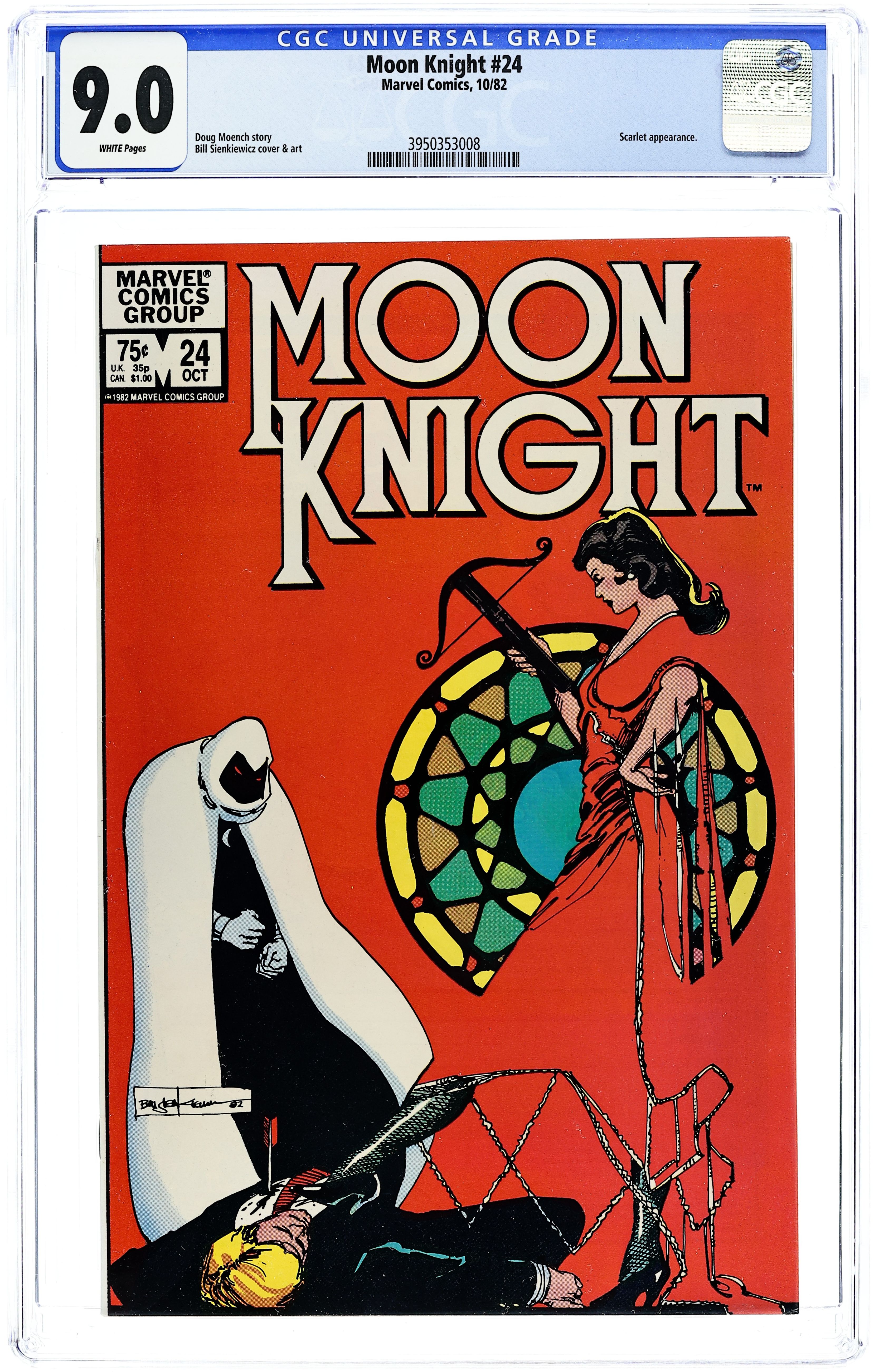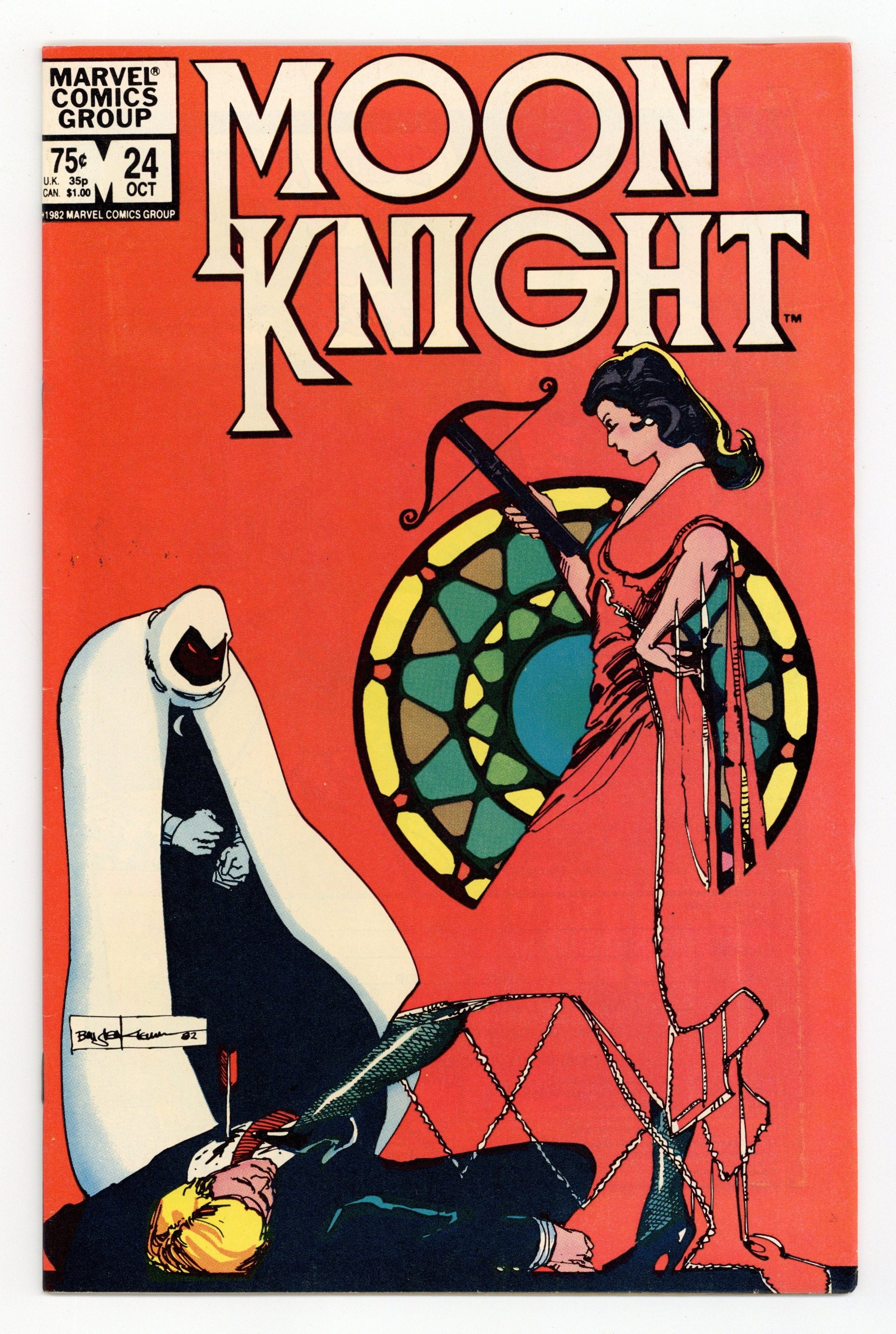 Tags: Marvel Legacy Numbering: Moon Knight (part 24)$9.00"Scarlet in Moonlight!" Written by Doug Moench, with art and cover by Bill Sienkiewicz. Scarlet begins a one woman war on the mob by killing their top bosses, and Moon Knight can't decide whether he wants to stop her or not. 32 pages, FC. Cover price $0.75.