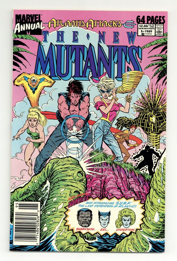 Tags: Atlantis Attacks (part 11), X-Men$5.90Atlantis Attacks crossover: "Here Be Monsters." Script by Louise Simonson, pencils by Rob Liefeld (1st art on New Mutants), inks by Tim Dzon. Also in this issue: Boom-Boom stars in "A Case of the Cutes." Script by Judith Kurzer Bogdanove, pencils by Jon Bogdanove, inks by Hilary Barta. Cameos by Spider-Man, the Fantastic Four, Captain America, Daredevil, Doctor Doom, the Sub-Mariner, Doctor Octopus, the Hulk, Wolverine, Punisher. The Sub-Mariner stars in "Saga of the Serpent Crown: Crowded Heads." Script by Peter Sanderson, pencils by Mark Bagley, inks by Keith Williams. Thing appearance. 4 pin-ups by Liefeld (2 inked by Joe Rubinstein). Liefeld/Dzon cover. Cover price $2.00.