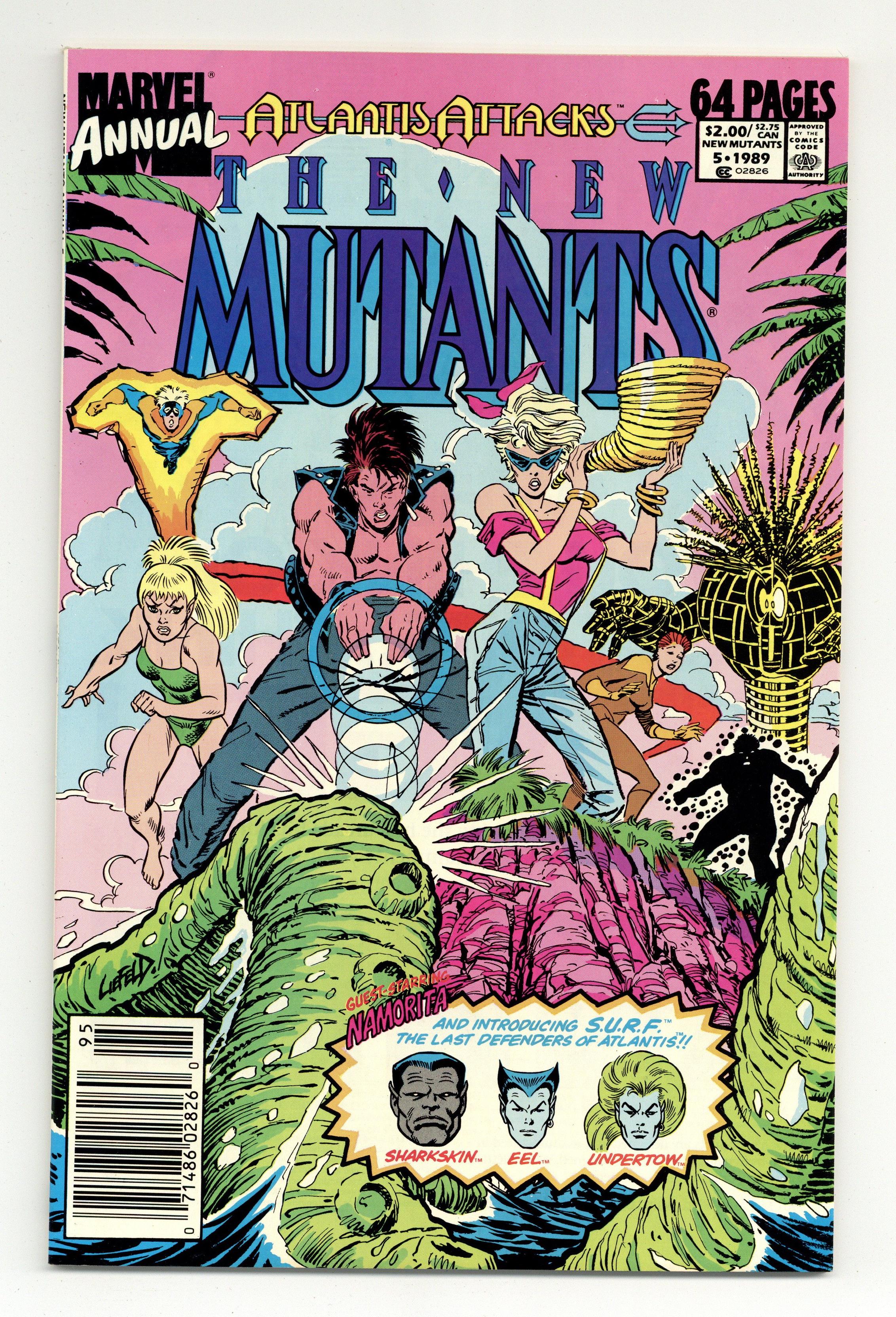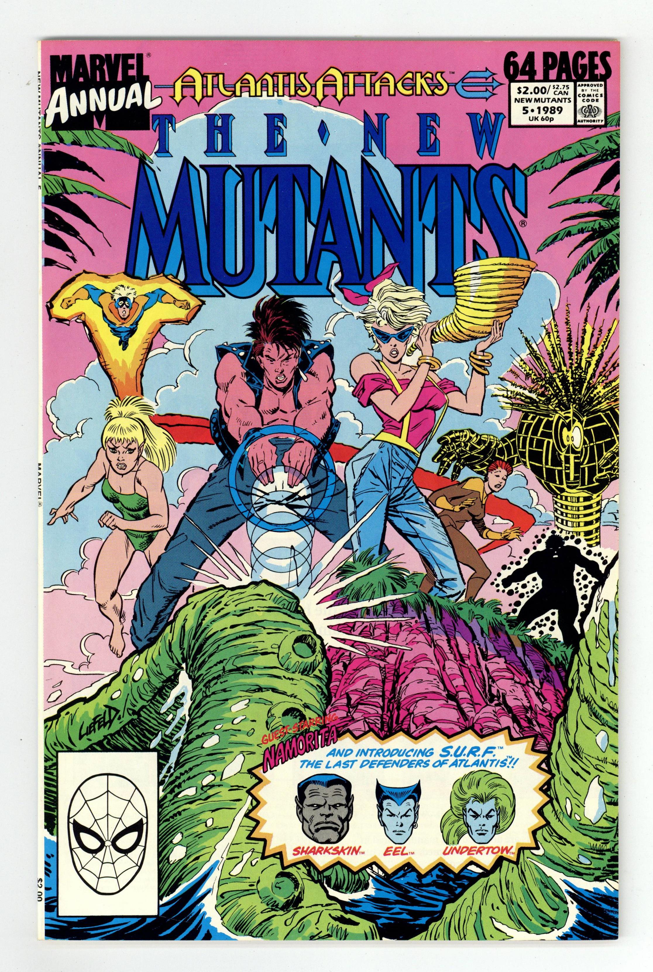 Atlantis Attacks crossover: "Here Be Monsters." Script by Louise Simonson, pencils by Rob Liefeld (1st art on New Mutants), inks by Tim Dzon. Also in this issue: Boom-Boom stars in "A Case of the Cutes." Script by Judith Kurzer Bogdanove, pencils by Jon Bogdanove, inks by Hilary Barta. Cameos by Spider-Man, the Fantastic Four, Captain America, Daredevil, Doctor Doom, the Sub-Mariner, Doctor Octopus, the Hulk, Wolverine, Punisher. The Sub-Mariner stars in "Saga of the Serpent Crown: Crowded Heads." Script by Peter Sanderson, pencils by Mark Bagley, inks by Keith Williams. Thing appearance. 4 pin-ups by Liefeld (2 inked by Joe Rubinstein). Liefeld/Dzon cover. Cover price $2.00.