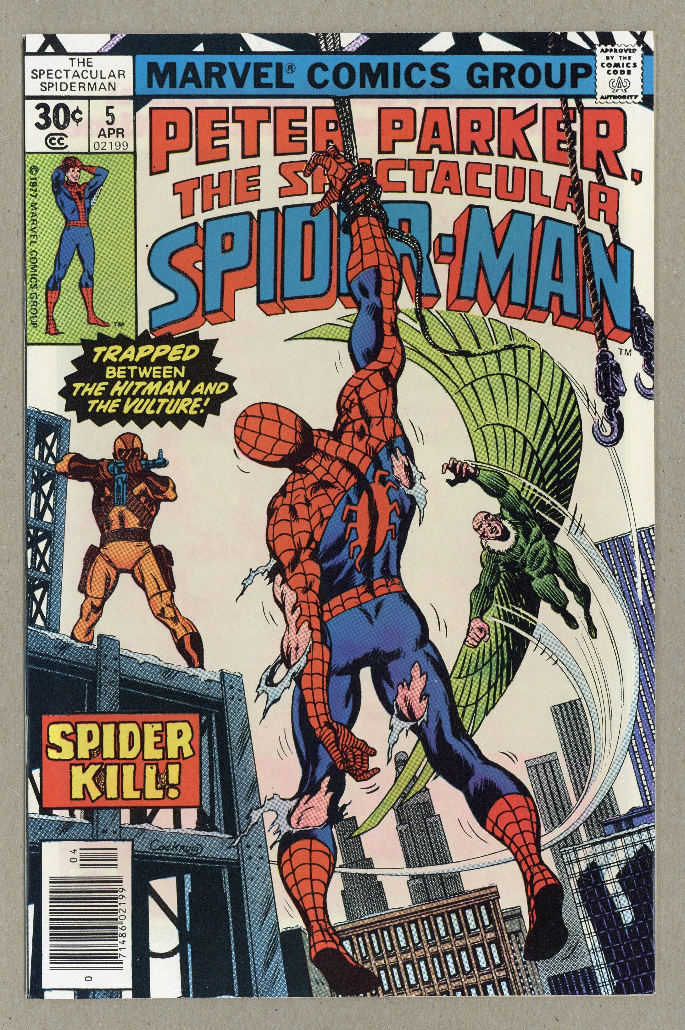 Tags: Marvel Legacy Numbering: Spectacular Spider-Man (part 5), Spider-Man$15.00"Spider-Kill!" Part 2 of 2. Script by Archie Goodwin. Art by Sal Buscema (breakdowns) and Mike Esposito (finishes). Cover by Dave Cockrum. An awesome three-way battle rages outside Peter Parker's apartment! The Vulture vs. the Hitman vs. the Spectacular Spider-Man! As the cover shows, the situation looks grim for the web-slinger as he dangles in midair with the Vulture closing in and the Hitman lining up the kill shot! Will the spectacular one survive? Meanwhile, Flash Thompson and Mary Jane Watson investigate the mysterious reappearance of Sha Shan. (Note: The Hitman returns in Amazing Spider-Man 174.) 32 pages Cover price $0.30.