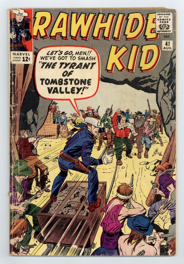 $15.25Cover by Jack Kirby and Dick Ayers. Stories by Stan Lee and Larry Lieber. Art by Jack Keller, Larry Lieber, Paul Reinman and Sol Brodsky. The Rawhide Kid must smash..."The Tyrant of Tombstone Territory" by Stan Lee, Jack Keller and Paul Reinman. Also in this issue: Back-up story "The Winner!" by Lee (plot), Larry Lieber (script/pencils) and Sol Brodsky (inks). Plus: 1-page text story "Murder on the Mesa" (continued from the previous issue), reprinted from Girl Comics (1949) #11. 32 pages, full color. Cover price $0.12.