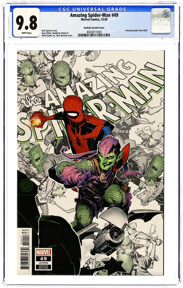 Cover by Chris Bachalo and Tim Townsend. Legacy #850. Written by Nick Spencer, Kurt Busiek, Tradd Moore and Saladin Ahmed. Art by Ryan Ottley, Humberto Ramos, Mark Bagley, Chris Bachalo, Tradd Moore, Aaron Kuder, Cliff Rathburn, Victor Olazaba, John Dell and Tim Townsend. AMAZING SPIDER-MAN reaches another landmark and we're celebrating Spider-Style! As if things weren't bad enough for Spider-Man with Sin-Eater's reign of terror reaching riot level… THE GREEN GOBLIN IS BACK! Spidey has been through a lot, but even the worst things that have ever happened to Spider-Man have just been a prelude for what happens here, with an epic main story by a veritable Hall of Fame of Spider-Creators. Featuring: "The Return of the Green Goblin: Chapter One: Unstoppable" by Nick Spencer, Ryan Ottley and Cliff Rathburn; "Chapter Two: The Debt" by Spencer, Humberto Ramos and Victor Olazaba; and "Chapter Three: Your Choice" by Spencer, Mark Bagley and John Dell. Also in this issue: "All You Need Is...?" by Kurt Busiek, Chris Bachalo and Tim Townsend; "Four Shoes!" by Tradd Moore; and "A Family Affair" by Saladin Ahmed and Aaron Kuder. 96 pages, full color. Rated T Cover price $10.00.