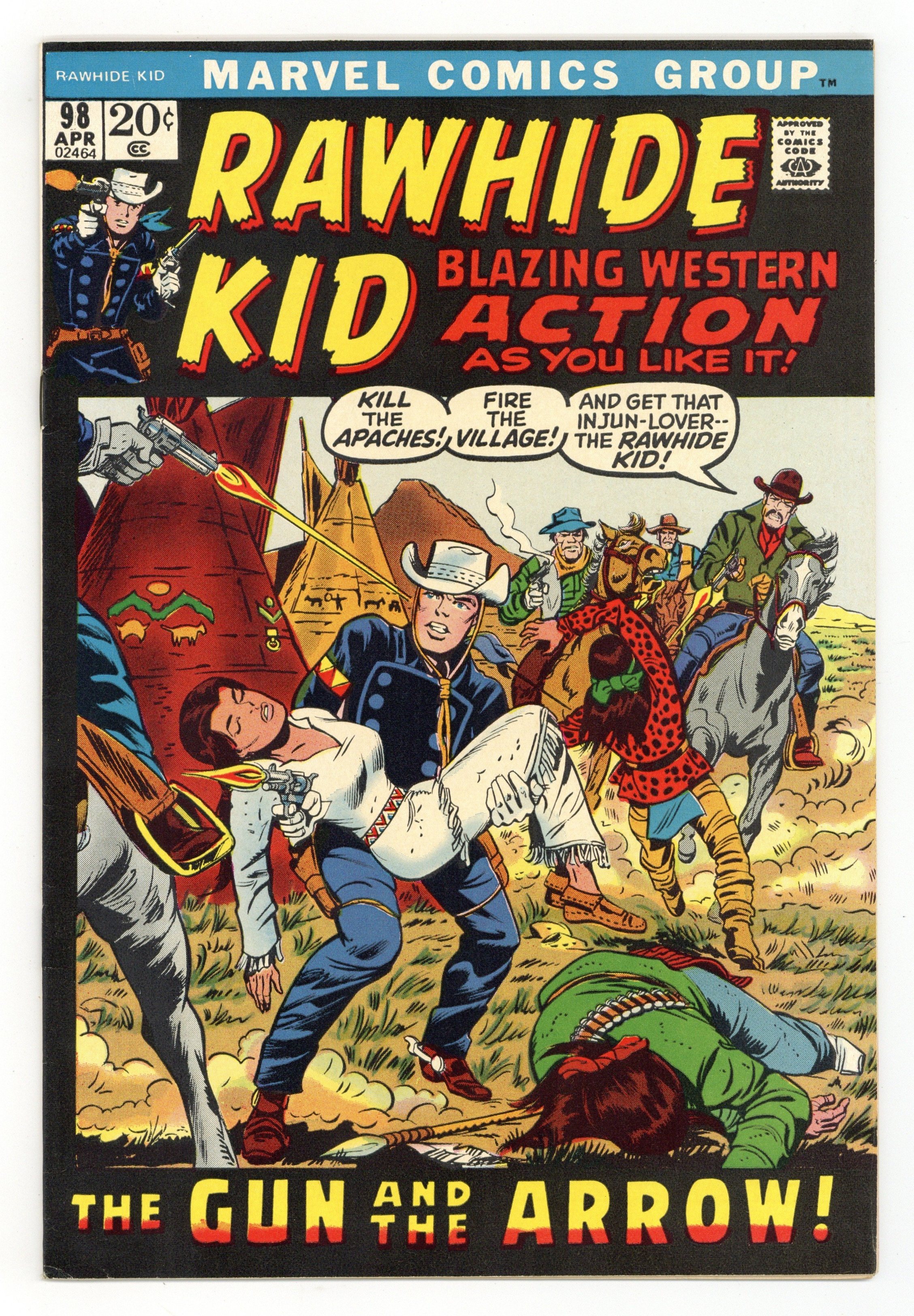 Cover by Larry Lieber and Bill Everett. Stories by Larry Lieber, Stan Lee and unknown. Art by Larry Lieber, Doug Wildey, Syd Shores, George Roussos and unknown. Blazing Western action as you like it! The Rawhide Kid stars in "The Gun and the Arrow!" by Larry Lieber and George Roussos. Appearances by Iron Wolf and Bright Fawn. Plus: Back-up story "Back Down or Die!" by Stan Lee and Doug Wildey, reprinted from Ringo Kid Western (1954 Atlas) #16. Also: Red Hawkins and Tall Feather in the back-up story "The Wild Beast" with pencils by Syd Shores, reprinted from Apache Kid (1950) #1. And: Arnold Schwarzenegger is featured in a 1-page Joe Weider ad. 32 pages, full color. Cover price $0.20.