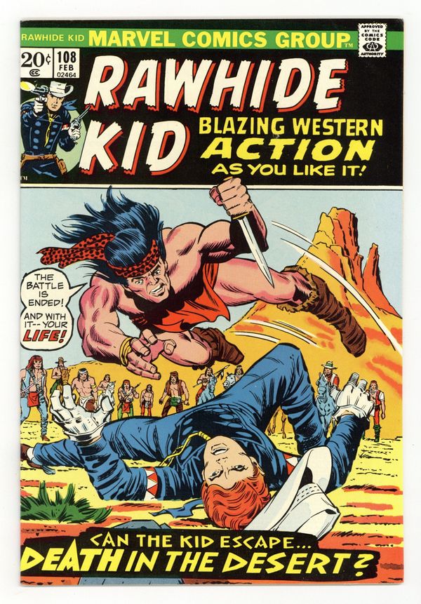 Cover by Larry Lieber and Herb Trimpe. Stories by Larry Lieber and Stan Lee. Art by Larry Lieber, Syd Shores, George Roussos and unknown. Blazing Western action as you like it! The battle is ended...and with it...the Rawhide Kid's life? Can the Kid escape death in the desert? Find out in "Desert Fury" by Larry Lieber and George Roussos. Plus: Back-up story "When the Harpers Rode" with story by Stan Lee and pencils by Syd Shores, reprinted from Western Outlaws (1954 Atlas) #15. 32 pages, full color. Cover price $0.20.