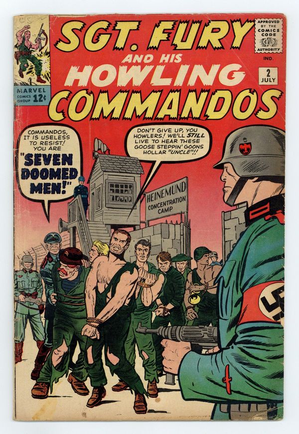 Cover pencils by Jack Kirby, inks by Dick Ayers. Seven Doomed Men, script by Stan Lee, pencils by Jack Kirby, inks by Dick Ayers; The Commandos must make sure that a German weapon development center never receives a shipment of heavy water which will let them develop an atomic bomb. 36 pgs. $0.12. Cover price $0.12.