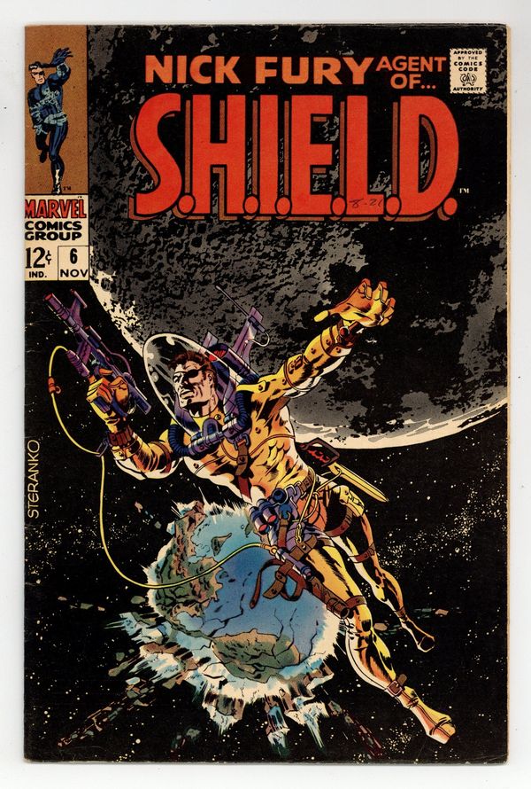 Cover by Jim Steranko. "Doom Must Fall!", script by Roy Thomas (plot), Frank Springer (plot), and Archie Goodwin (dialogue), art by Frank Springer; Fury is summoned by a condition red priority alert to the "Observatron" chamber; An asteroid is being drawn off-course directly toward Earth, impact only hours away! Fury & Cliff Randall (SHIELD's top ace pilot) race to the projected impact point, the Central Andes, hoping to find whatever is pulling the asteroid from its normal orbit; There, they find a hidden base built inside a mountain, run by a group of other-dimensional beings called "The Others"; Twenty years earlier, the tyrant of their dimension, facing revolt, set off an "Impact Inducer", which would destroy everything; Survivors escaped in a ship when the force of the destruction opened a dimensional doorway to Earth; Knowing it would take twenty years for the "reverberations" to still, they built a base and sent out "prodigals" to gather intelligence about Earth, whose memories were blanked - and it turns out Randall was one of these all along! 36 pgs., full color. $0.12. Cover price $0.12.