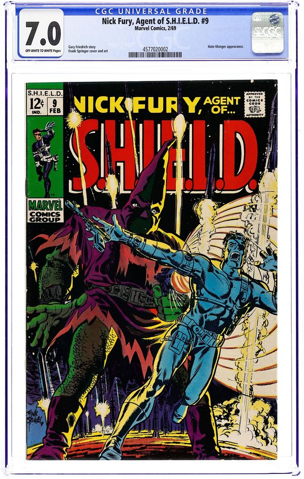 Cover by Jim Steranko. "The Name Of The Game Is... Hate!", script by Gary Friedrich (plot, dialogue) and Frank Springer (plot), art by Frank Springer; While at a doctor's appointment, Fury is the target of an assassin, who misses him but hits the doctor instead; Escaping via aircraft, Fury recognizes the "H" symbol and realizes The Hate-Monger is somehow back in action; After rendezvousing at the Heli-Carrier, Fury, Dugan, Jimmy & Gabe pursue the aircraft & wind up in an aerial dogfight; After shooting down the enemy jet, they follow, only to find themselves in a bizarre prehistoric landscape filled with dinosaurs!; Fury plunges into a gigantic underground laboratory and comes face-to-face with The Hate-Monger, who reveals the other SHIELD agents are really victims of the "Psychotron," which is creating illusions in their minds; The Hate-Monger plans to use nuclear missiles to "deal a death-blow to every nation on Earth," and also shows him a "Brain-Bank" chamber containing the "active brains" of all his former advisers and associates, whose mentalities live on even while their bodies are long dead. 36 pgs., full color. $0.12. Cover price $0.12.