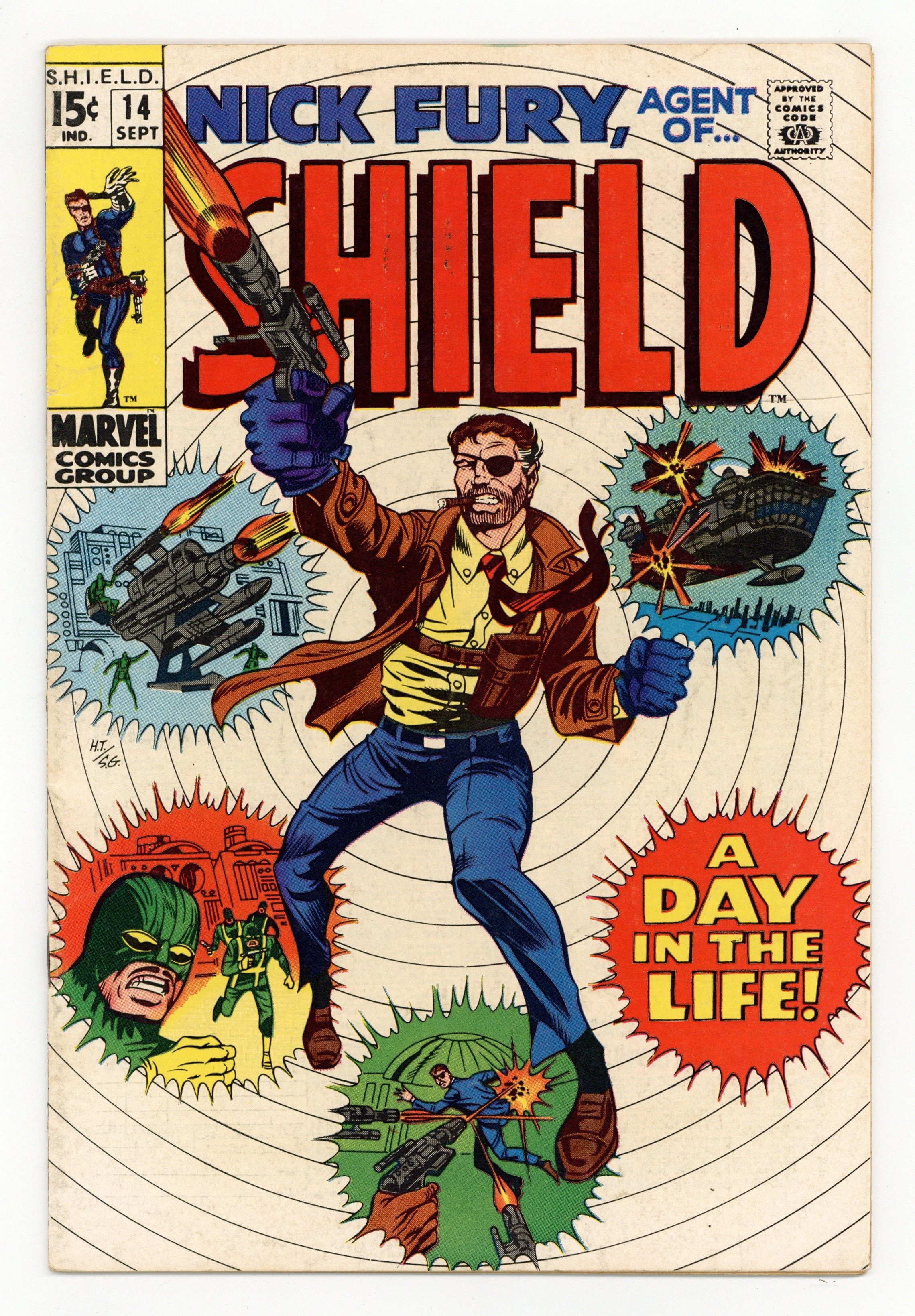Cover pencils by Herb Trimpe, inks by Sam Grainger. "Nick Fury... A Day In the Life," script by Gary Friedrich (plot, dialogue) and Herb Trimpe (plot), pencils by Herb Trimpe, inks by Sam Grainger; Aboard the Heli-Carrier, the "Psycho-Projector" is used on Fury, to put him thru his paces while unconscious and learn what's really going on in his mind; It turns out EVERYTHING involving "The Super-Patriot" was just a dream! Later, with no knowledge of this, Fury wakes up back in his NY apartment, where Val has a morning Alka-Seltzer waiting for him; His new secretary, Agent Huff, contacts him to let him know the Munitions Department wants him for a briefing; But someone has sabotaged his apartment, and TWICE he barely escapes death!; Elsewhere, HYDRA agent Number 72 plots Fury's death; Fury skips breakfast, then is ambushed on the way to his car; in route to the Heli-Carrier, a fault develops in one of the anti-grav wheels of his Ferrari, causing him to bail out and parachute to land. Letter to the editor from comics writer Don McGregor. 36 pgs., full color. $0.15. Cover price $0.15.
