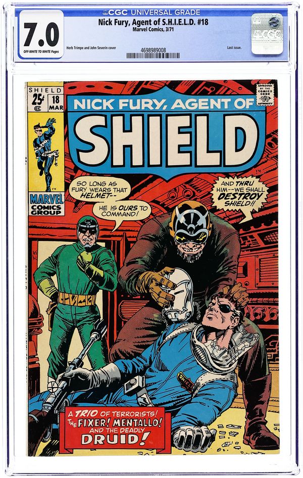 52-page giant; all reprints. Cover pencils by Herb Trimpe, inks by John Severin. "Who Strikes at - SHIELD?" (from Strange Tales 142), script by Jack Kirby (plot) and Stan Lee (dialogue), pencils by Jack Kirby, inks by Mike Esposito (as Mike Demeo); After a new "Wild Bill" robot goes wild, Fury checks out the "Encephalogram-Inducer", which, when hooked into the "Brainwave Stimulator" can transform the thoughts of the ESP Division into images; Mentallo breaches multiple defenses of The Fixer's underwater base, then convinces him to join forces; Fury contacts another SHIELD base for info about "Inferno 42" and Batroc The Leaper. Strange Tales #142, 143, and 144 cover reprints by Jack Kirby Mike Esposito. "To Free a Brain Slave" (from ST 143) script by Jack Kirby (plot) and Stan Lee (dialogue), pencils by Jack Kirby (layouts) and Howard Purcell, inks by Mike Esposito (as M. Demeo); While SHIELD HQ is in the hands of Mentallo & The Fixer, and Fury a helpless prisoner, Dum Dum & his men prepare to strike back. "The Day of the Druid!" (from ST 143), script by Jack Kirby (plot) and Stan Lee (dialogue), pencils by Jack Kirby (layouts) and Howard Purcell, inks by Mike Esposito (as M. Demeo). 52 pgs., full color. $0.25. Cover price $0.25.