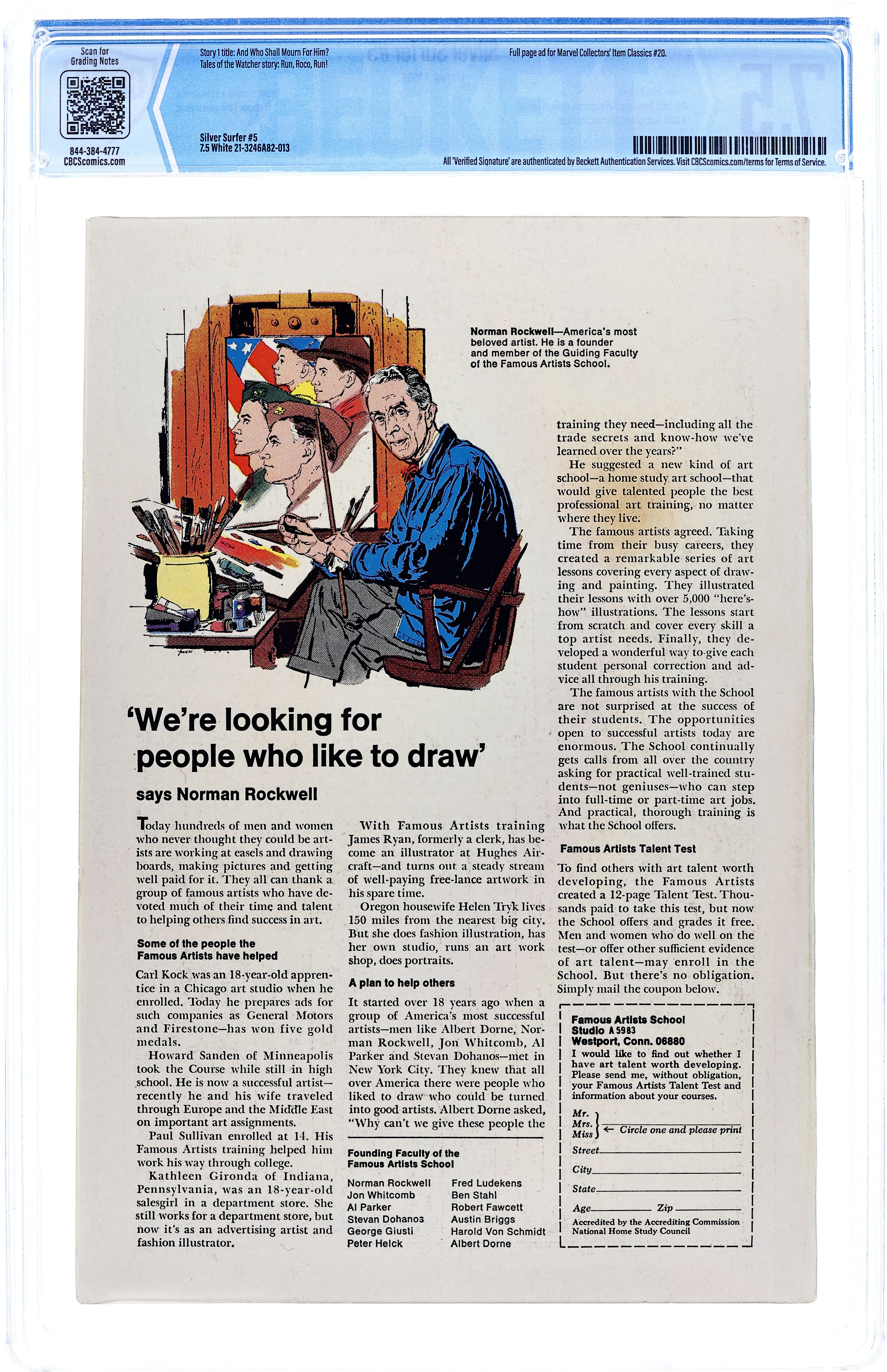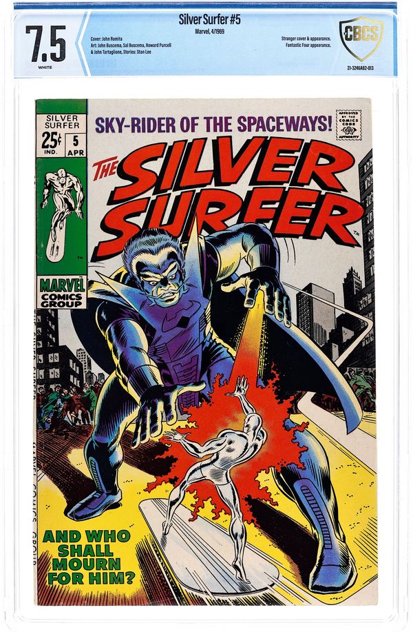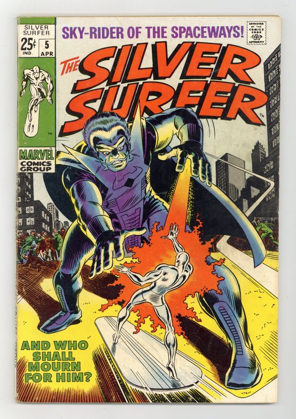 "...And Who Shall Mourn for Him?!" Cameos by the Fantastic Four and the X-Men. Written by Stan Lee. Art by John Buscema and Sal Buscema. The Silver Surfer encounters a being of unimaginable cosmic power. Can even the Sentinel of the Spaceways hope to defeat the enigmatic Stranger? Meanwhile, for the fate of many innocent lives, one man will make the ultimate sacrifice. Includes the Watcher back-up "Run, Roco, Run!" Story by Stan Lee. Art by Howard Purcell and John Tartaglione. 68-page giant. Letter to the editor from Wendy Pini (Fletcher) of Elfquest fame.