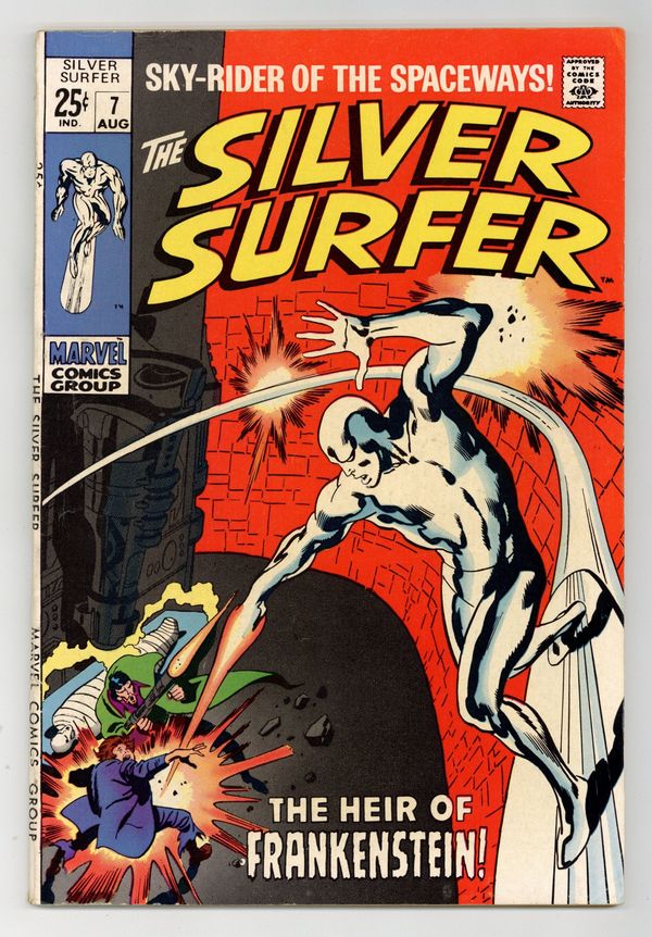 "The Heir of Frankenstein!" Written by Stan Lee. Art by John Buscema and Sal Buscema. Cover by John John Buscema. When a madman clones the power of the Silver Surfer, the Sentinel of the Spaceways finds himself in mortal combat with a creatures who power rivals his own. Includes the Watcher back-up "I, the Gargoyle." Story by Stan Lee. Art by Howard Purcell and Dan Adkins. Final 64-page giant. First appearance of Marvel's Frankenstein. Cover price $0.25.