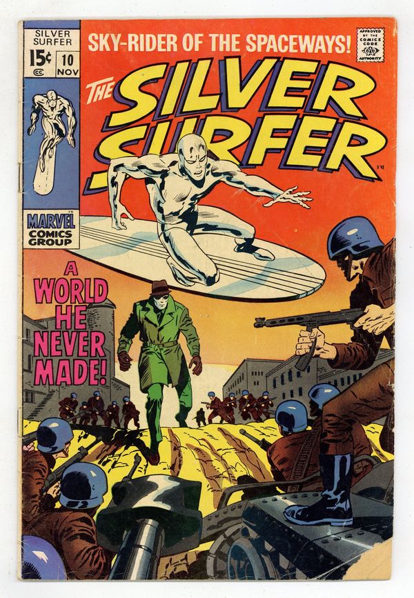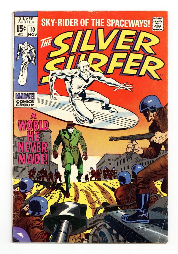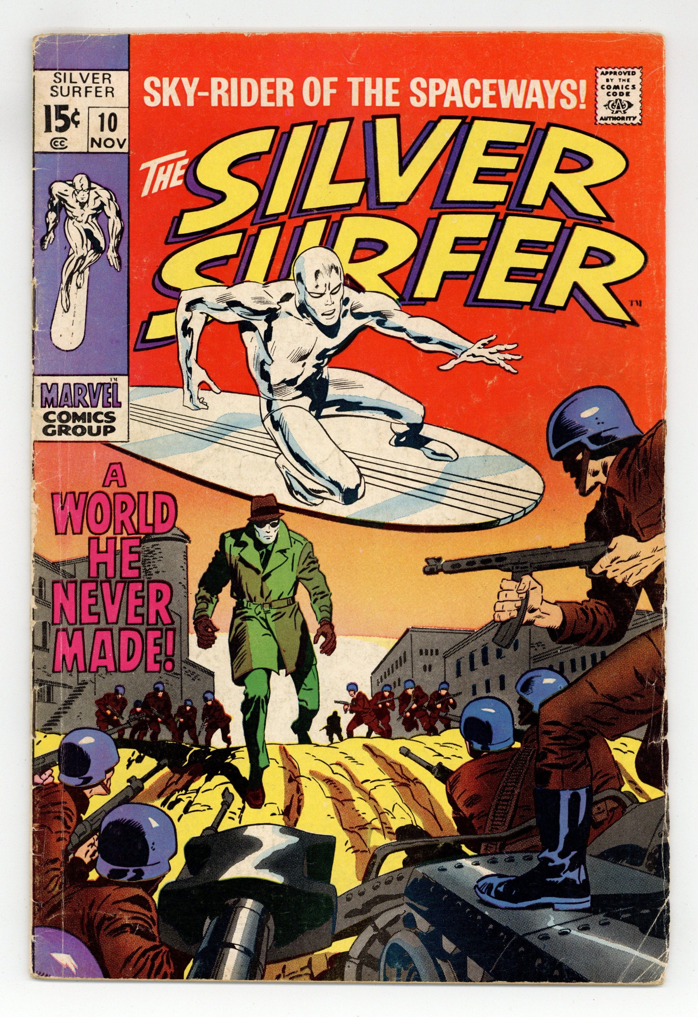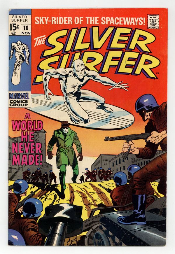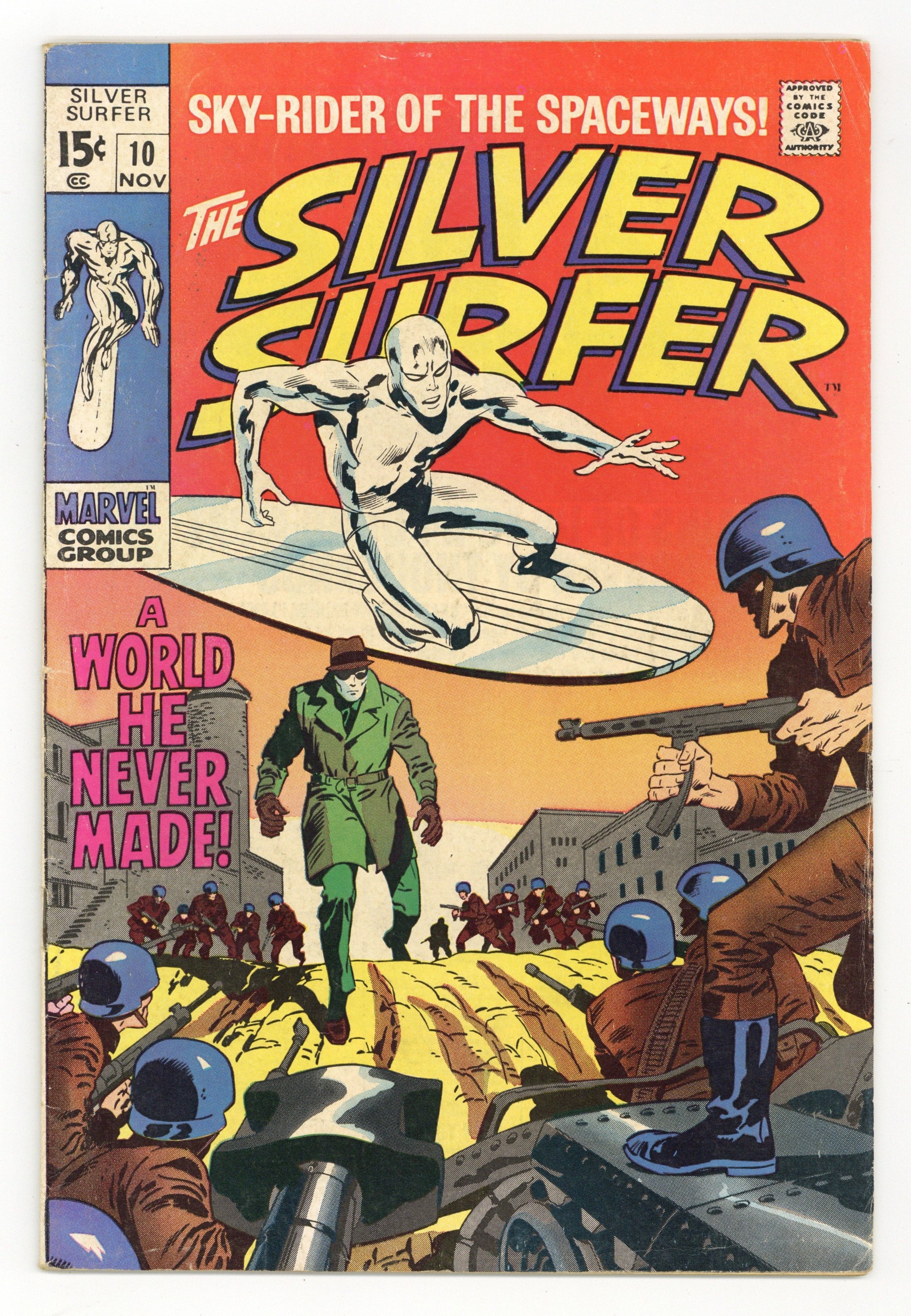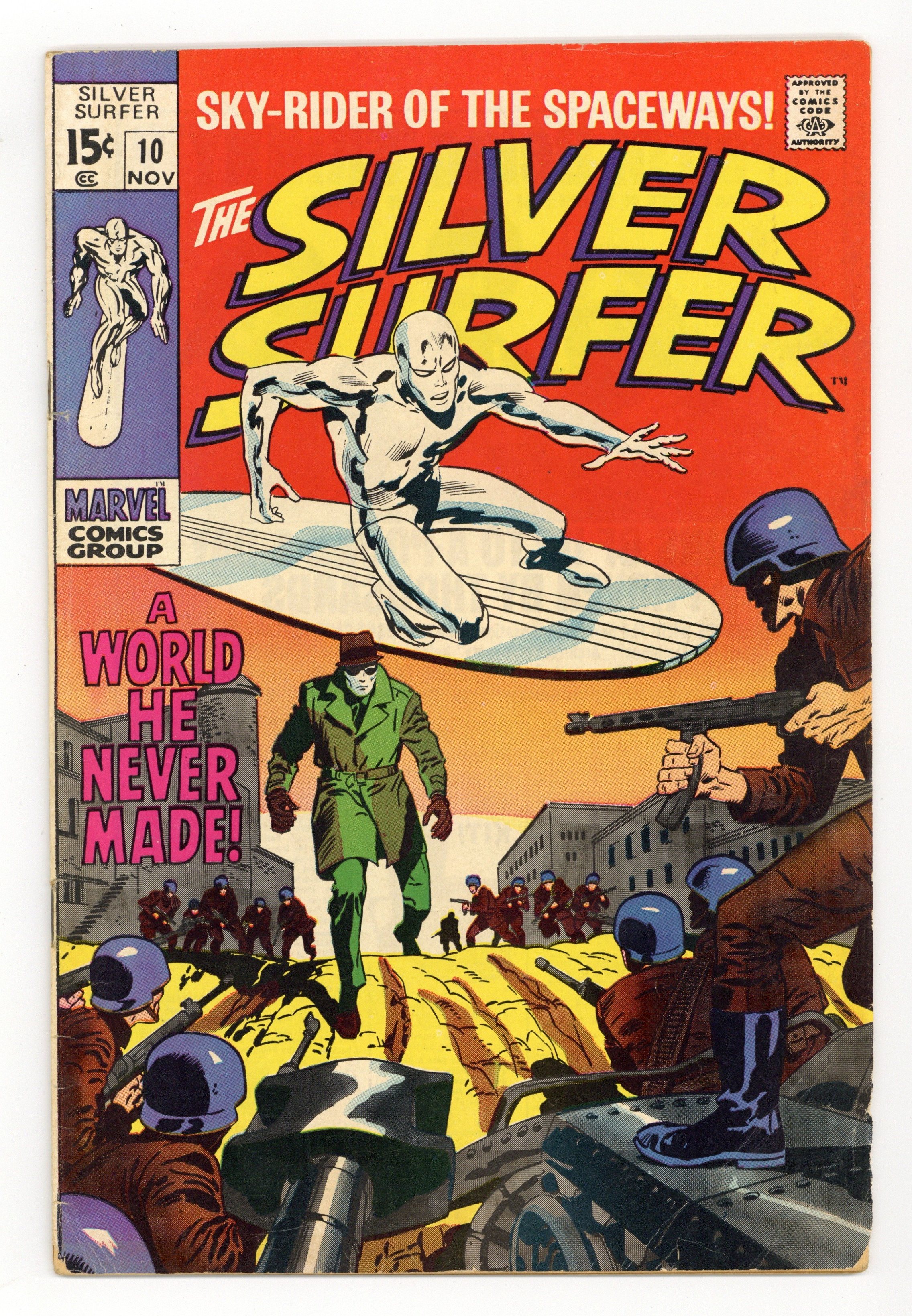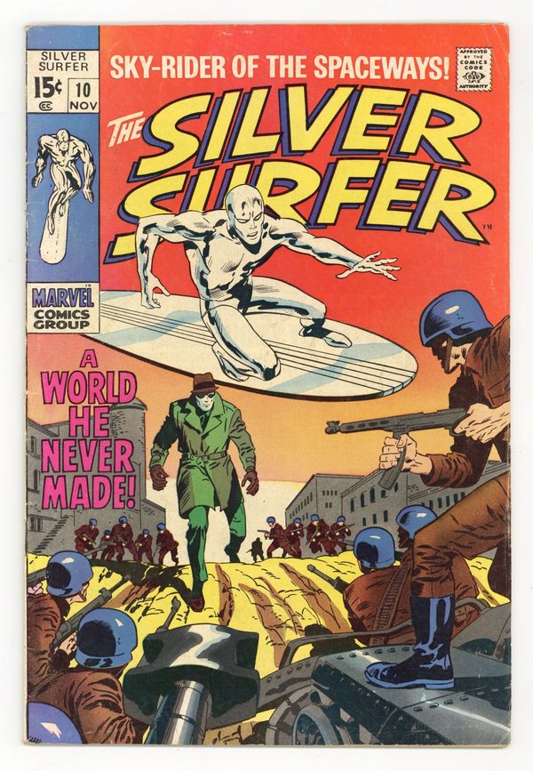 "A World he Never Made!" Part 1 of 2. Written by Stan Lee. Art by John Buscema and Dan Adkins. In an effort to better understand mankind, the Silver Surfer ventures among them, incognito. Cover price $0.15.