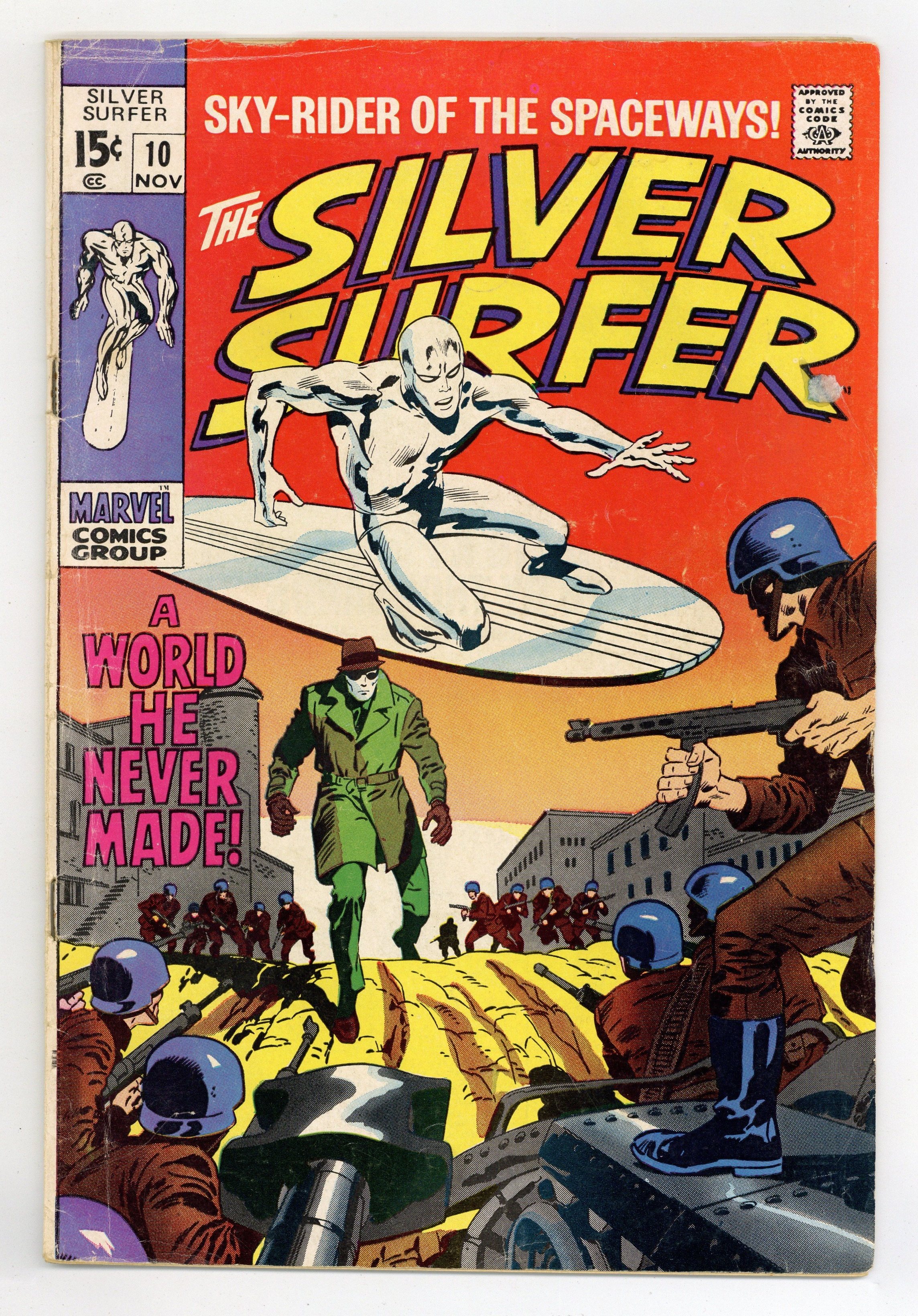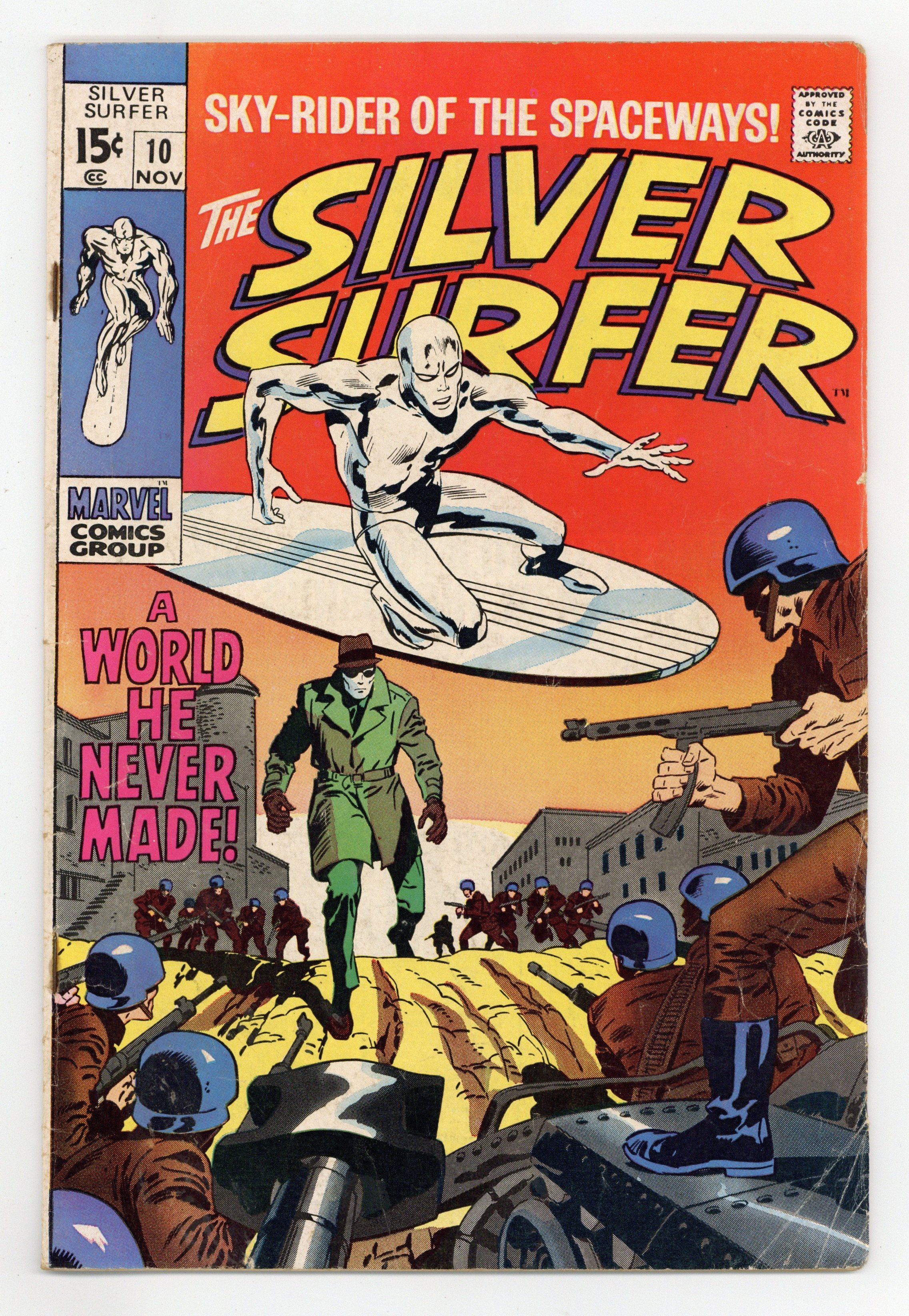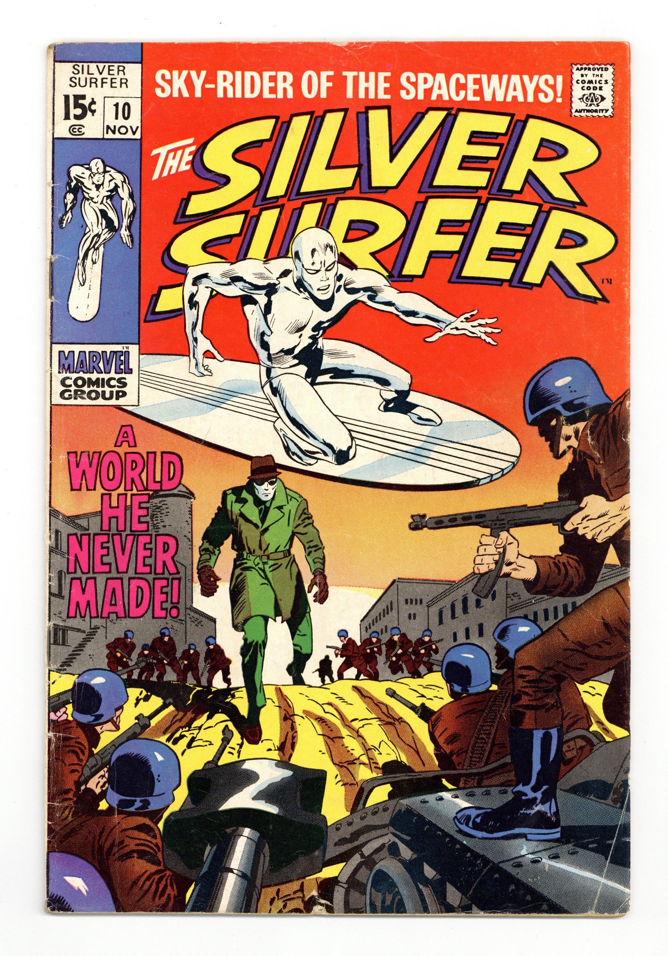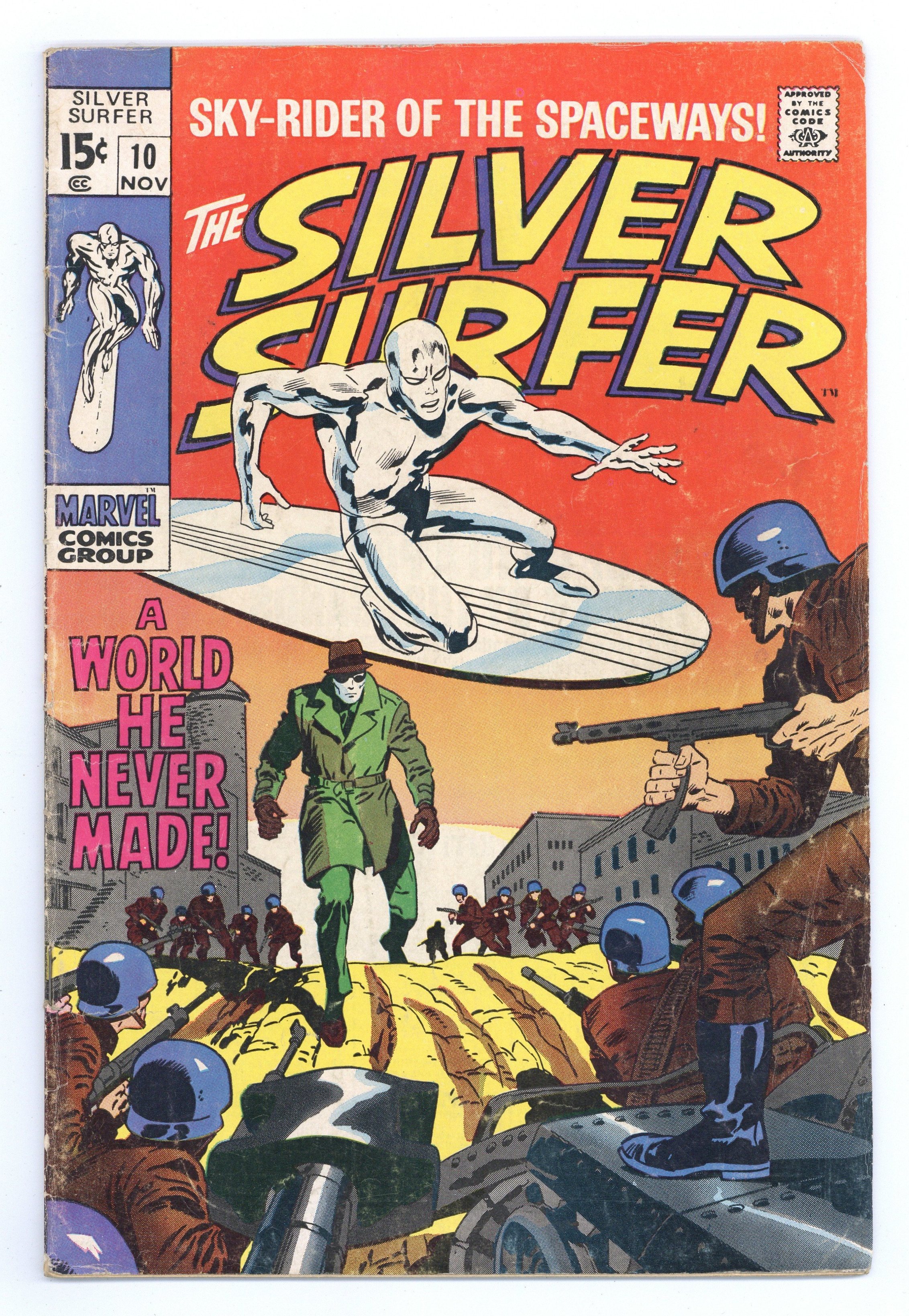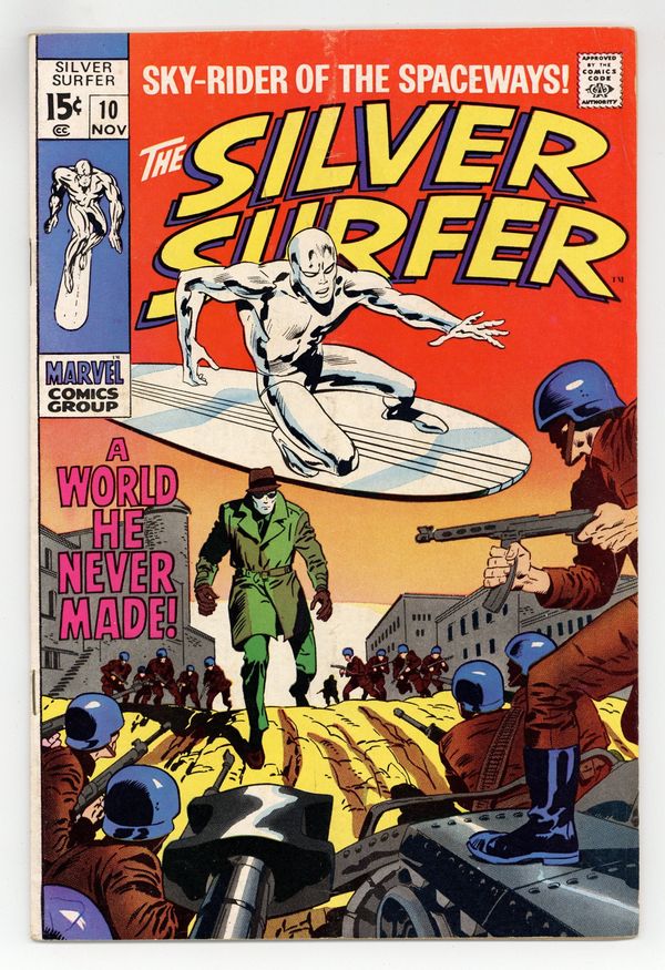 "A World he Never Made!" Part 1 of 2. Written by Stan Lee. Art by John Buscema and Dan Adkins. In an effort to better understand mankind, the Silver Surfer ventures among them, incognito. Cover price $0.15.