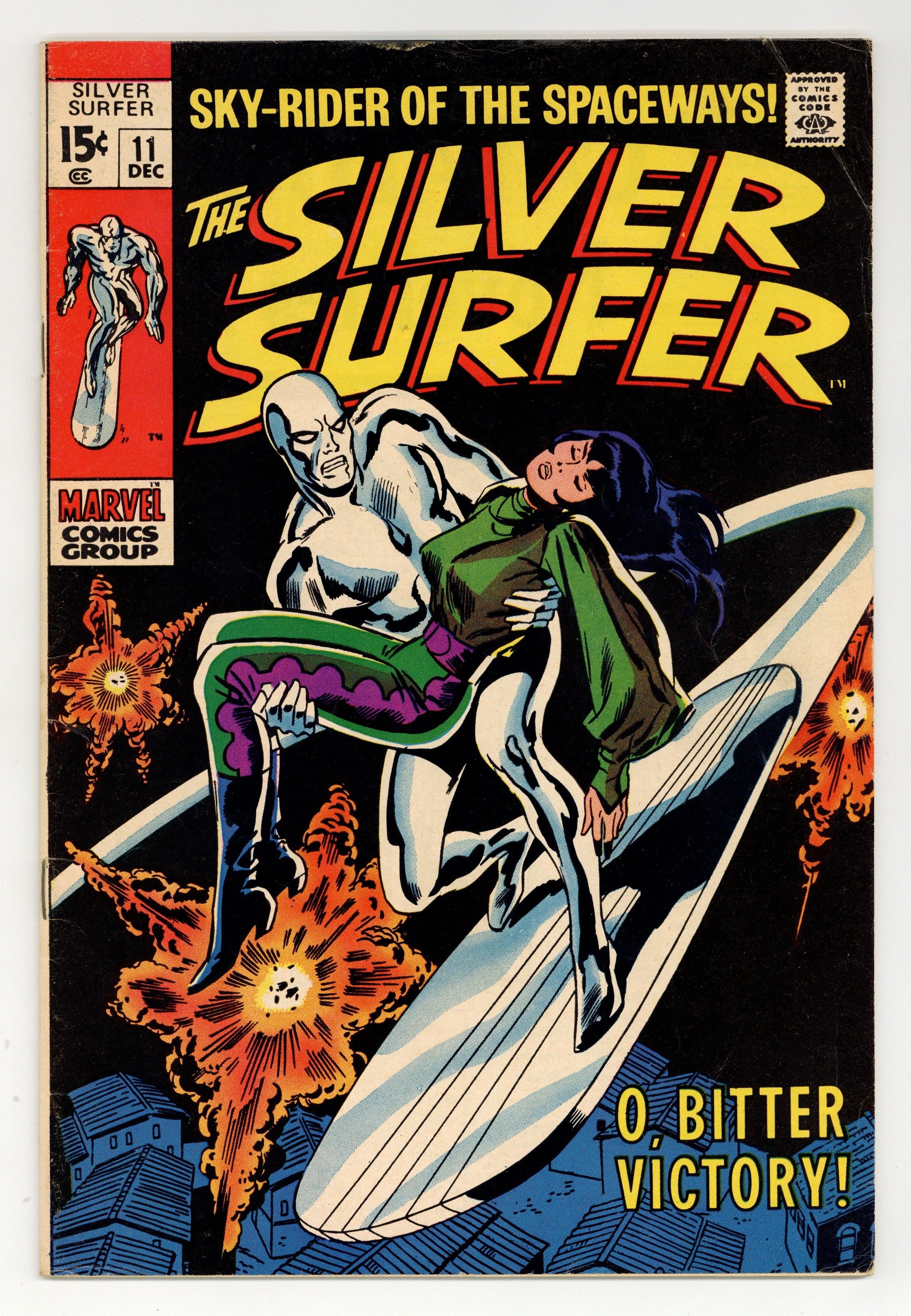 "O, Bitter Victory!" Part 2 of 2. Written by Stan Lee. Art by John Buscema and Dan Adkins. When a madman puts the Silver Surfer's true love's life in jeopardy, Norrin Radd does the only thing he can...send her back to Zen-La where she'll be safe, and perhaps lost to him forever. Cover price $0.15.