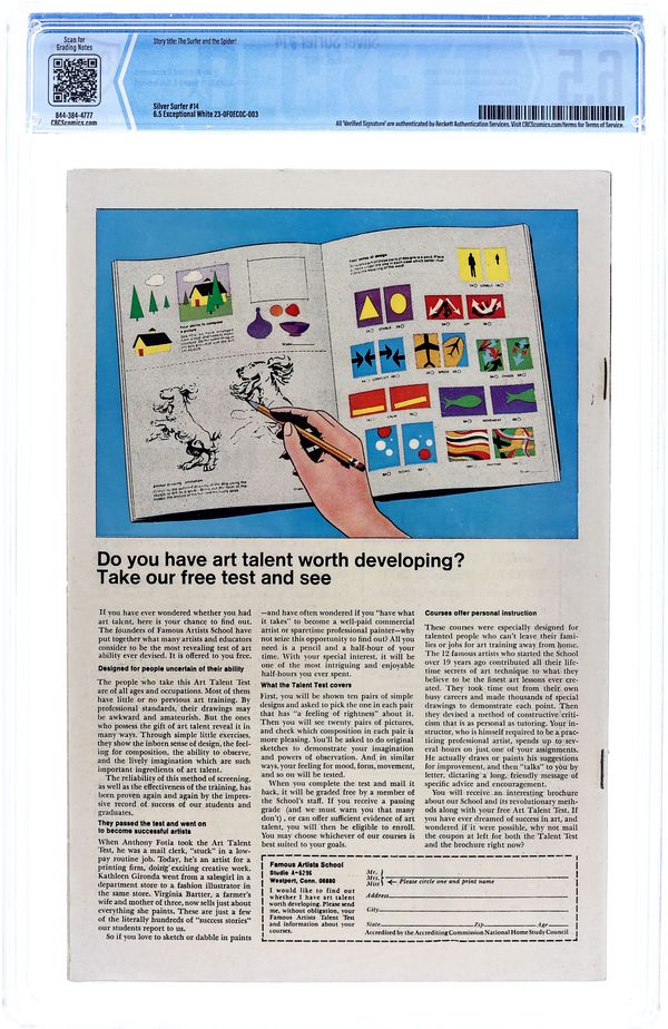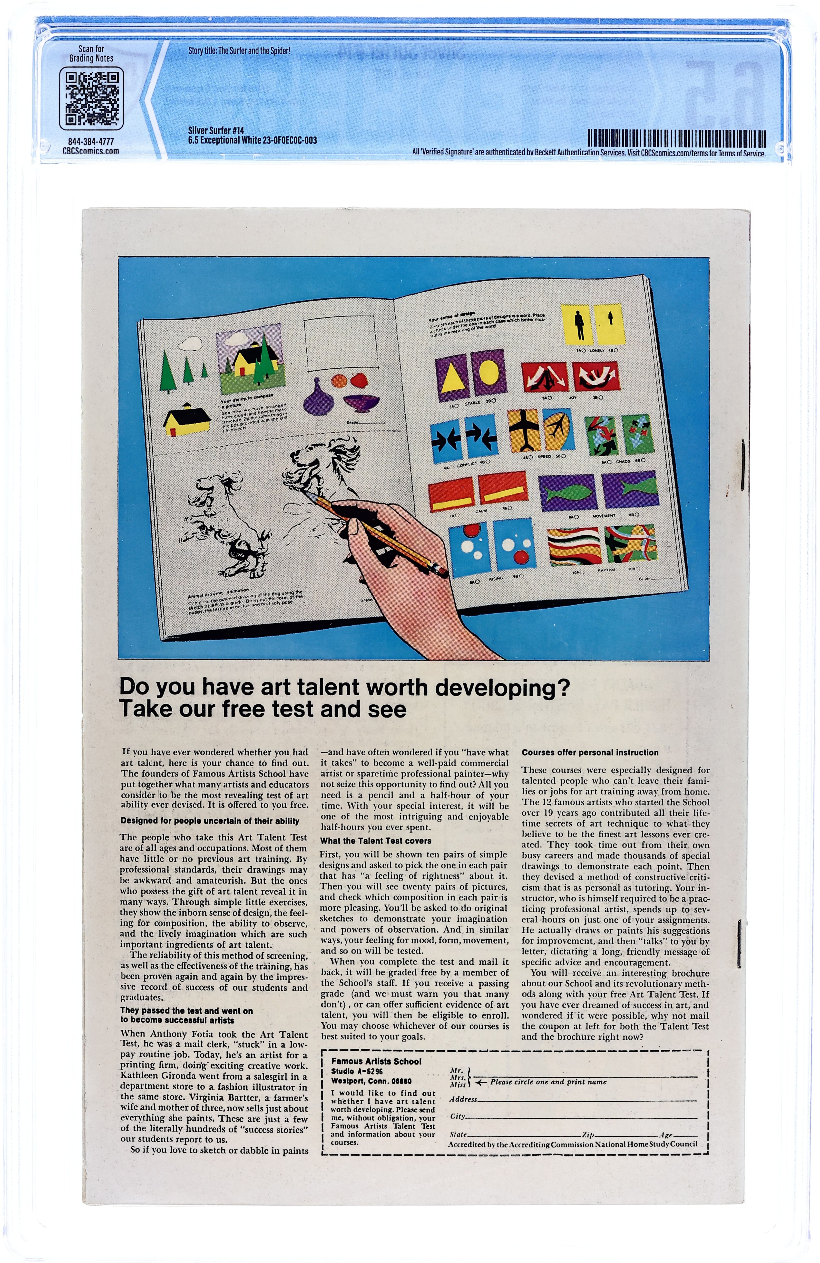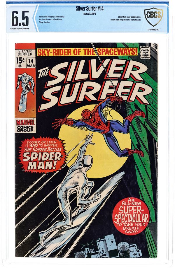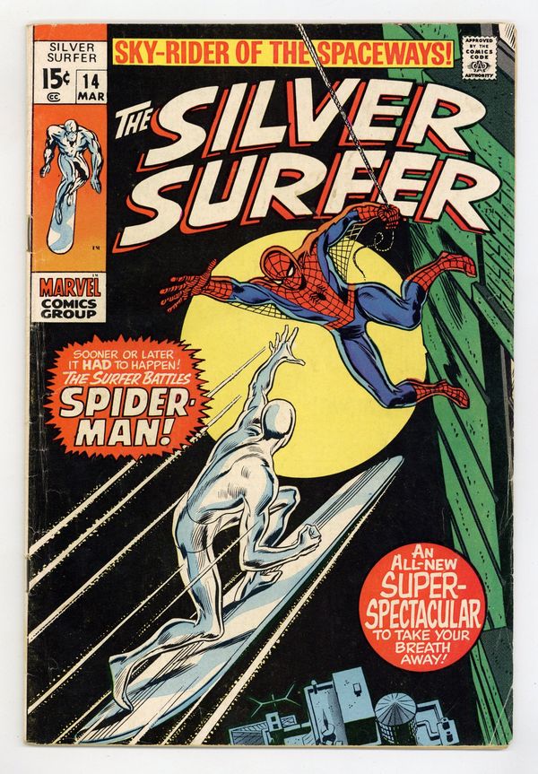 "The Surfer and the Spider!" Guest-starring Spider-Man. Captain America cameo. Written by Stan Lee. Art by John Buscema and Dan Adkins. A misunderstanding sets the Amazing Spider-Man against the awesome power of the Silver Surfer. Letters to the editor from comic writers Doug Moench and Alan Brennert. Cover price $0.15.