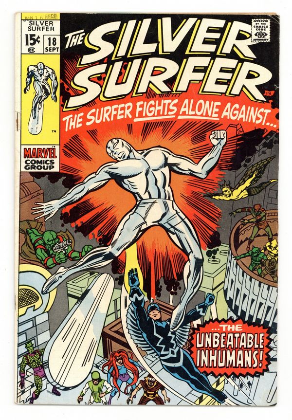 "To Smash the Inhumans!" Final issue of the series. Guest-starring the Inhumans. Script by Stan Lee. Pencils by Jack Kirby. Inks by Herb Trimpe. Cover by Herb Trimpe (with possible layouts or pencils by Marie Severin.) The Silver Surfer renounces his peaceful ways and decides to fight against mankind instead of with them! And despite their best efforts, the Inhumans cannot convince the cosmic sky-rider otherwise! Unfortunately, the story ends on a cliffhanger as the series was canceled. Appearances by Black Bolt, Medusa, Gorgon, Karnak, Triton, and Maximus. (Note: The surfer's next chronological appearance comes in Webspinners Tales of Spider-Man (1999) #4 where the dangling plotline (from 29 years earlier) is at last addressed.) 32 pages. Cover price $0.15.