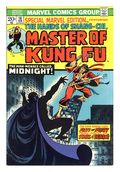 $14.00Final issue of the series. Story continues in Master of Kung Fu. Cover art by Jim Starlin. Midnight Brings Dark Death! starring Master of Kung Fu, script by Steve Englehart and Jim Starlin (co-plot), pencils by Jim Starlin (layouts, credited as "artist"), Al Milgrom (finished art, credited as "co-artist"), inks by Al Milgrom; Chi finds himself fighting against his father, and his father's thugs and dacoits. 36 pgs. $0.20. Cover price $0.20.