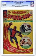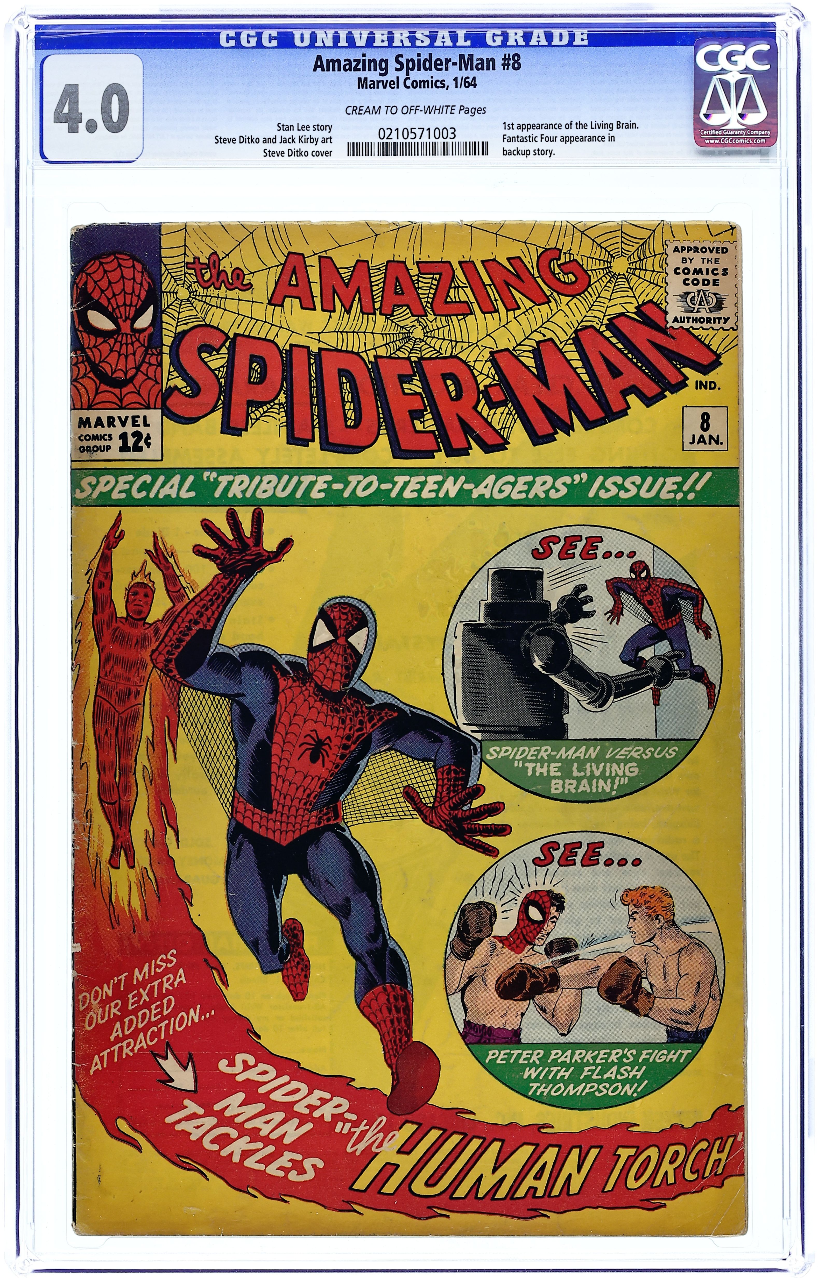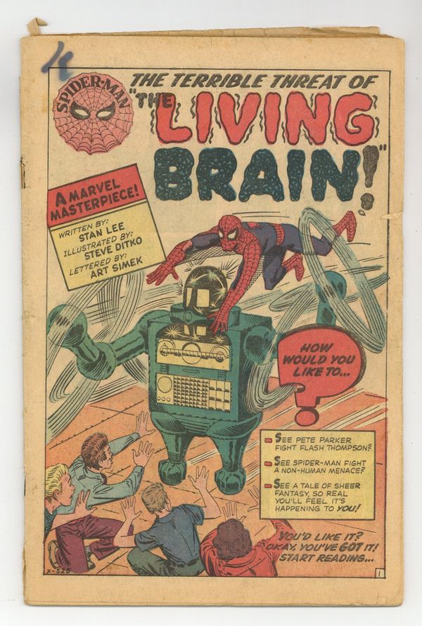 Cover art by Steve Ditko. First appearance of Mr. Petty (inventor of the Living Brain) in The Terrible Threat of the Living Brain!, script by Stan Lee, art by Steve Ditko; When two technicians try to steal a computer that is on display at Peter's school, they accidentally turn it into "The Living Brain" that goes wild and must be stopped by Spider-Man. Reprinted in Marvel Tales # 5 and #145. Spider-Man Tackles The Torch!, script by Stan Lee, pencils by Jack Kirby, inks by Steve Ditko; Spider-Man crashes a party at Johnny Storm's girlfriend's place, causing a fight between the Human Torch and Spider-Man that soon escalates to include the rest of the Fantastic Four. Letter to the editor from Buddy Saunders, president of MyComicShop, written to Marvel in his callow youth. 36 pgs. $0.12. Cover price $0.12.