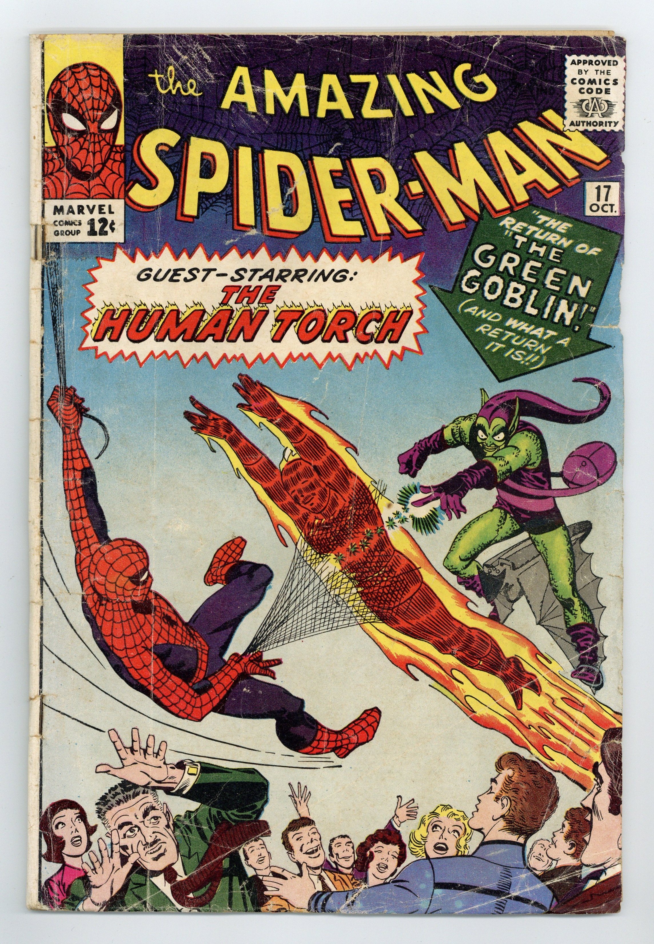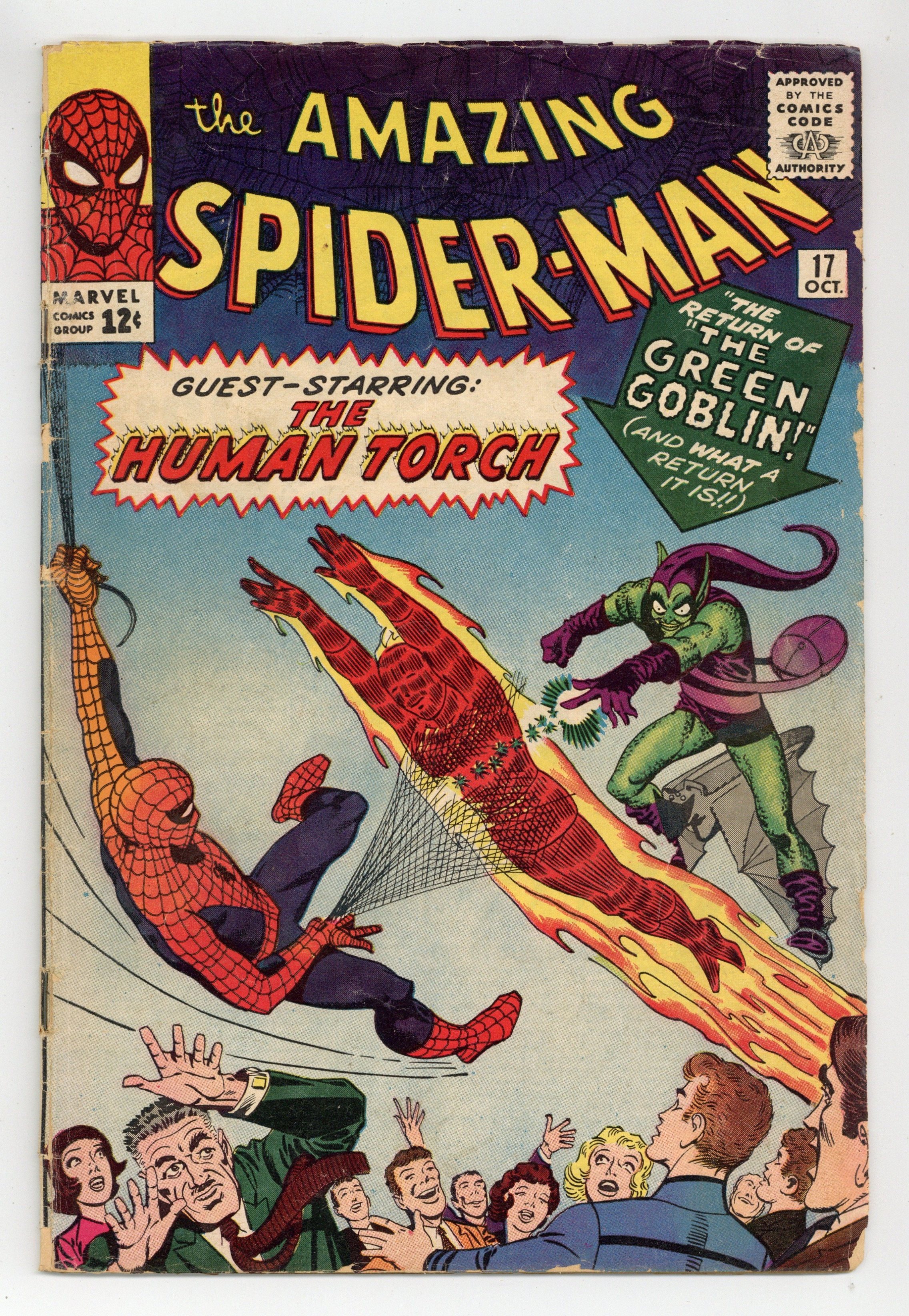 Cover art by Steve Ditko. Second appearance of the Green Goblin in The Return of the Green Goblin!, script by Stan Lee, art by Steve Ditko; Spider-Man attends a fan club meeting organized by Flash Thompson, but the Green Goblin crashes the meeting; Fortunately the Human Torch is in attendance to help Spider-Man; During the battle Spider-Man finds out that Aunt May is in the hospital and he leaves, causing everyone to believe that he is a coward. Reprinted in Marvel Tales # 12 and 155. Letter to the editor by comics writer Doug Moench. 36 pgs. $0.12. Cover price $0.12.