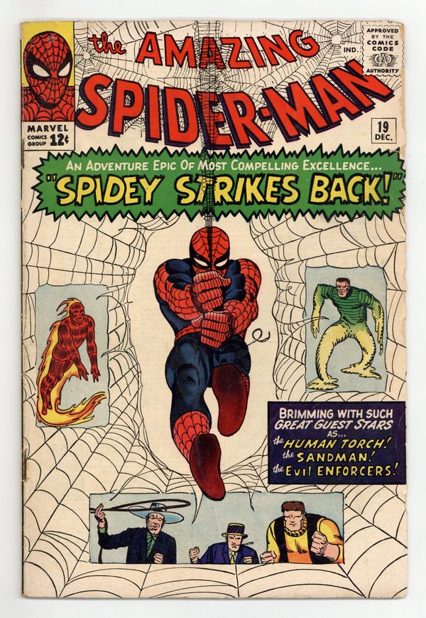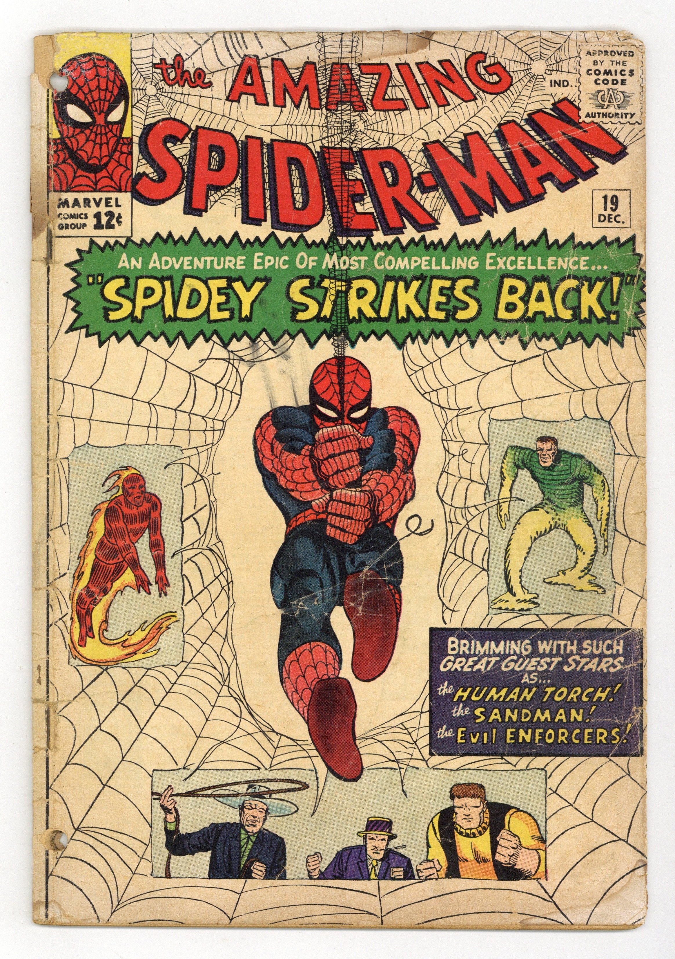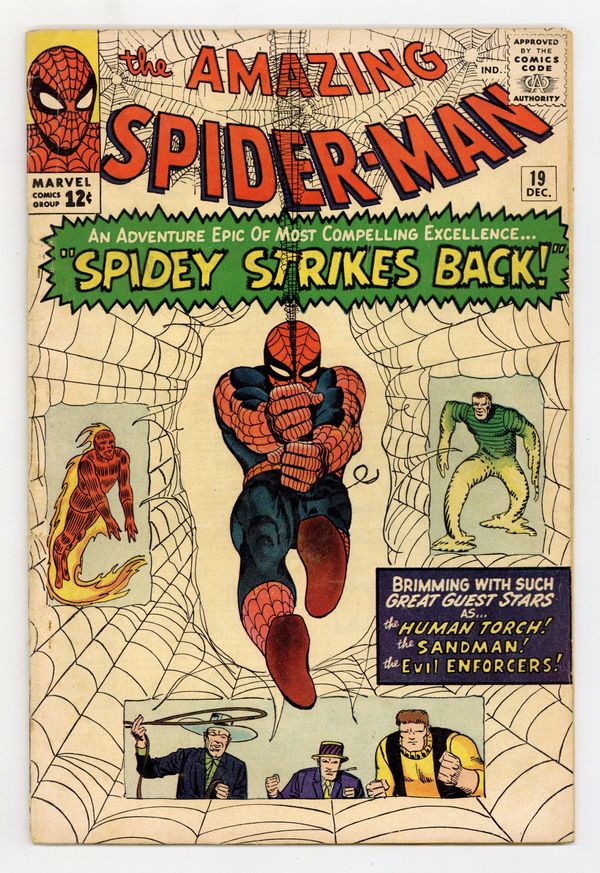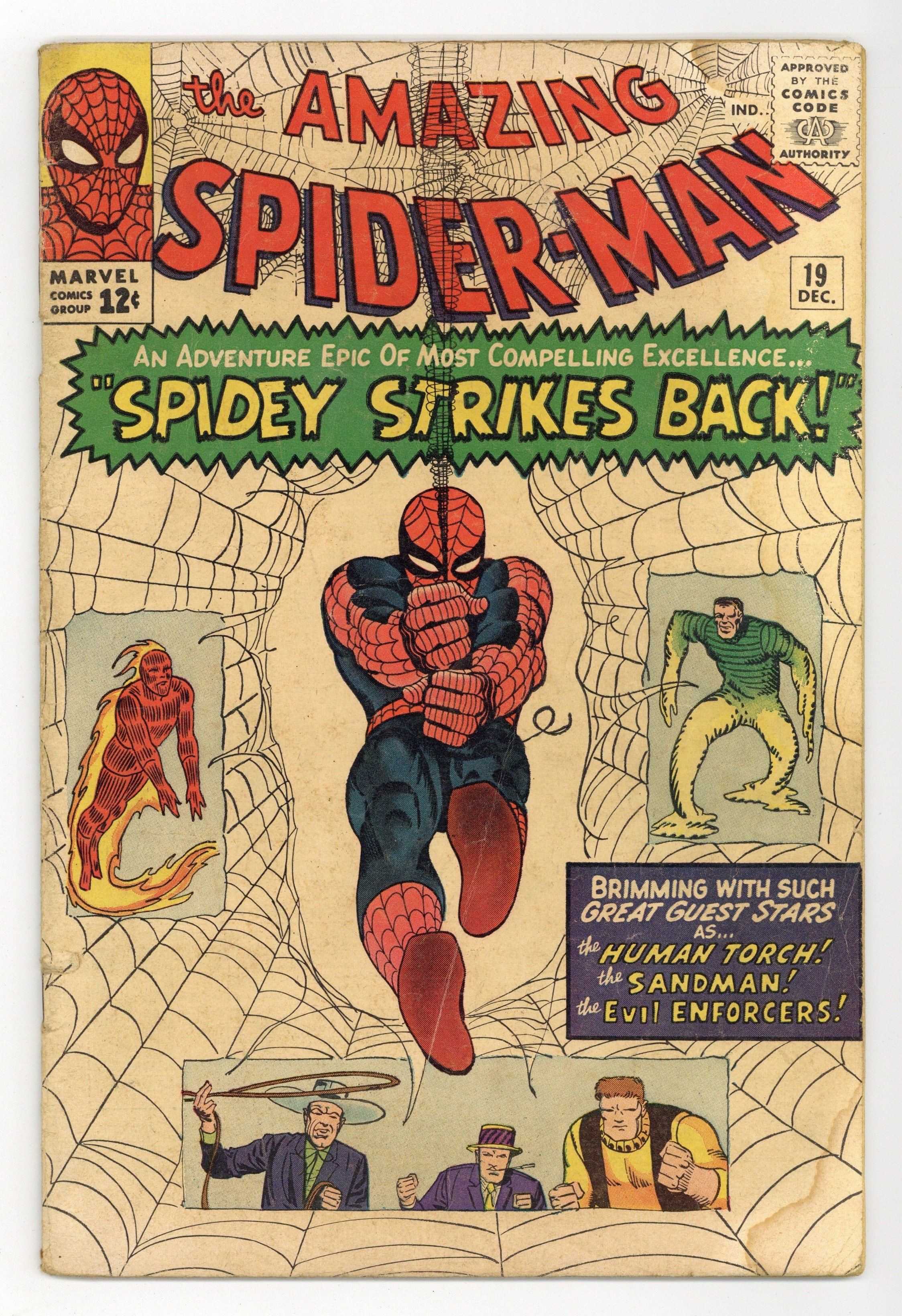 Cover art by Steve Ditko. Spidey Strikes Back!, script by Stan Lee, art by Steve Ditko; Sandman and the Enforcers capture the Human Torch; When Spider-Man questions a stool pigeon and learns of this he comes to the aid of the Human Torch. Second appearance of Ned Leeds (future Hobgolin) in this issue (first time his name is revealed). Reprinted in Marvel Tales # 14 and 157. 36 pgs. $0.12. Cover price $0.12.