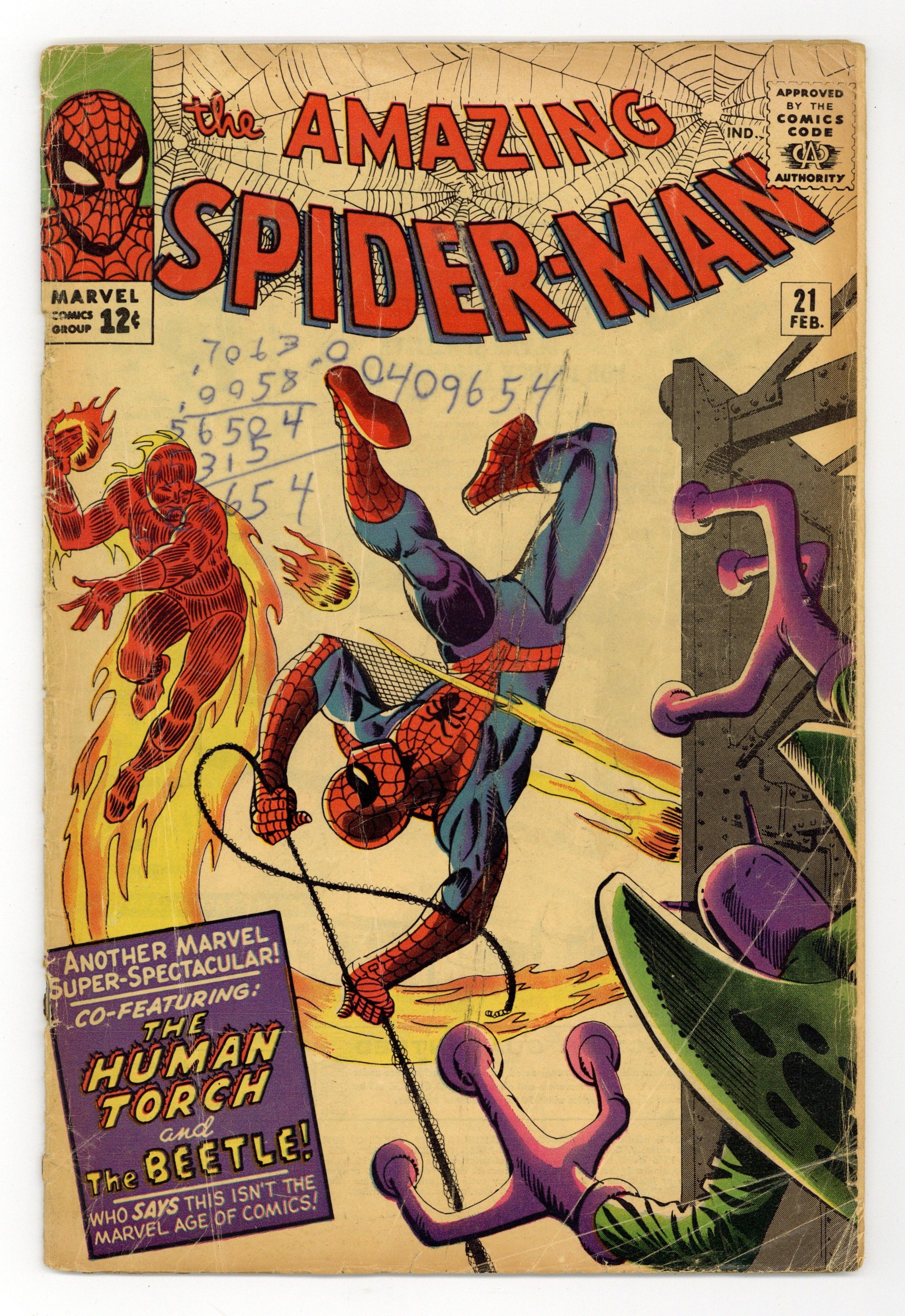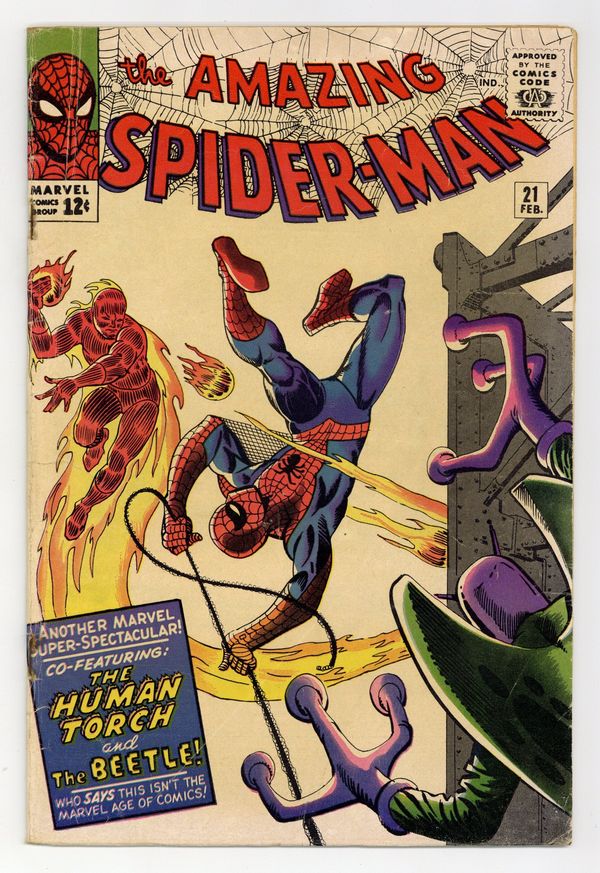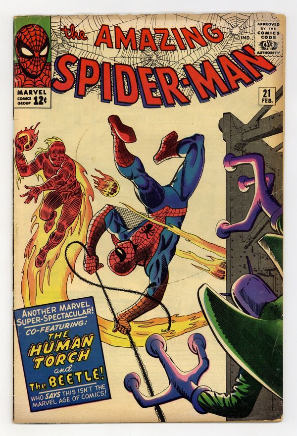Cover art by Steve Ditko. Second appearance of the Beetle in Where Flies the Beetle...!, script by Stan Lee, art by Steve Ditko; after getting out of jail, Abner Jenkins dons his Beetle guise and prepares for revenge on the Human Torch; drama between Johnny Storm and Doris Evans and Peter Parker and Betty Brant; Human Torch teams with Spidey against Beetle. Reprinted in Marvel Tales # 16 and 159. Spider-Man pin-up by Ditko. 36 pgs. $0.12. Cover price $0.12.