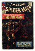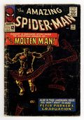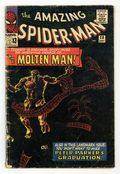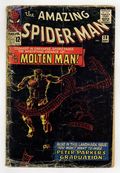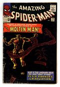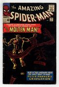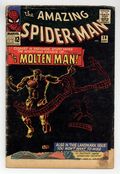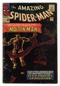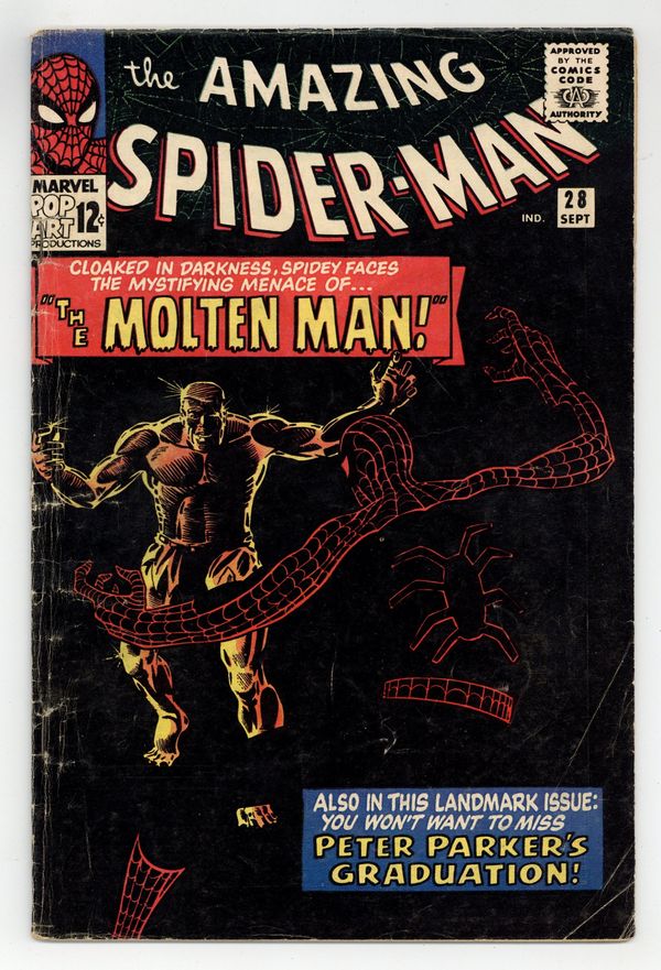 Tags: Marvel Legacy Numbering: Amazing Spider-Man (part 28), Spider-Man$130.00Cover art by Steve Ditko. First appearance of the Molten Man in "The Menace of the Molten Man!", script by Steve Ditko (plot) and Stan Lee (script), art by Steve Ditko; Peter Parker needs his old costume, so he goes to the lab of the inventor Smythe, who created the robot J. Jonah Jameson used to try and beat Spiderman with; During that battle Parker had to remove his costume in order to escape; While there he witnesses an argument between Smythe and a man named Raxton, which results in an accident turning Raxton into, the Molten Man; At first Raxton is confused when he walks out of the lab, but on the street he gets mad at a driver and smashes the car with his fists; Realizing his power Raxton decides he can be a super villain, but before he can do anything Spiderman comes in through his window and asks Raxton to turn himself in stating that so far no major crimes have been committed; A fight ensues; Peter graduates from high school. The Merry Marvel Bullpen Page. Reprinted in Marvel Tales #166. This is a very difficult book to find in the higher grades because the black cover easily shows virtually every imperfection, no matter how minor. 36 pgs., full color. Cover price $0.12.