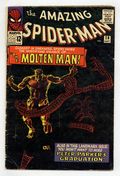 Ends Jan 13 7:15 PM CST Bid History 23 bids Current Bid $4,750 Your Secret Max Bid If you'd like to bid, please log in or register. Cover art by Steve Ditko. First appearance of the Molten Man in "The Menace of the Molten Man!", script by Steve Ditko (plot) and Stan Lee (script), art by Steve Ditko; Peter Parker needs his old costume, so he goes to the lab of the inventor Smythe, who created the robot J. Jonah Jameson used to try and beat Spiderman with; During that battle Parker had to remove his costume in order to escape; While there he witnesses an argument between Smythe and a man named Raxton, which results in an accident turning Raxton into, the Molten Man; At first Raxton is confused when he walks out of the lab, but on the street he gets mad at a driver and smashes the car with his fists; Realizing his power Raxton decides he can be a super villain, but before he can do anything Spiderman comes in through his window and asks Raxton to turn himself in stating that so far no major crimes have been committed; A fight ensues; Peter graduates from high school. The Merry Marvel Bullpen Page. Reprinted in Marvel Tales #166. This is a very difficult book to find in the higher grades because the black cover easily shows virtually every imperfection, no matter how minor. 36 pgs., full color. Cover price $0.12.