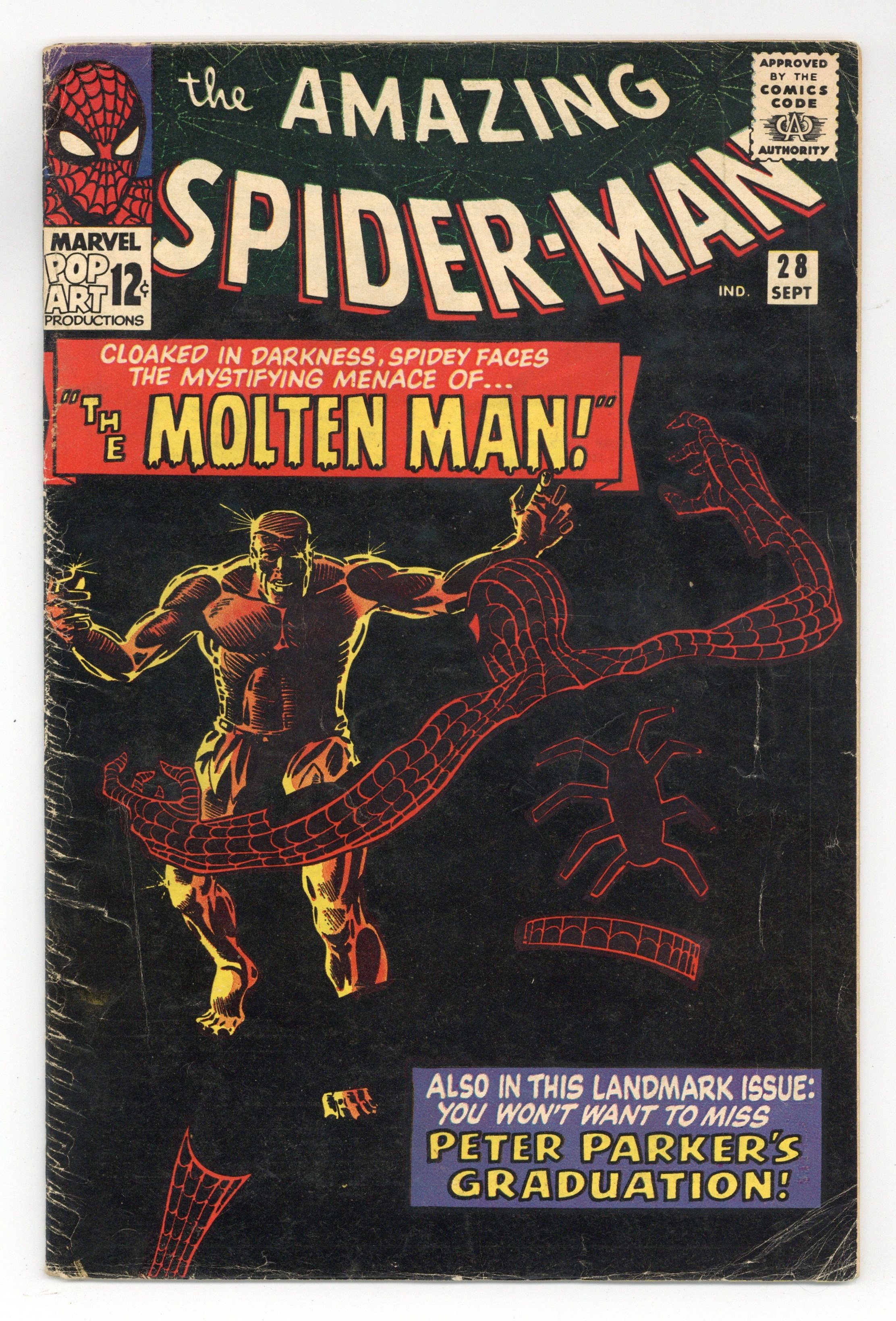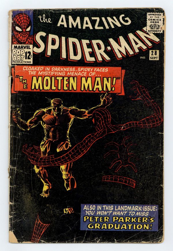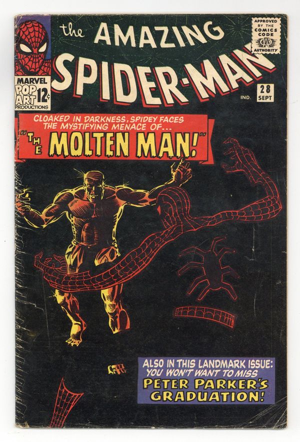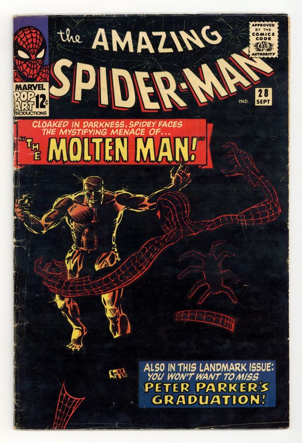 Tags: Marvel Legacy Numbering: Amazing Spider-Man (part 28), Spider-Man$100.00Cover art by Steve Ditko. First appearance of the Molten Man in "The Menace of the Molten Man!", script by Steve Ditko (plot) and Stan Lee (script), art by Steve Ditko; Peter Parker needs his old costume, so he goes to the lab of the inventor Smythe, who created the robot J. Jonah Jameson used to try and beat Spiderman with; During that battle Parker had to remove his costume in order to escape; While there he witnesses an argument between Smythe and a man named Raxton, which results in an accident turning Raxton into, the Molten Man; At first Raxton is confused when he walks out of the lab, but on the street he gets mad at a driver and smashes the car with his fists; Realizing his power Raxton decides he can be a super villain, but before he can do anything Spiderman comes in through his window and asks Raxton to turn himself in stating that so far no major crimes have been committed; A fight ensues; Peter graduates from high school. The Merry Marvel Bullpen Page. Reprinted in Marvel Tales #166. This is a very difficult book to find in the higher grades because the black cover easily shows virtually every imperfection, no matter how minor. 36 pgs., full color. Cover price $0.12.