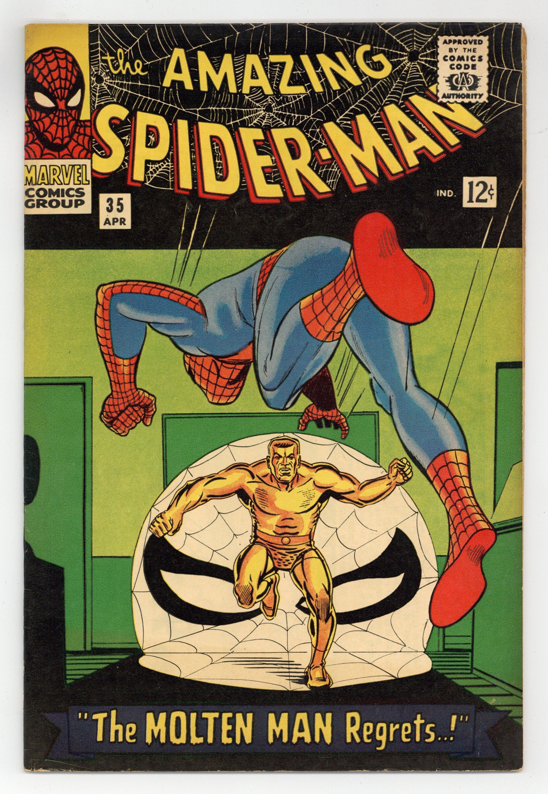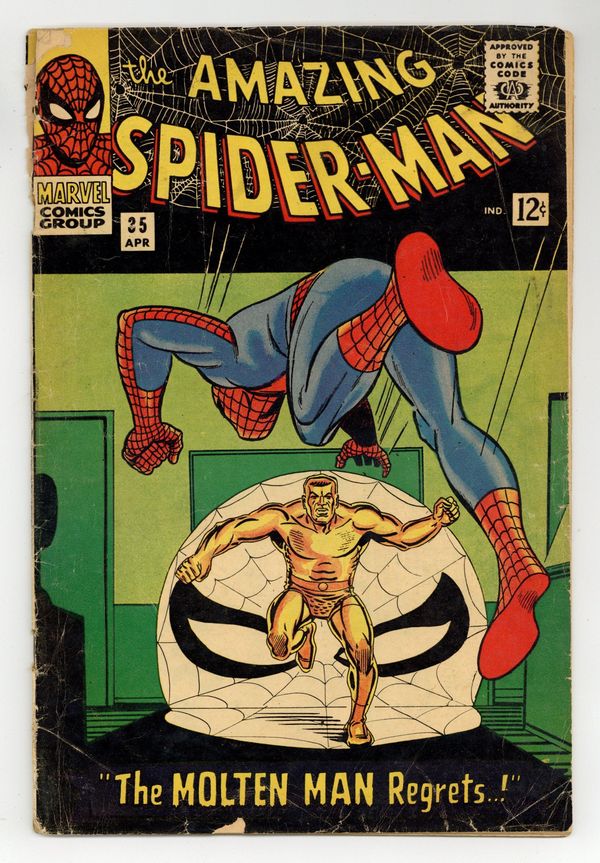 Cover pencils by Steve Ditko and Jack Kirby (Spider-Man figure), inks by Steve Ditko and Sol Brodsky (Spider-Man figure). The Molten Man Regrets...!, script by Steve Ditko (plot) and Stan Lee (script), art by Steve Ditko; The Molten Man is released from jail and he decides he is going to be smarter about his next robbery, but Spider-Man puts an end to his plans. Ad for Hulk T-Shirt and other MMMS items, art by Steve Ditko, Jack Kirby, and Frank Giacoia. Reprinted in Marvel Tales # 28 and 174. 36 pgs., full color. $0.12. Cover price $0.12.