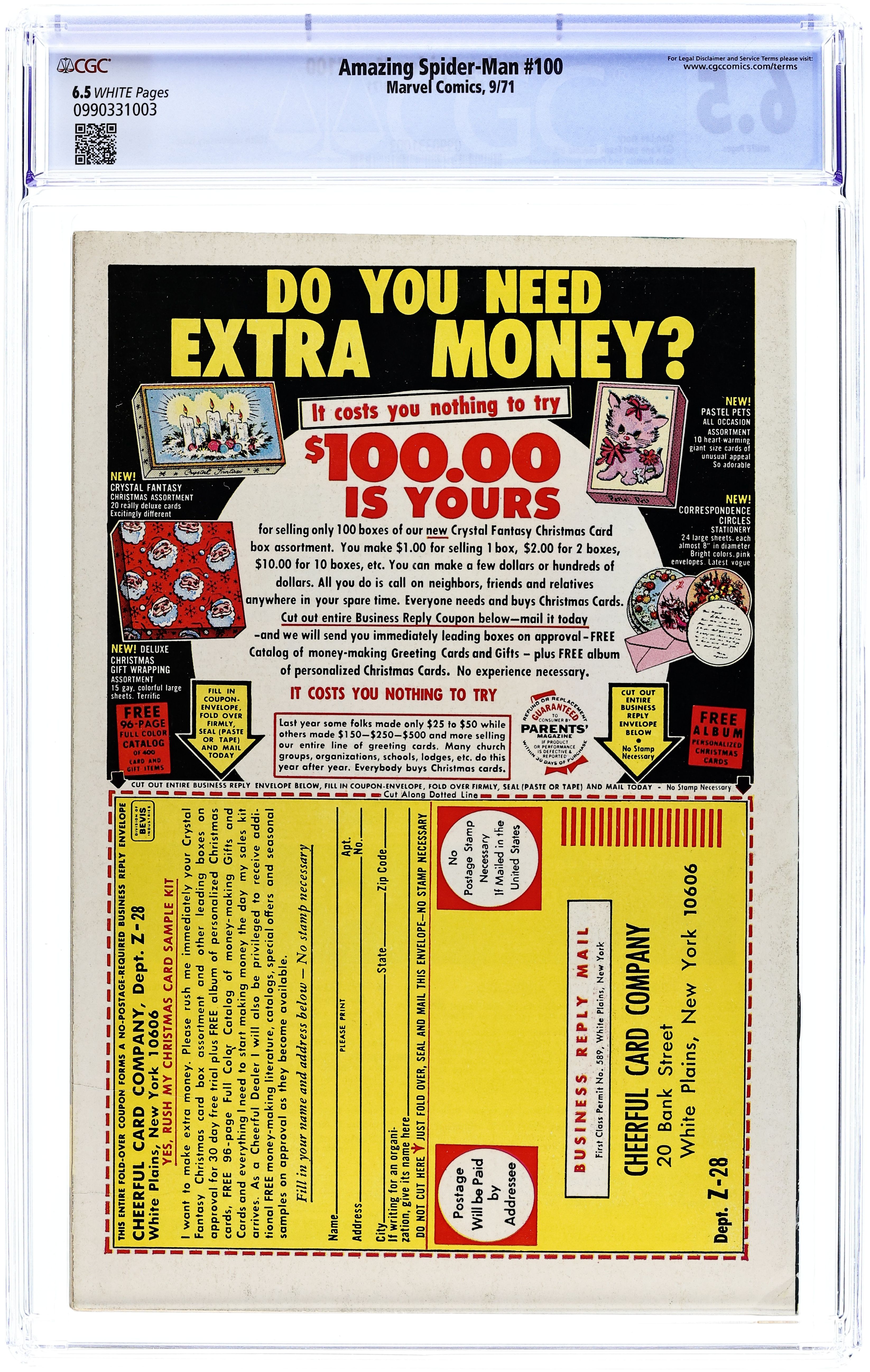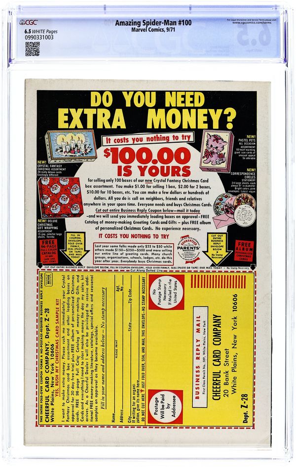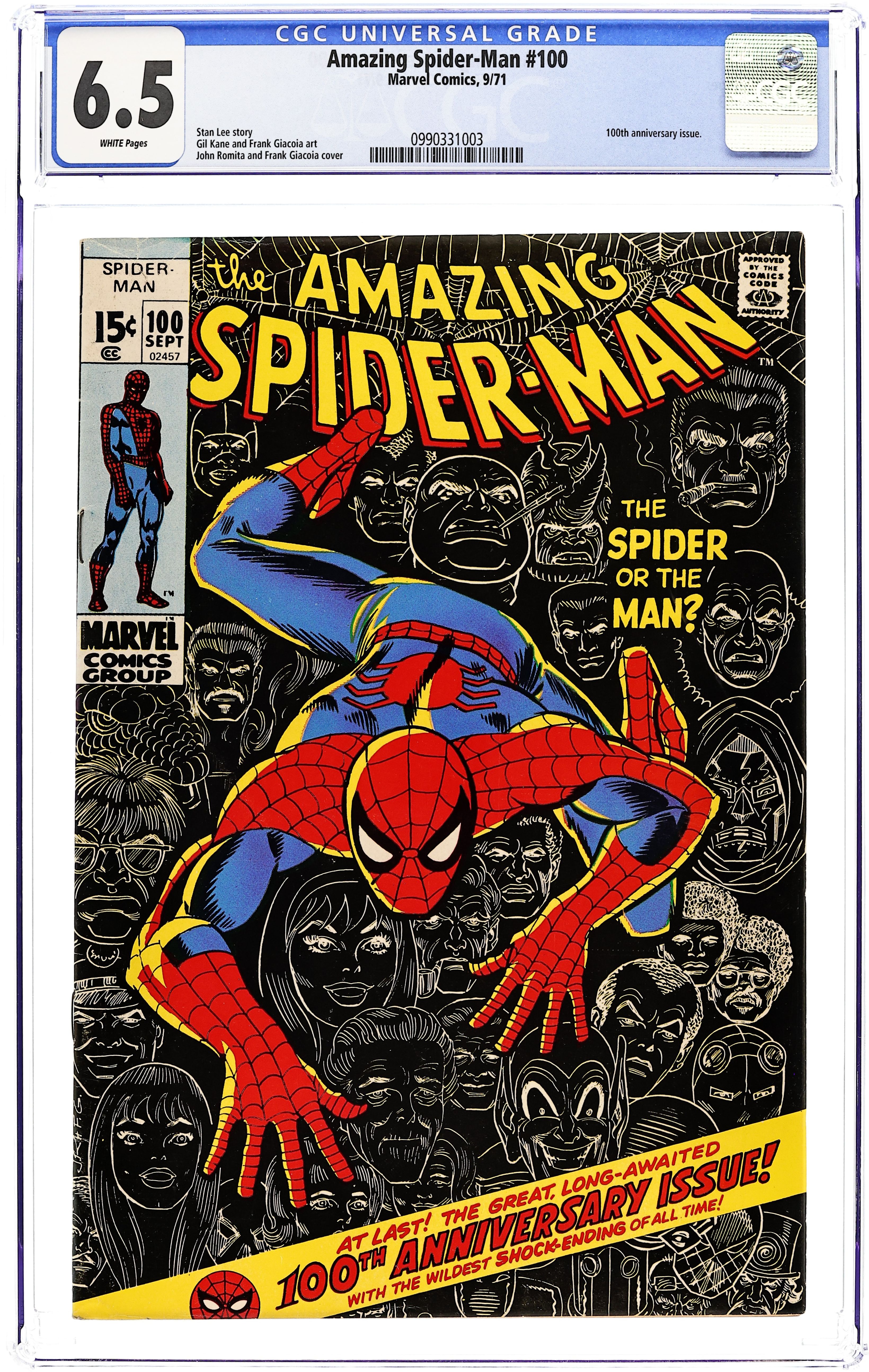 Ends Dec 8 7:16 PM CST Bid History 4 bids Current Bid $49 Your Secret Max Bid If you'd like to bid, please log in or register. "The Spider of the Man?" Script by Stan Lee. Pencils by Gil Kane. Inks by Frank Giacoia and Tony Mortellaro (backgrounds). Cover by John Romita and Frank Giacoia. It's the 100th anniversary issue of the Amazing Spider-Man title -- with an all-time cover! Peter Parker wants to live a normal life with Gwen Stacy. But he doesn't think he can as long as he has his spider-powers. So, with that thought in mind, the young scientist creates a special potion -- which he believes will eliminate his remarkable abilities. After Peter drinks the potion, he lies down to sleep. And when he wakes up...he gets the biggest shock of his amazing life! Flashback cameos by Aunt May, J. Jonah Jameson, Betty Brant, Gwen Stacy, and Captain Stacy. (Notes: There have been many homages to John Romita's classic cover including the covers to Marvel Tales 100, Ultimate Spider-Man (2000) 100B, and Peter Parker (2017) #1EBAY. This story was reprinted in Marvel Treasury Edition #14 and Marvel Tales 253.) 36 pages. Cover price $0.15.