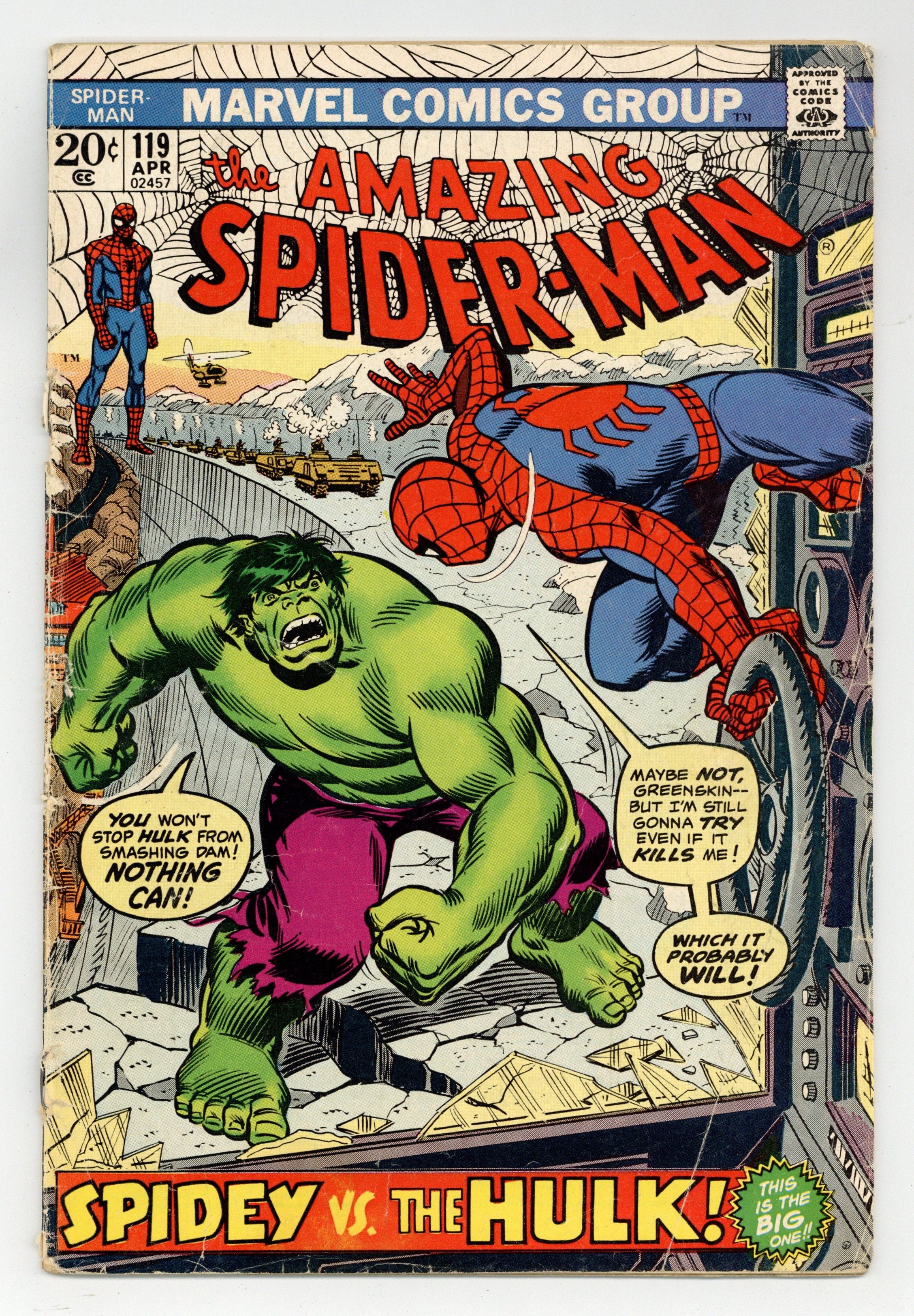 "The Gentleman's Name is...Hulk!" Part 1 of 2. Guest-starring the Hulk. Script by Gerry Conway. Pencils by John Romita. Inks by John Romita and Tony Mortellaro (backgrounds). Cover by John Romita. The Amazing Spider-Man vs. the Incredible Hulk! Wow! But how did the two combatants meet in Canada of all places? A few days ago, a mysterious telegram arrived from Montreal for May Parker. At first Peter was going to show it to his aunt, however he changed his mind upon realizing the telegram could beconnected to Dr. Octopus! The web-slinger wants to go to Quebec to investigate, but he needs money for airfare. Luckily, Peter convinces J. Jonah Jameson to send him north of the border to photograph the Hulk (in a peaceful manner). But thanks to Thunderbolt Ross and the Canadian military, the Hulk is already on a rampage! And your friendly neighborhood Spider-Man has to stop him! Cameo appearances by Aunt May, Harry Osborn, Norman Osborn, Betty Brant, and Ned Leeds. (Notes: John Romita is credited as a co-plotter. Spider-Man and the Hulk previously battled in Amazing Spider-Man Annual #3.) 36 pages. Cover price $0.20.