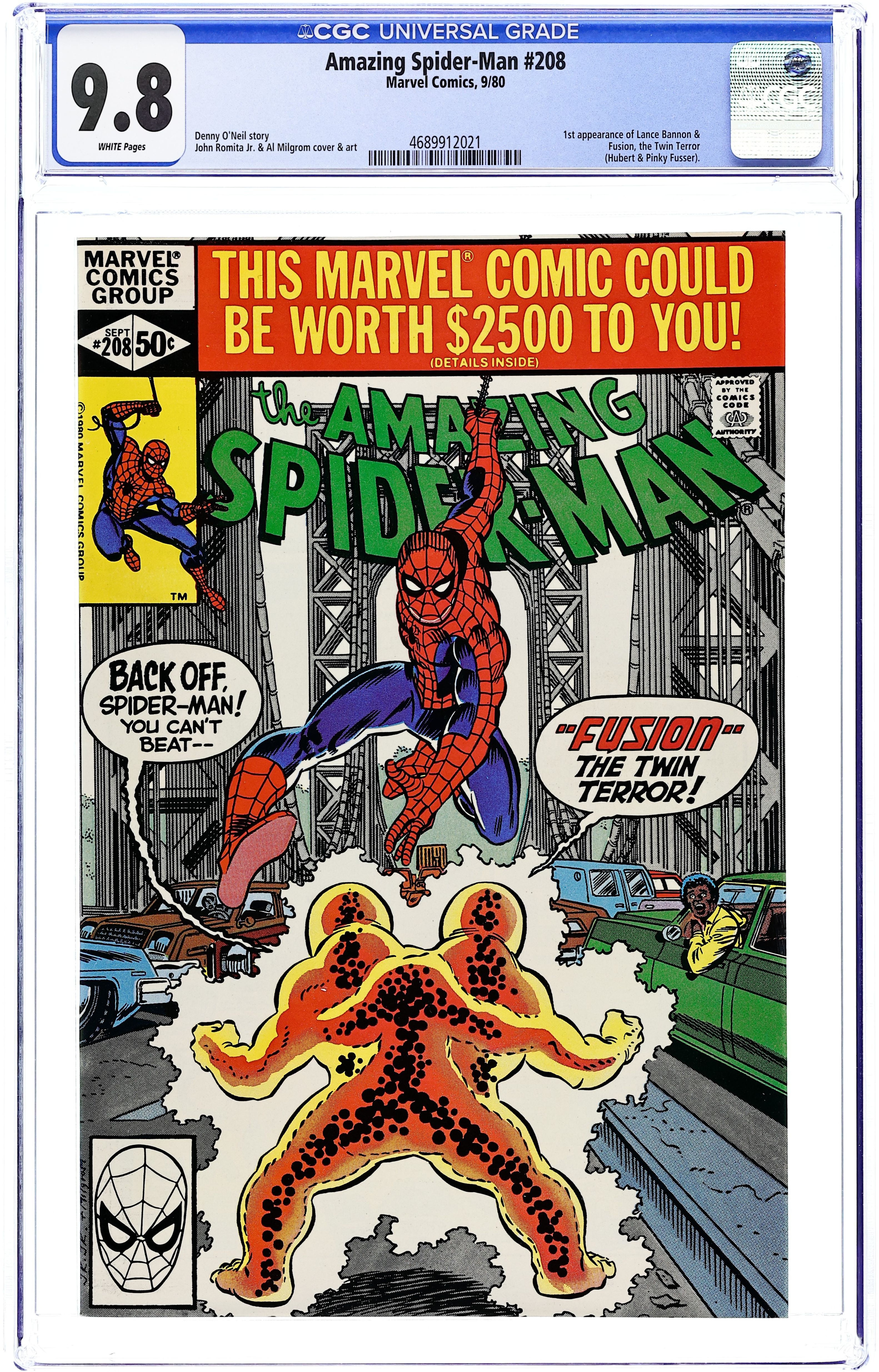 Direct Edition. "Fusion!" Plot by Jim Shooter and Mark Gruenwald. Script by Denny O'Neil. Art by John Romita Jr. (layouts), Al Milgrom (finishes), and Brett Breeding (finishes). Cover by John Romita Jr. and Al Milgrom. A freak atomic accident creates a new adversary for the Spectacular Spider-Man! Fusion...the twin terror! The little dynamo is wreaking havoc through New York City and charting a course for the Indian Point nuclear power plant across the Hudson! Now the wall-crawler did not study nuclear physics at Empire State University, but he does know that the key to stopping Fusion...is fission! Can your friendly neighborhood Spider-Man divide and conquer the glowing twin terror? First appearance of Lance Bannon. Cameo appearances by Aunt May and Anna Watson. First 50¢ issue. (Note: This issue features John Romita Jr.'s first artwork on the Amazing Spider-Man (1st) series.) 36 pages. Cover price $0.50.