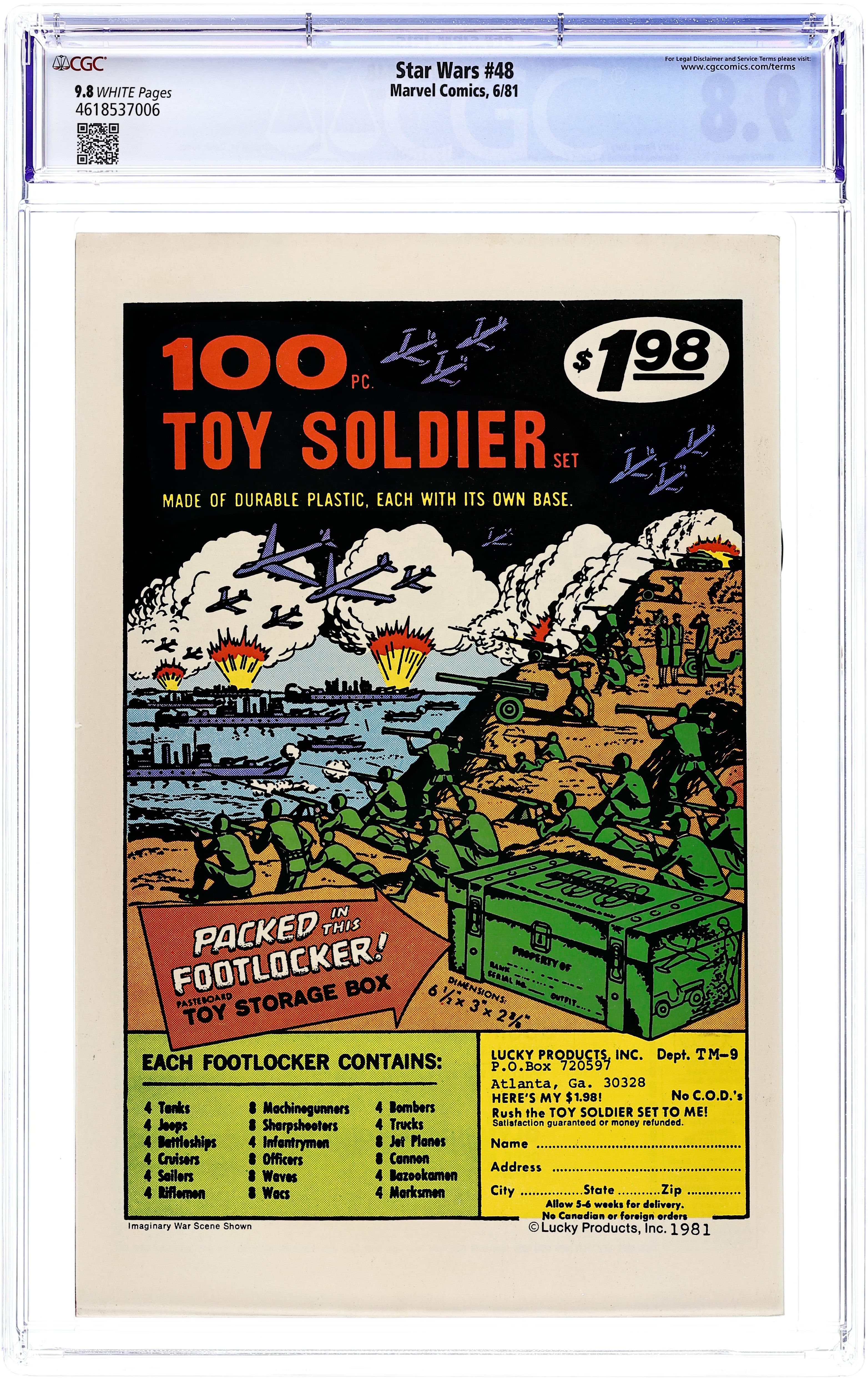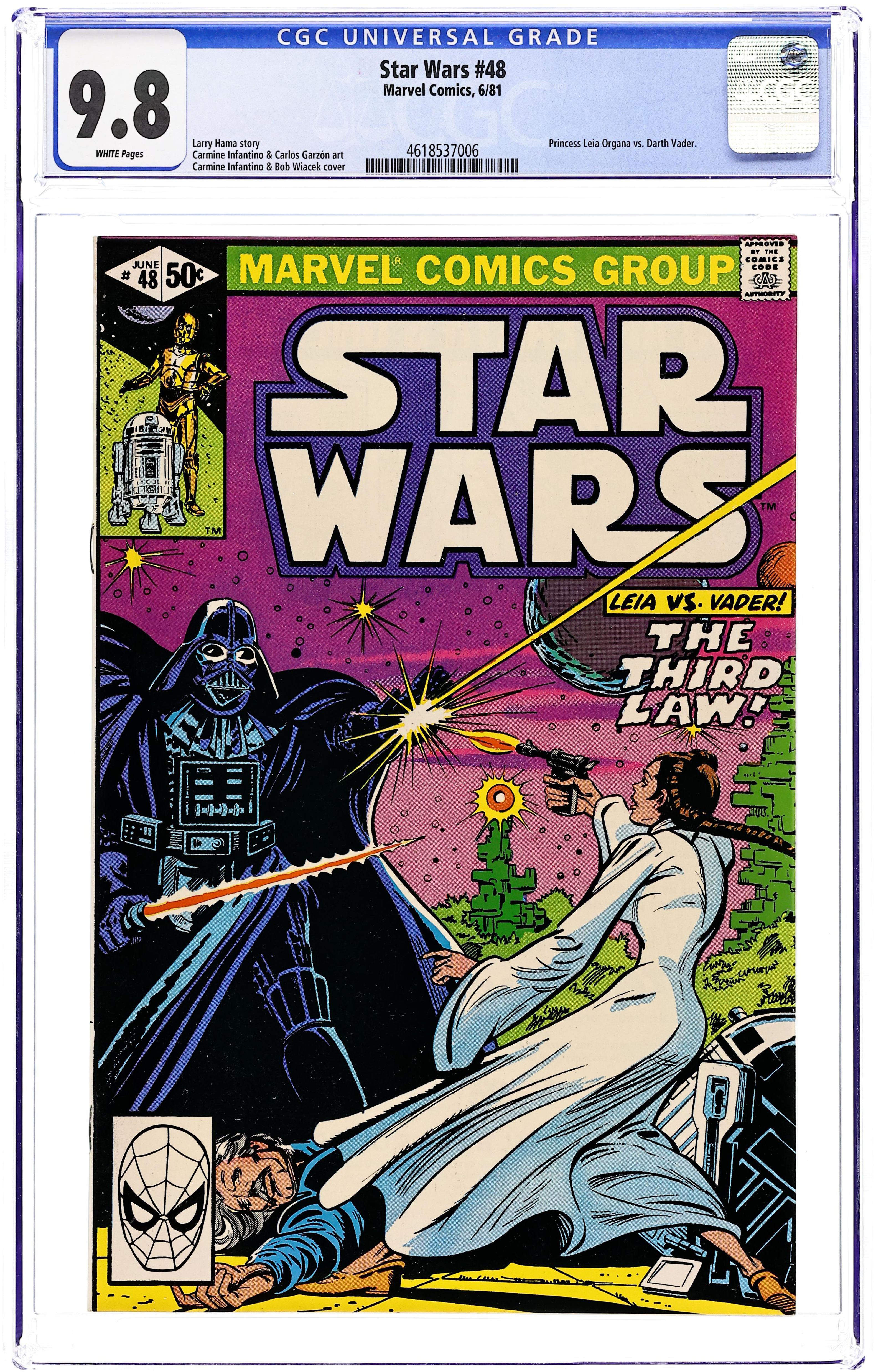 Cover pencils by Carmine Infantino, inks by Bob Wiacek. "The Third Law," script by Larry Hama, pencils by Carmine Infantino (breakdowns) and Carlos Garzon (finished art), inks by Carlos Garzon; Darth Vader and Leia face off in a gambit involving X-Wing fighters the Rebellion sorely needs and priceless jewels! 36 pgs., full color. Cover price $0.50.