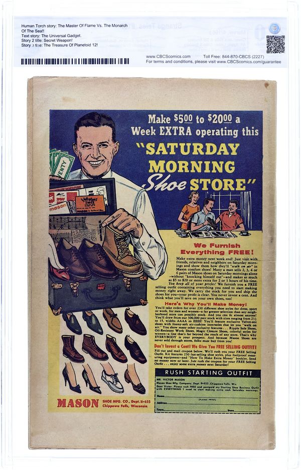 Cover pencils by Jack Kirby, inks by Sol Brodsky. In this issue, the epic battle long demanded by comic fans! The Human Torch and the Sub-Mariner square off in " "The Master of Flame vs. The Monarch of the Sea!!", script by Stan Lee (plot) and Larry Lieber (script), art by Dick Ayers; The Human Torch goes looking for Sub-Mariner in order to beat him and win more respect; He traps Sub-Mariner beneath the ocean floor and returns to the surface. "The Universal Gadget" text story. "Secret Weapon!", script by Stan Lee (plot) and Larry Lieber (script), pencils by Larry Lieber, inks by Sol Brodsky; A Soviet spy steals a gas intended to make the US leadership invulnerable, and uses it on the Soviet leaders; They find that it is a trap and the gas shrinks them to the size of insects. Statement of ownership; Average circulation per issue published October 1961–September 1962: 136,637. "The Treasure of Planetoid 12!", script by Stan Lee, art by Steve Ditko; In the year 2100 a criminal hijacks a spaceship to be the first man to claim the treasure of Planetoid 12; When he gets there, he finds nothing but water and mud. 36 pgs., full color. Cover price $0.12.