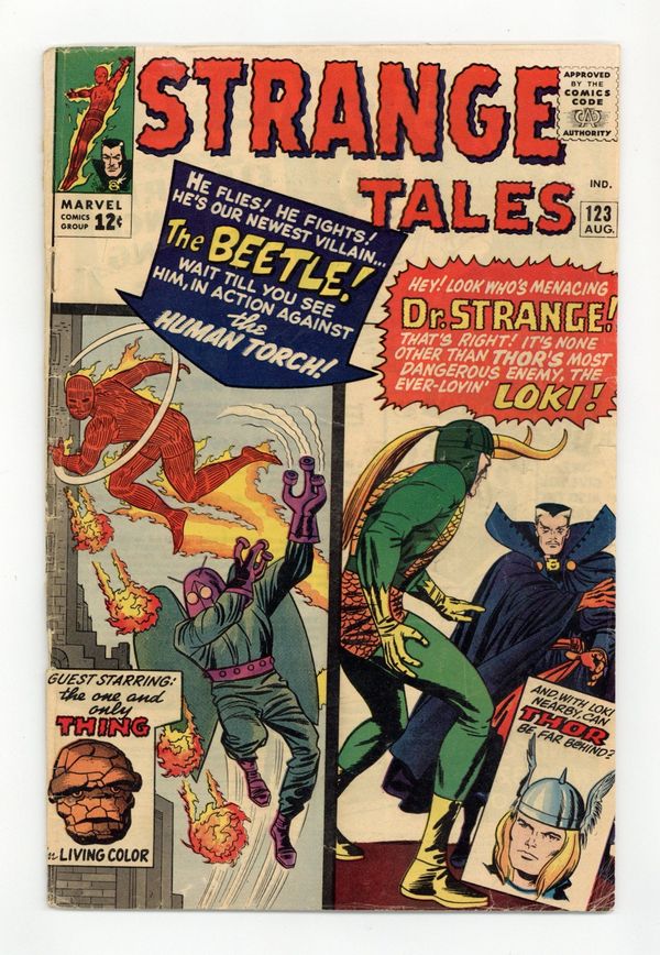 Ends Dec 22 9:29 PM CST Bid History 22 bids Current Bid $121 Your Secret Max Bid If you'd like to bid, please log in or register. Cover pencils by Jack Kirby, inks by Sol Brodsky. First appearance of the Beetle in the Human Torch story, "The Birth of the Beetle!", script by Stan Lee, pencils by Carl Burgos, inks by Dick Ayers; Mechanic-inventor Abner Jenkins creates the identity of The Beetle; While taking the Fantasti-Car for a double-date, Johnny & Ben wind up being humiliated by The Beetle; Guest starring the Thing. "The Challenge of Loki!", script by Stan Lee and Steve Ditko (co-plot), pencils by Steve Ditko, inks by George Roussos (as George Bell); Dr. Strange practices the art of levitation; Meanwhile, in faraway Asgard, home of the Norse Gods, Loki, God of Mischief, plots as always; He contacts Doctor Strange and tries to convince him that he is a prisoner of Thor, who is evil and deceiving his father; Strange uses a spell to take Thor's hammer (first cross-over with Thor). (Reprinted in Giant-Size Marvel Triple Action # 2.) "Strange Mission" text story, art by Joe Maneely. 36 pgs., full color. Cover price $0.12.