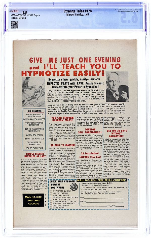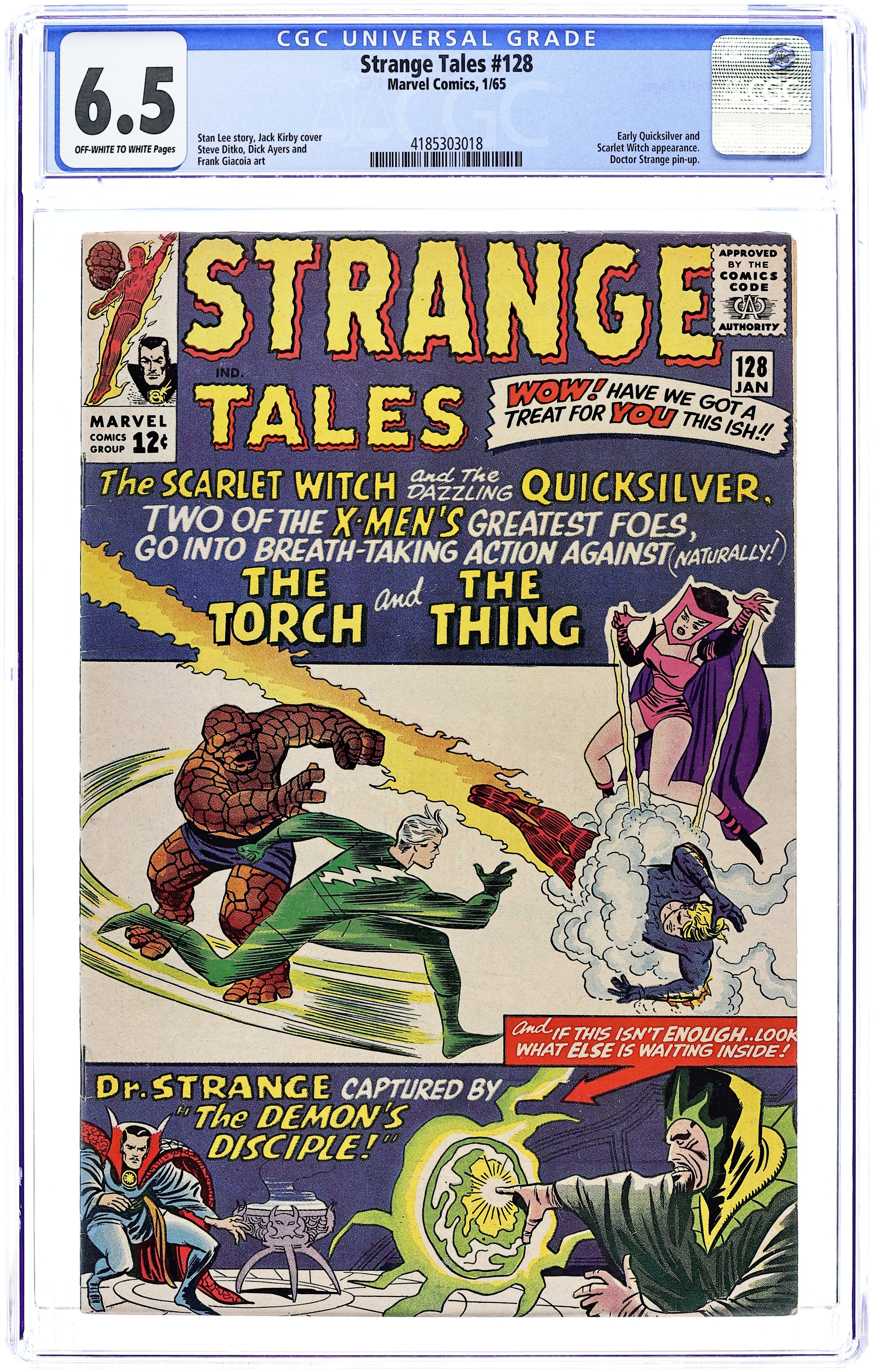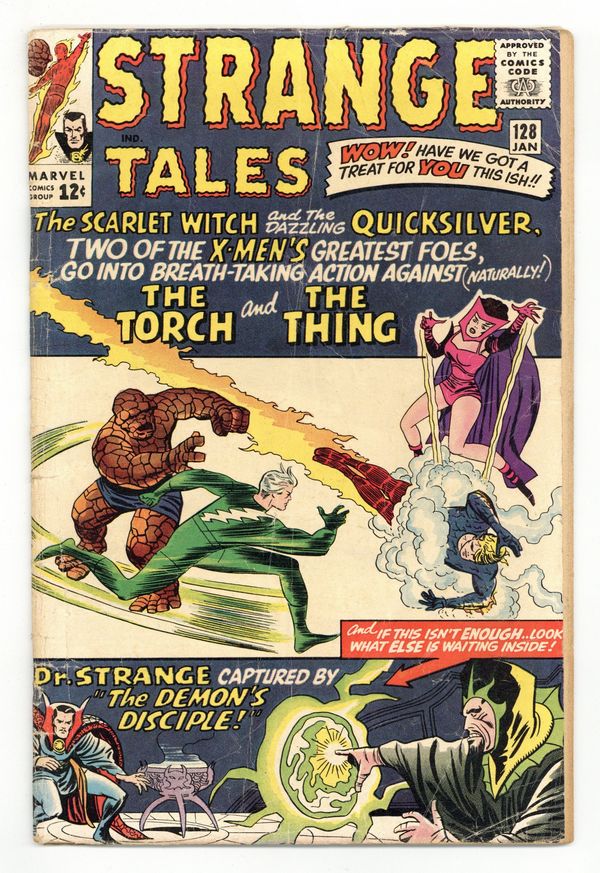 Cover pencils by Jack Kirby, inks by Sol Brodsky. The Human Torch and the Thing guest star in "Quicksilver and the Scarlet Witch," script by Stan Lee and Dick Ayers (co-plot), pencils by Dick Ayers, inks by Frank Giacoia (as Frank Ray); Quicksilver wants to leave Magneto's group but his sister Wanda reminds him that she is in his debt; The Scarlet Witch takes her brother's lead and they seek out the Fantastic Four for advice; They encounter Ben and Johnny at FF headquarters where a misunderstanding turns into a brawl; Cameos by the X-Men (Angel, Cyclops, Marvel Girl, and Iceman), Magneto, the Mastermind, the Blob, and the Yancy Street Gang. Dr. Strange Master of the Mystic Arts illustration by Steve Ditko. "The Demon's Disciple!", script by Steve Ditko (plot, uncredited) and Stan Lee (dialogue), art by Steve Ditko; Dr. Strange receives a desperate plea for help from a man who became a disciple of someone called The Demon, not realizing the seriousness of the situation; The Demon transports the man back to his lair and consigns him to a pit beneath the floor; Strange tracks the man's location and confronts the evil mystic in an epic battle. 36 pgs., full color. Cover price $0.12.
